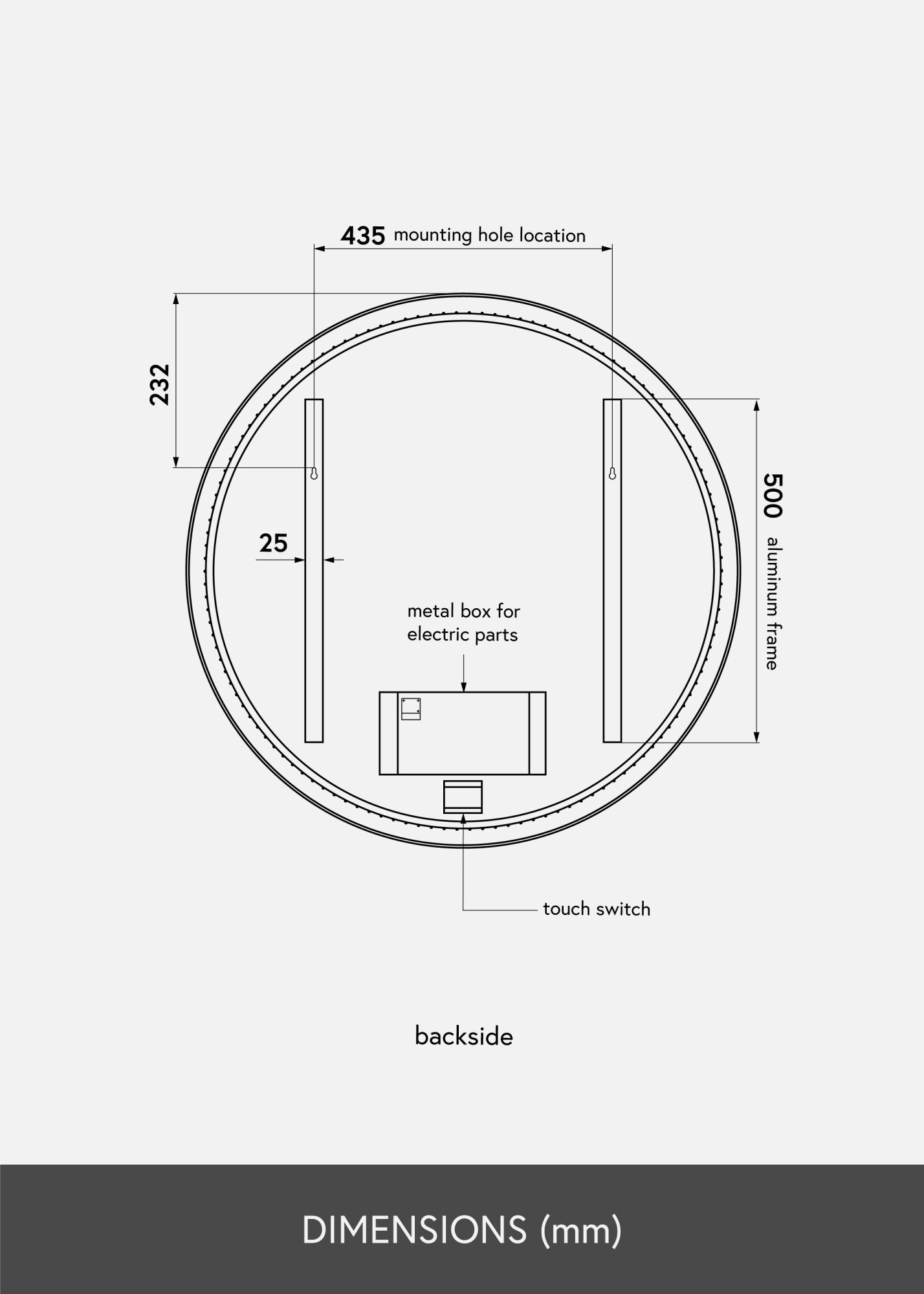 O espelho de parede tem uma superfície de espelho com um diâmetro de 78,5 cm. É destinado à instalação fixa e é conectado a um interruptor de energia. Para que o espelho funcione corretamente, ele deve ser conectado a um interruptor de energia comum, não a um interruptor de regulador.
