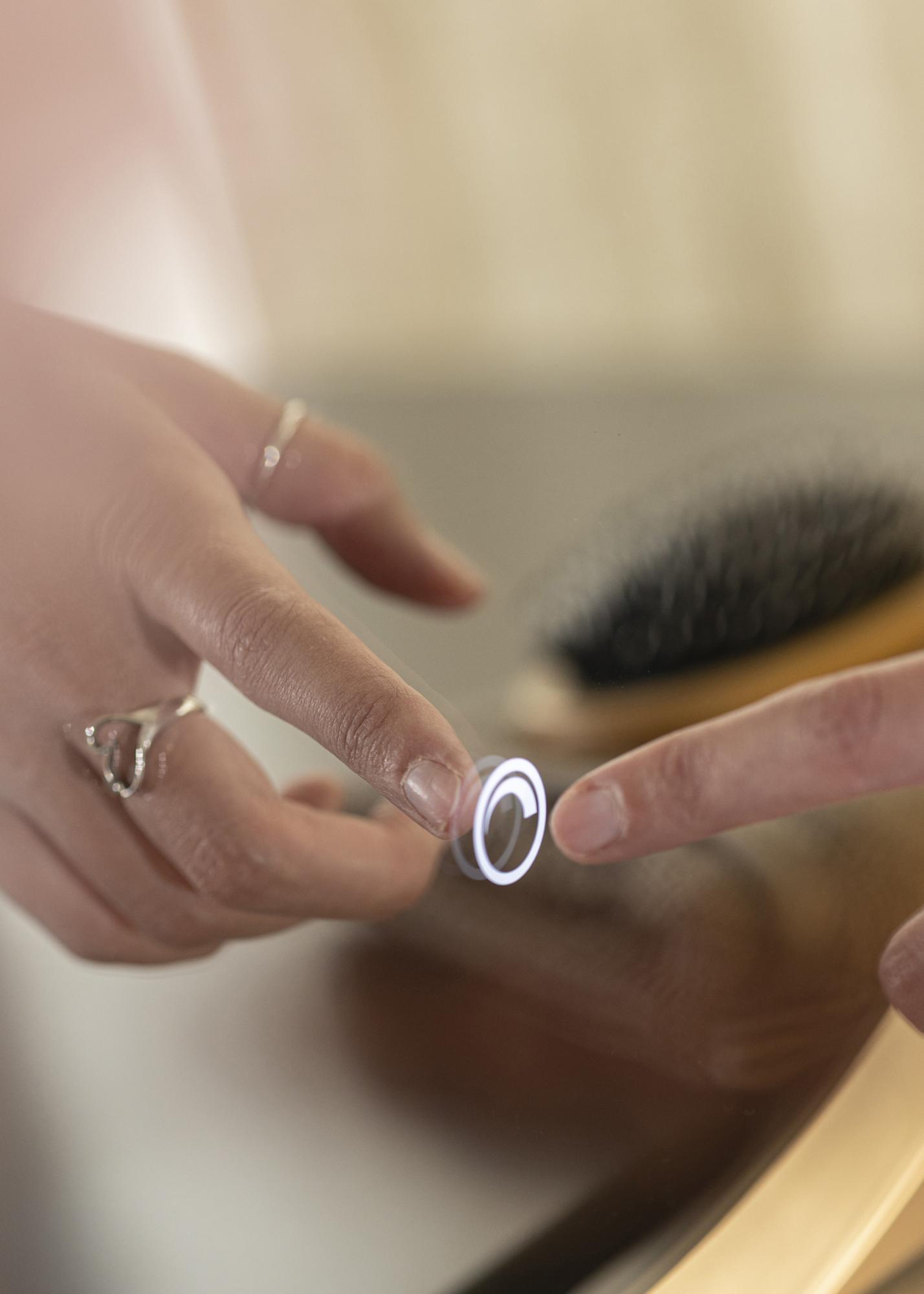 A luz tem um brilho agradável que pode facilmente ajustar. Para ajustar a intensidade da luz, mantenha pressionado o botão tátil na borda inferior do espelho por alguns segundos. O espelho é destinado à instalação fixa e deve ser instalado por um eletricista. Para que o espelho funcione corretamente, ele deve ser conectado a um interruptor de luz comum, não a um interruptor de luz com regulador.