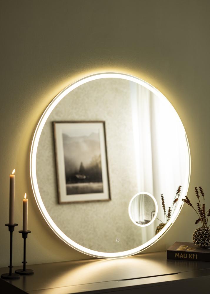 Está à procura de um espelho de casa de banho elegante com iluminação LED integrada e zoom? Então este é o espelho para si! O espelho tem uma forma redonda clássica e uma faixa de LED ao longo das bordas da superfície do espelho. Ele é equipado com vidro de espelho comum e num espelho mais pequeno com zoom de 3x, também com iluminação LED que enquadra a superfície do espelho. A luz tem um brilho agradável em 3000K que pode facilmente ajustar de 10-100% de intensidade luminosa. Para ajustar a intensidade luminosa, mantenha pressionado o botão tátil na borda inferior do espelho por alguns segundos.