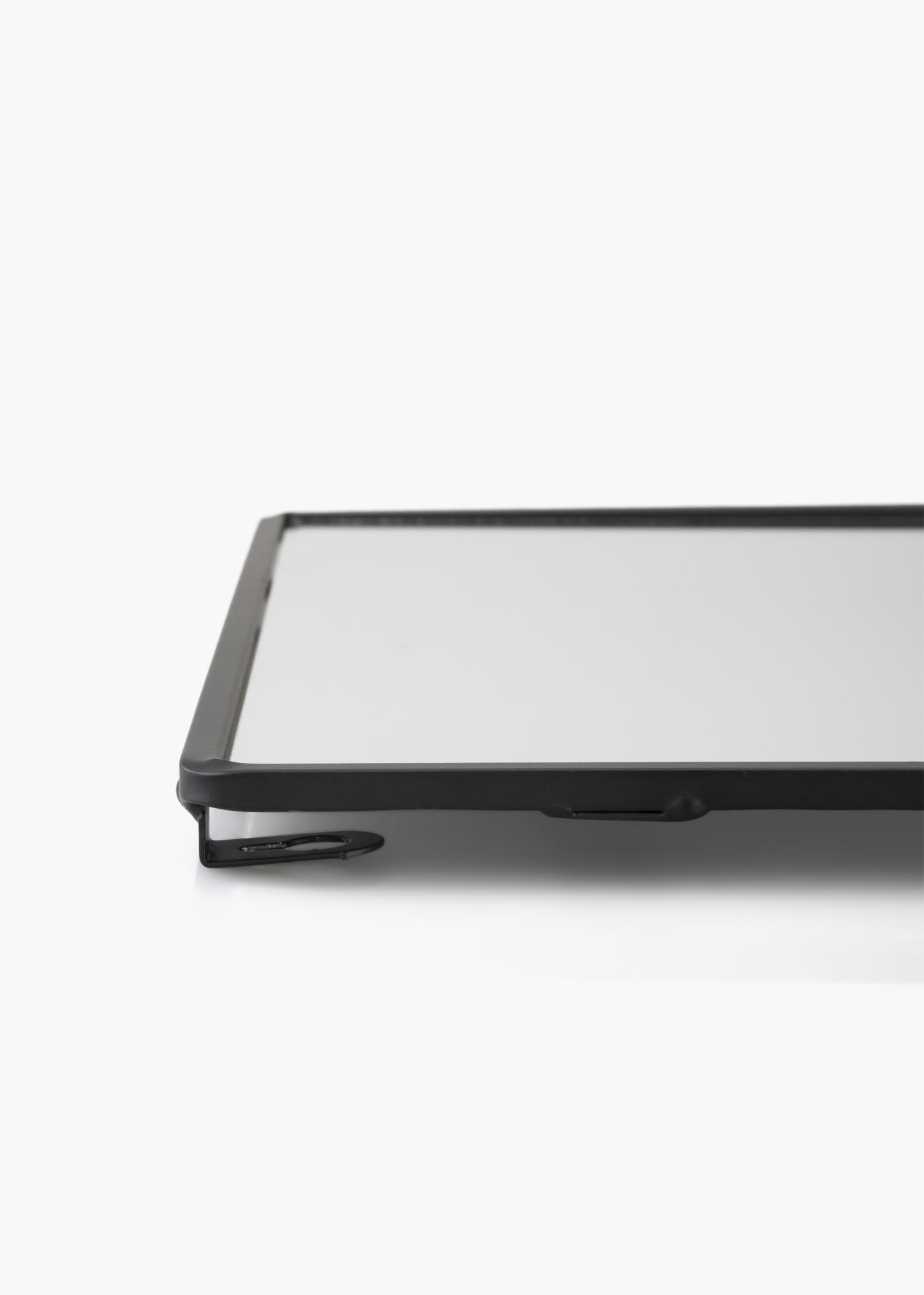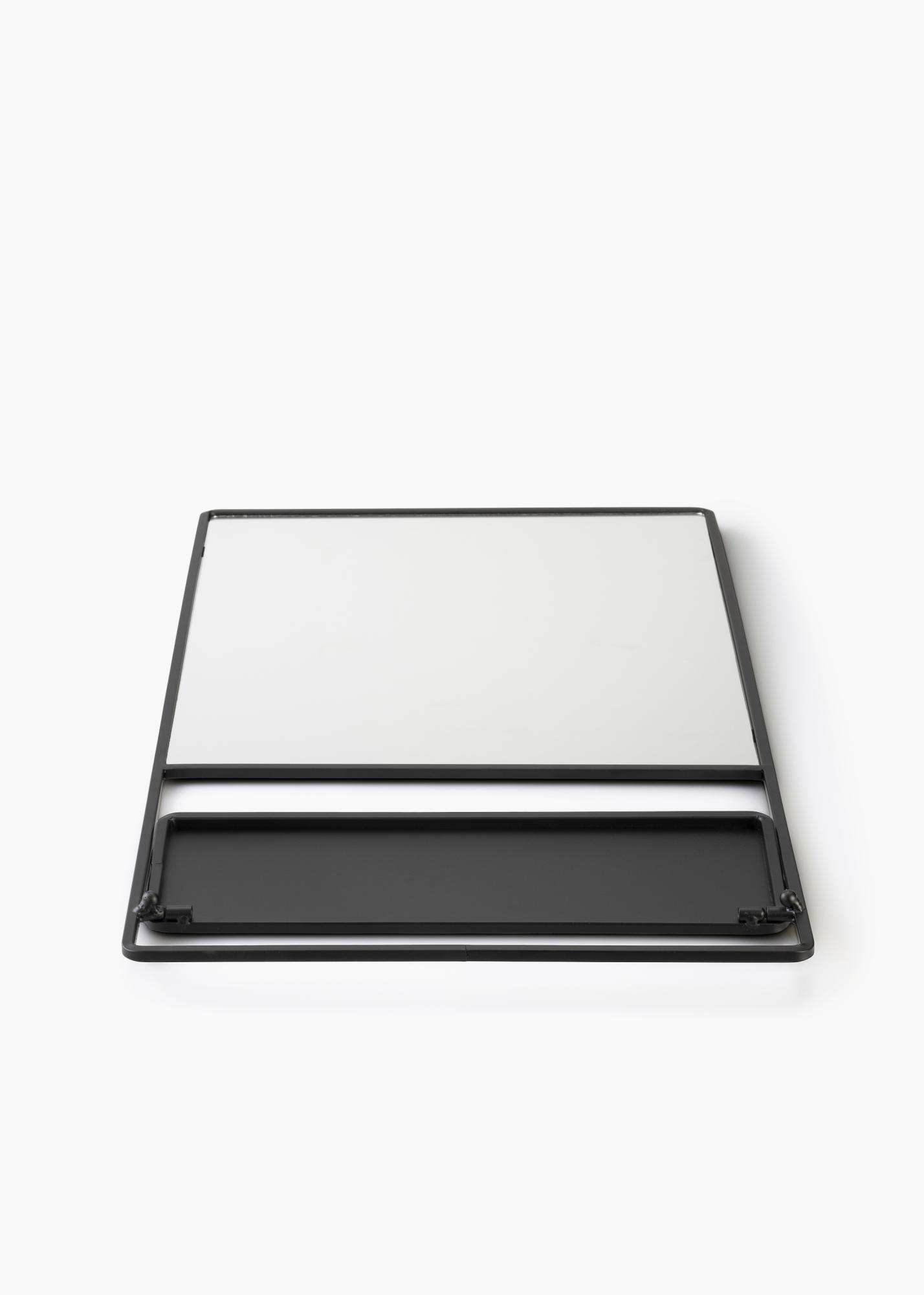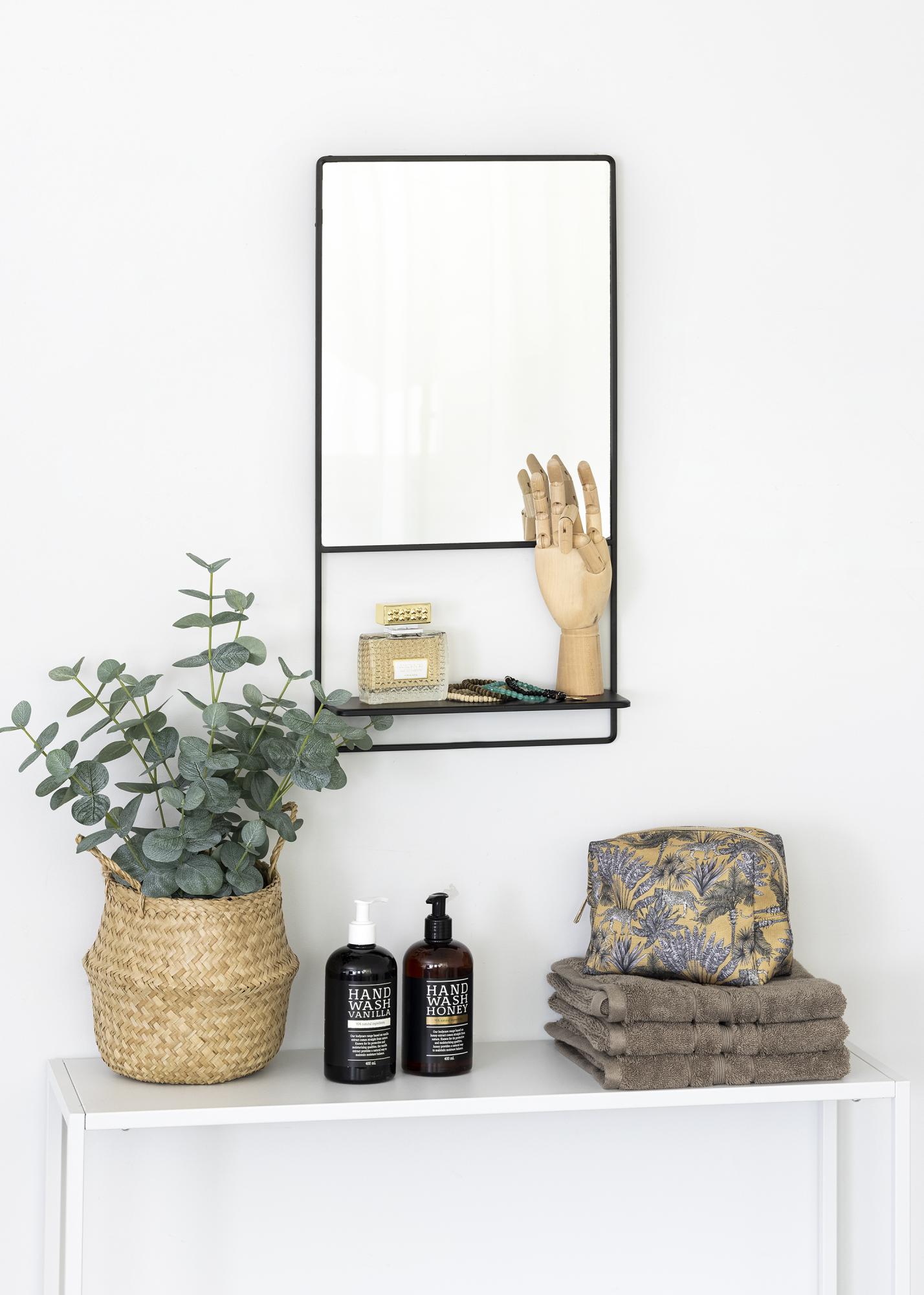 Este elegante espelho de parede com prateleira é um design sueco da KAILA. O espelho é de cor preta e feito de metal. A superfície do espelho é retangular e é enquadrada por uma borda de metal preta. Na parte inferior, há uma prateleira - perfeita para colocar decorações bonitas ou guardar um pouco de maquilhagem! O espelho mede 31x60 cm e possui suporte de parede.