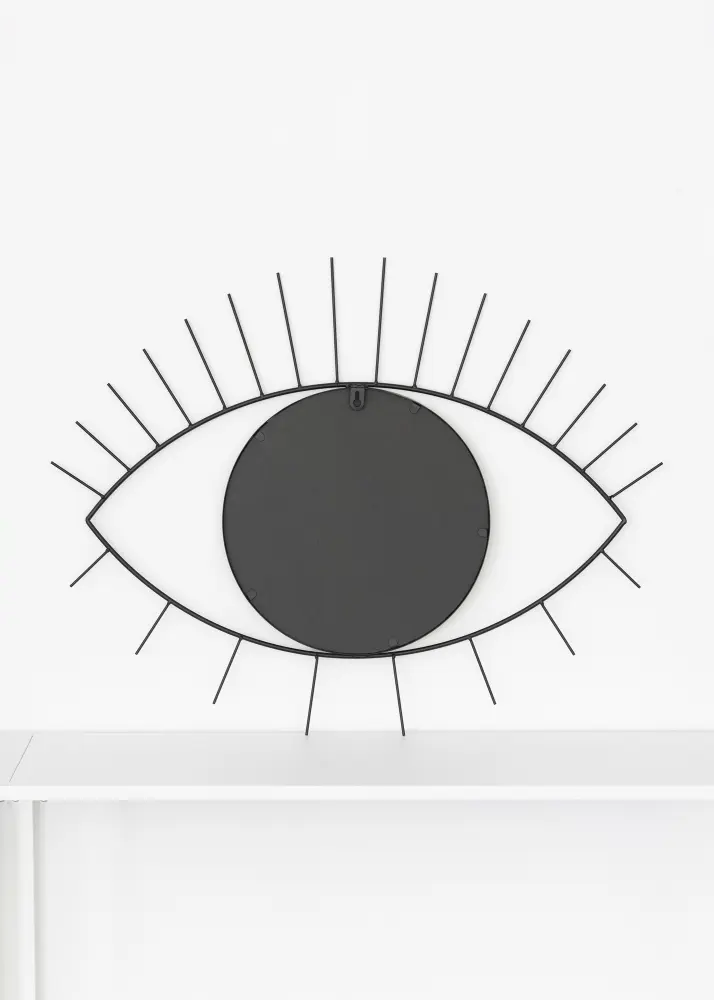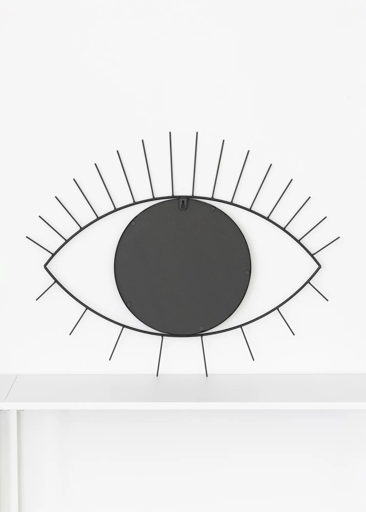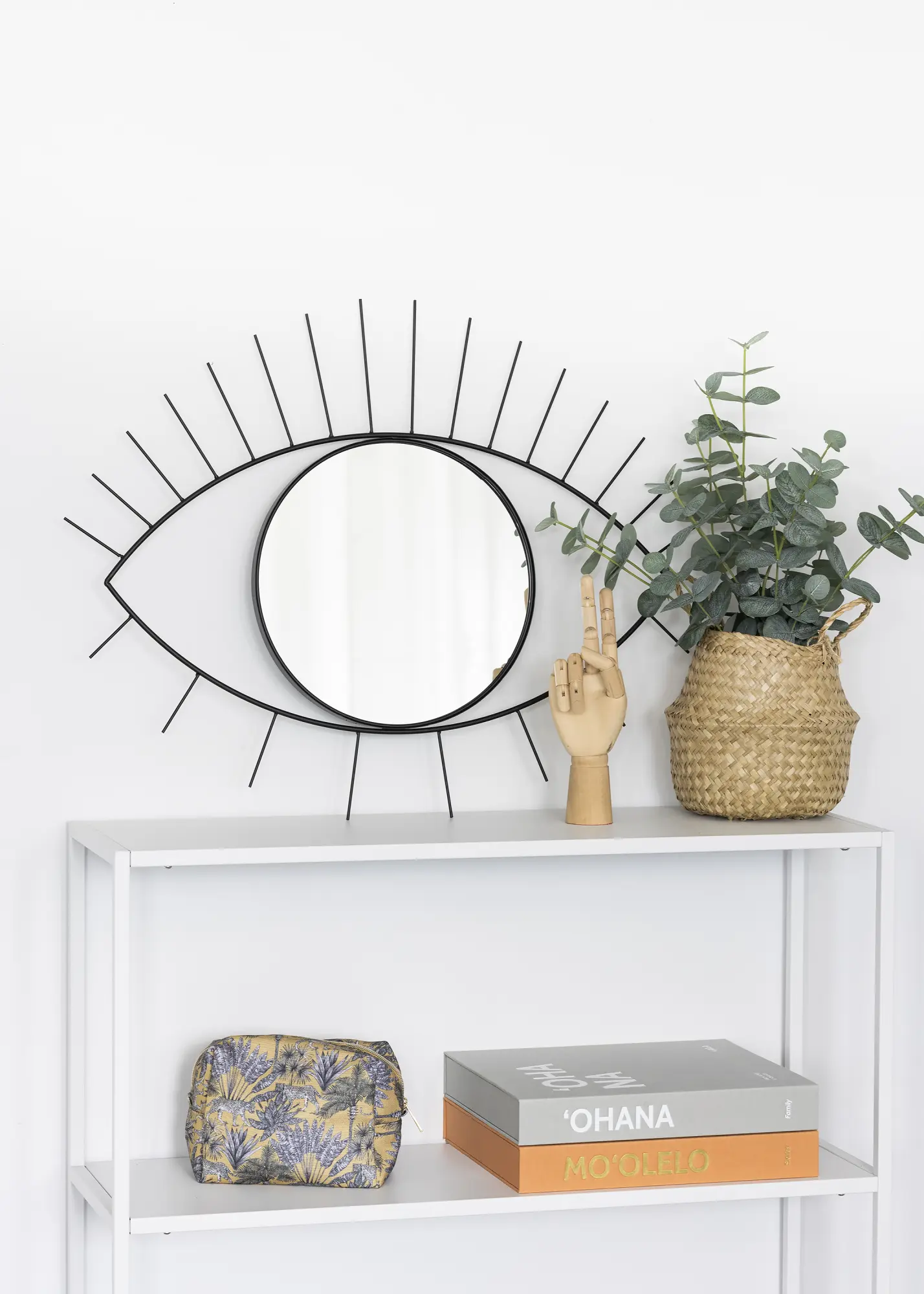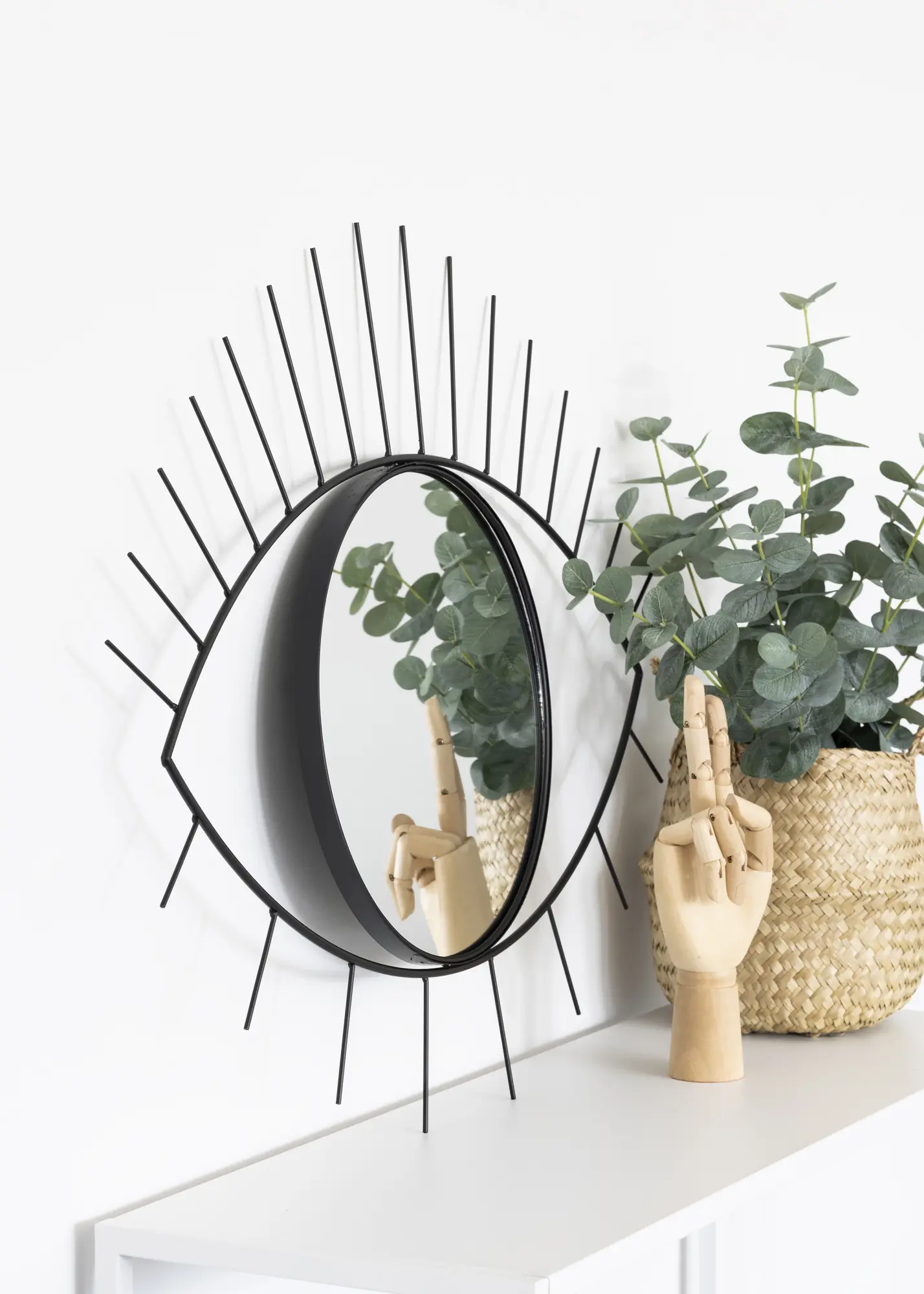 Esta é realmente uma moldura de espelho num design único que vai chamar a atenção em sua casa! Este espelho tem um design que imita um olho e cílios metálicos ao redor. O espelho tem um tom preto elegante e mede 55x70 cm. O espelho tem uma sensação boêmia e pode ser combinado com quadros e outras decorações de parede para uma aparência elegante e completa.