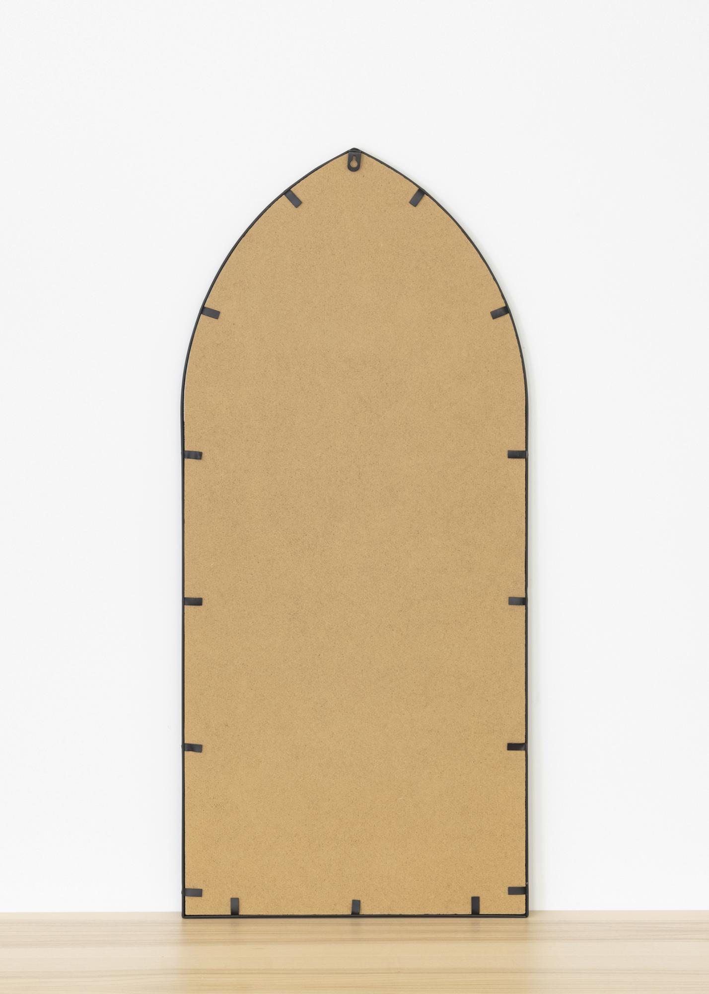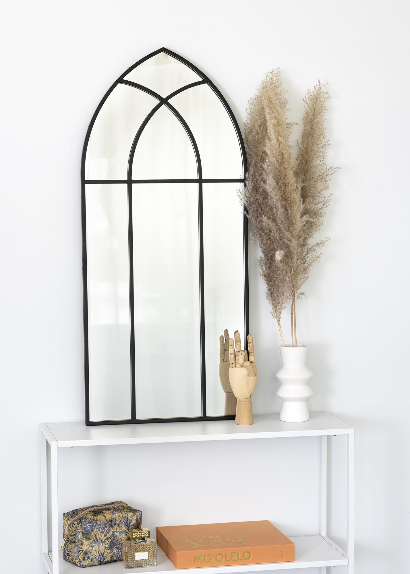 Esta é uma espelho muito decorativo que imediatamente cria uma atmosfera mais romântica para o quarto onde é colocado! O espelho tem um design que lembra uma janela de jardim e ao mesmo tempo um pouco de caráter gótico. A forma emocionante do espelho fará dele um destaque na sua casa! O espelho mede 45x100 e tem um padrão decorativo de linhas finas pretas em metal.