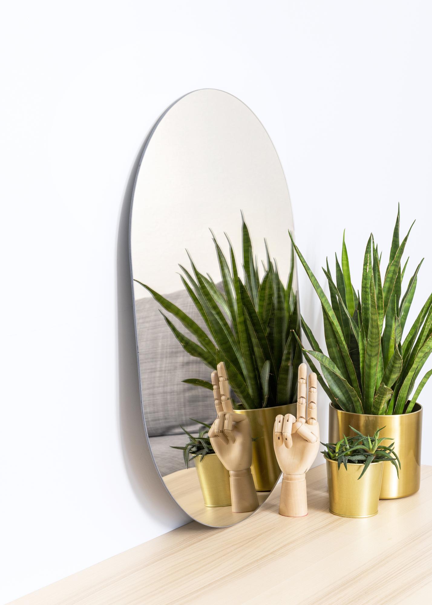 Com um espelho oval como este, cria uma atmosfera suave e convidativa em sua casa. Este espelho tem apenas 4 mm de espessura, o que, combinado com a forma suave, resulta num espelho de parede muito elegante. É um espelho com um design tão moderno quanto atemporal, e, portanto, adequado tanto para decorações de casa modernas quanto clássicas.