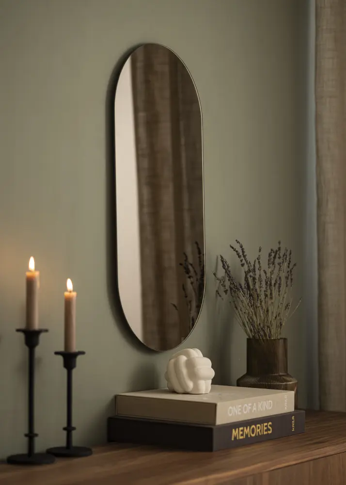 Um espelho oval proporciona uma impressão suave e elegante na sua casa. Este espelho oval em particular possui um vidro espelhado tonalizado em um elegante tom de bronze escuro. Esse detalhe impactante e moderno combina com um design elegante, já que o espelho é muito fino e não possui moldura. O resultado é um detalhe de decoração moderno, elegante e chamativo para ser colocado em qualquer divisão onde queira adicionar funcionalidade e design sueco moderno!