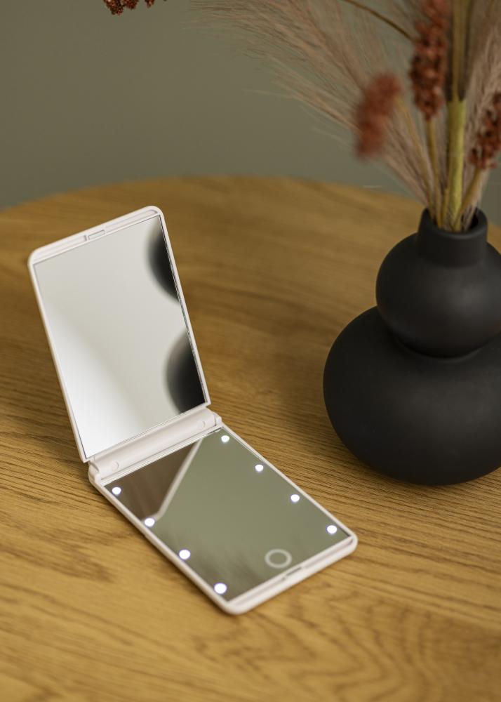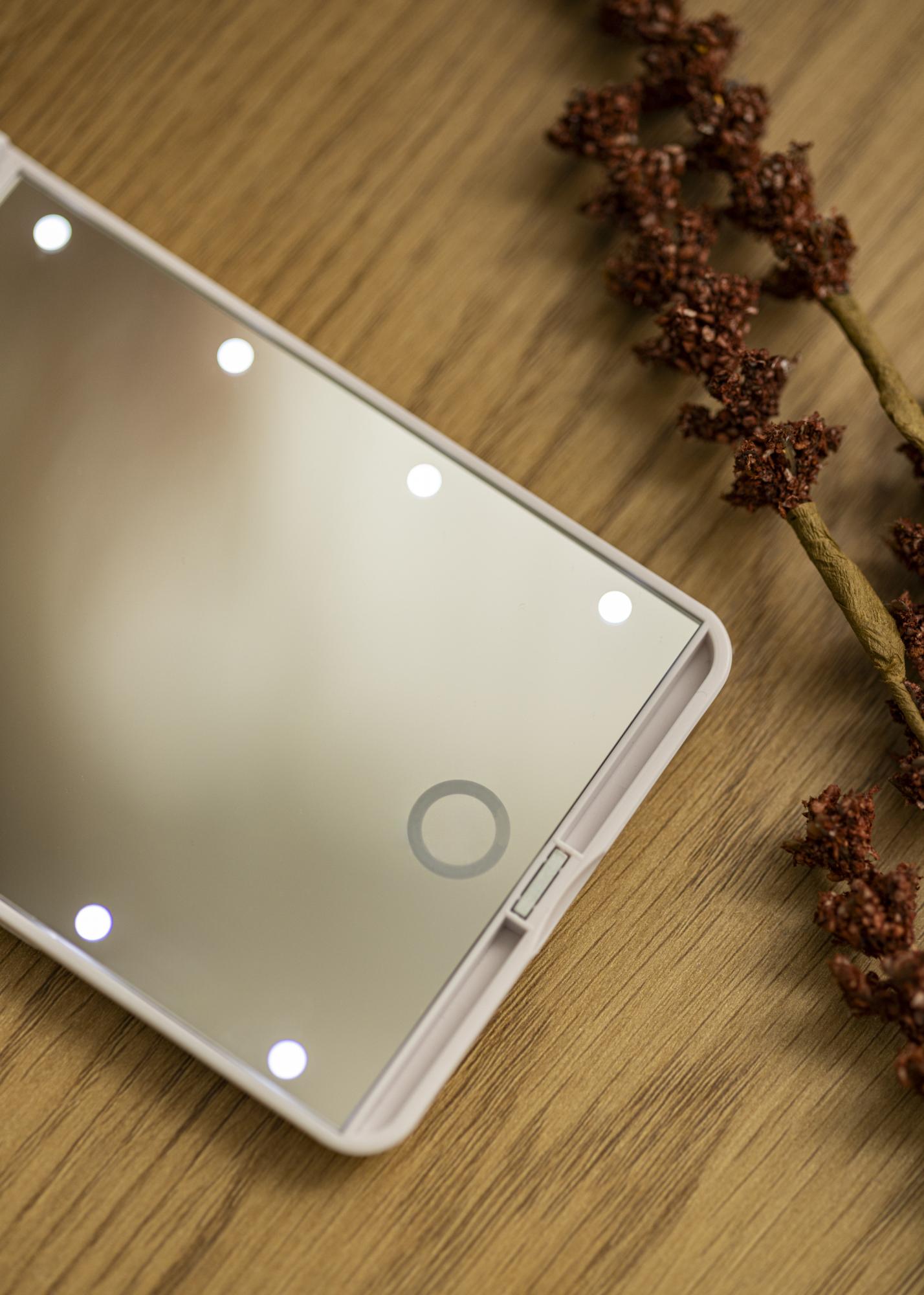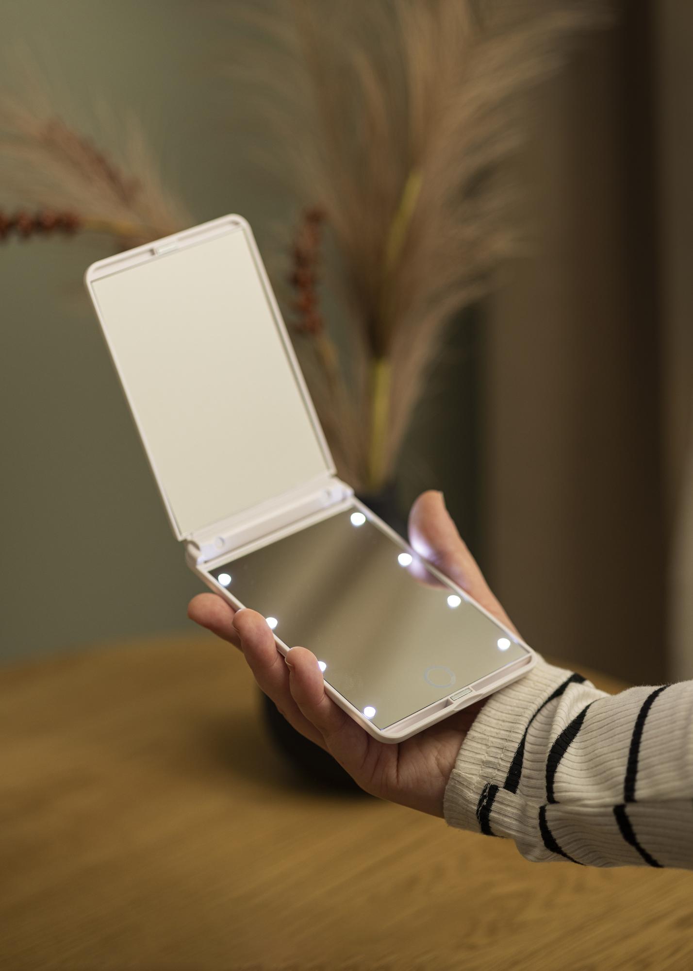 O espelho portátil mede 12x8 cm e pesa apenas 136 gramas, o que torna fácil guardar o espelho para toucador no bolso, na mala ou na nécessaire. O vidro zoom juntamente com a superfície iluminada tornam este espelho perfeito para um close-up ao arrancar as sobrancelhas ou melhorar a maquilhagem!