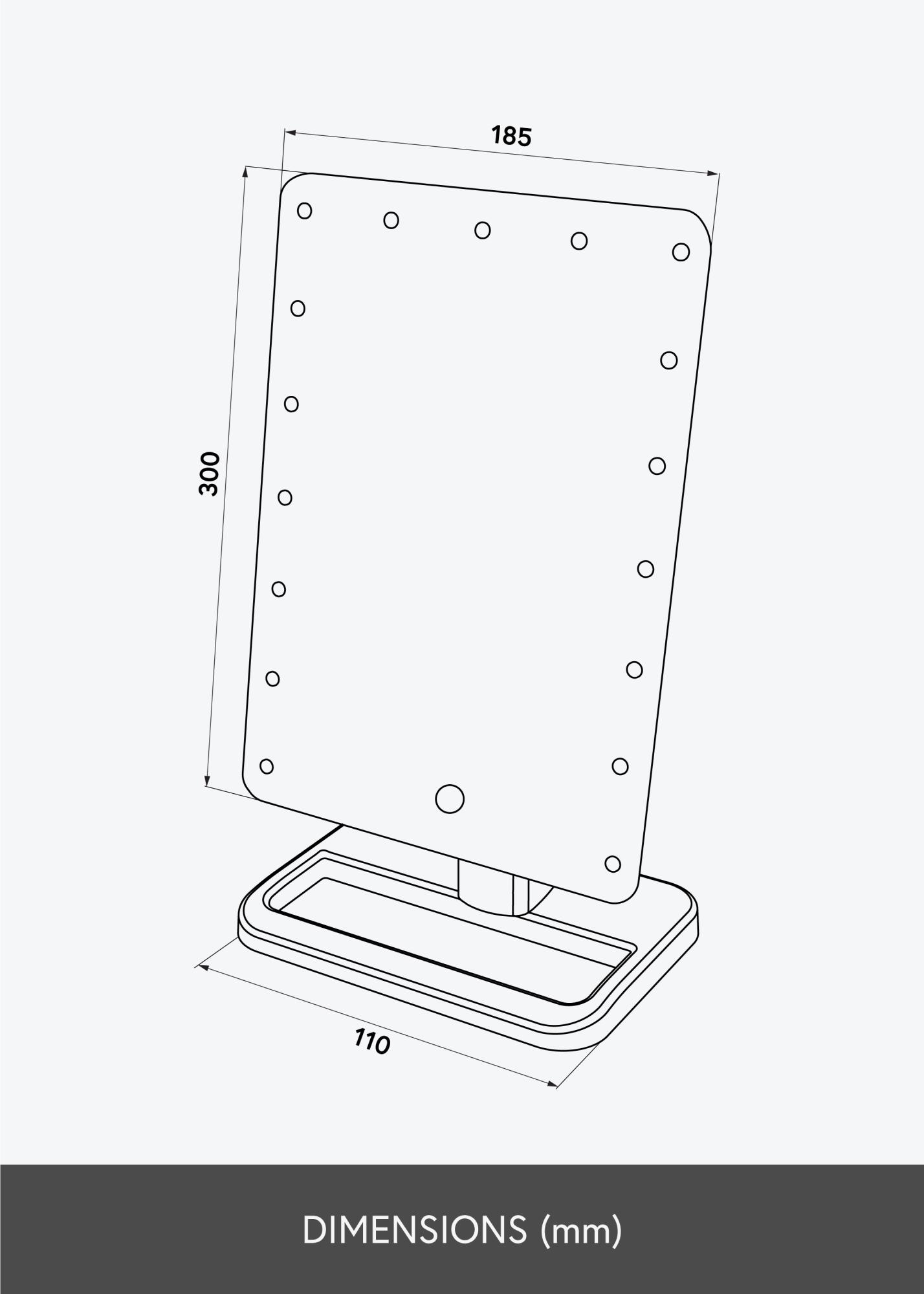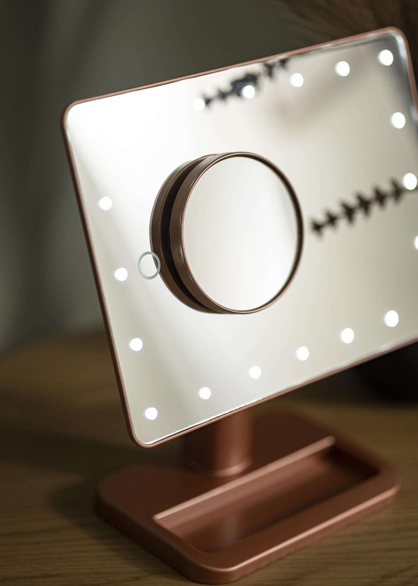 Este é o espelho para toucador para aqueles que desejam ter um espelho elegante com um design flexível. Ele é colocado em pé, o que permite que mova facilmente o espelho pela casa ou leve-o consigo quando estiver viajando. A superfície do espelho, que mede 16,5x25 cm, pode ser inclinada para facilitar a aplicação da maquilhagem da maneira que desejar. Um espelho mais pequeno com zoom de 10x está incluído e pode ser fixado na superfície do espelho principal.
