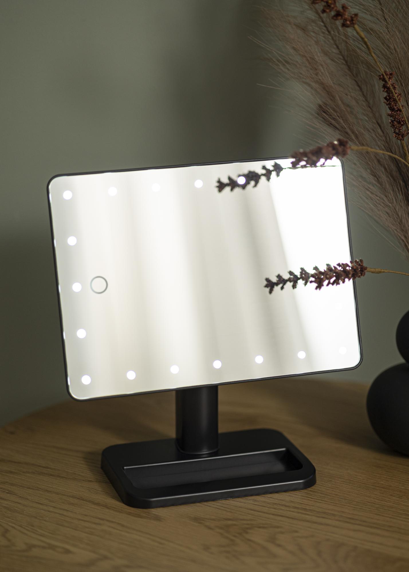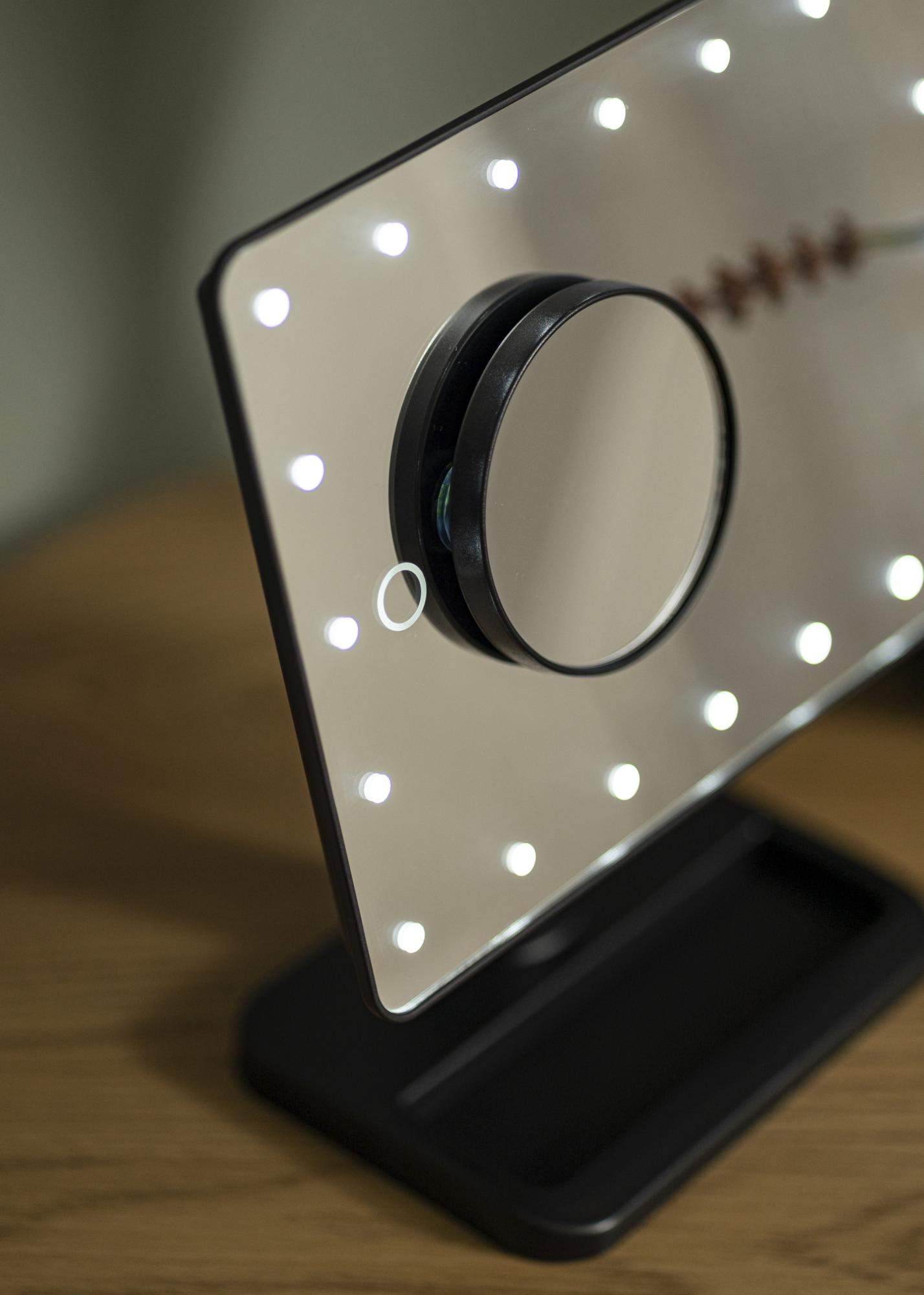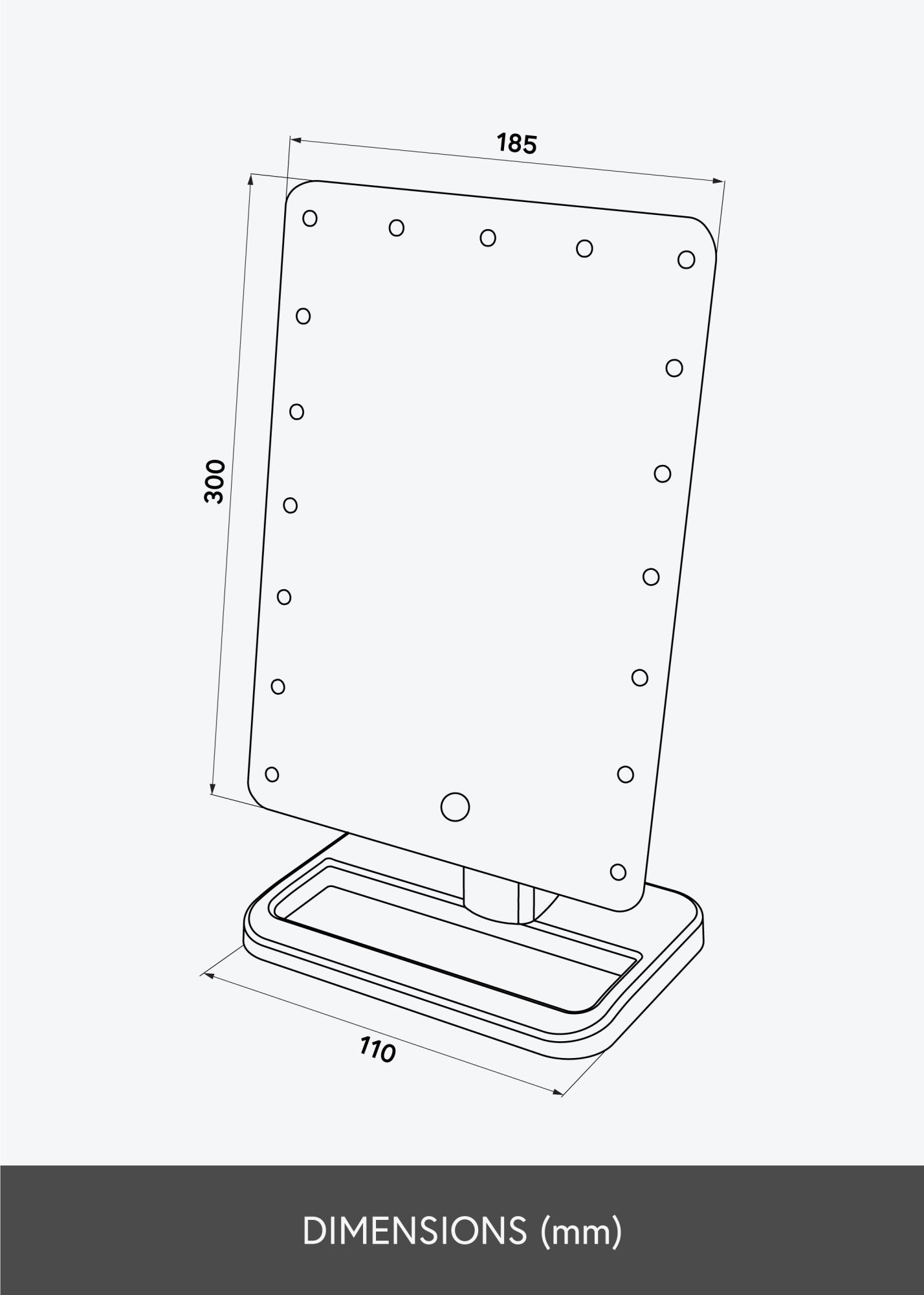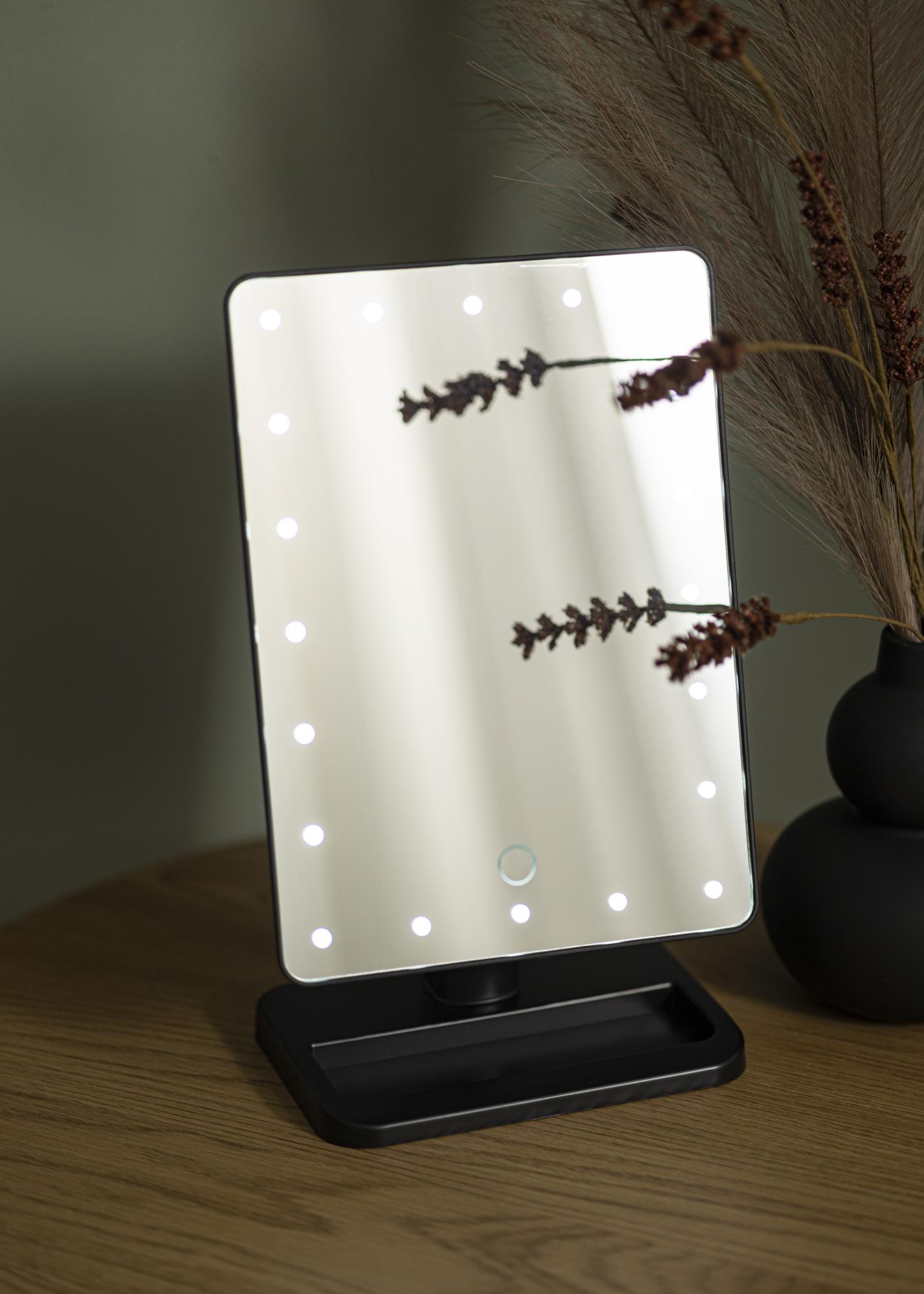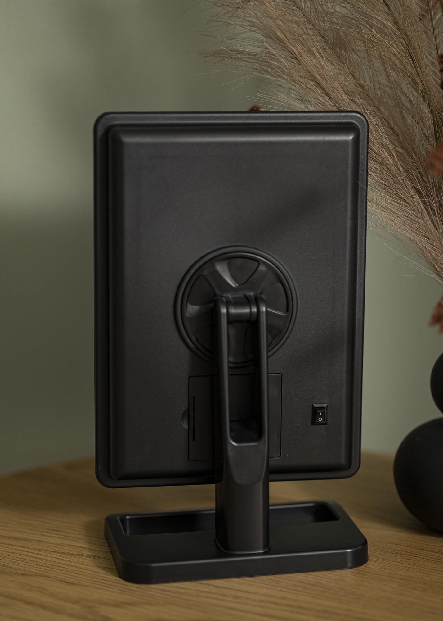 Design compacto, aparência elegante e iluminação uniforme - Foot Preto oferece tudo o que deseja num espelho para toucador! A superfície do espelho, de 16,5x25 cm, é cercada por iluminação LED, que é uma lâmpada econômica e de longa duração. O espelho é ligado através de um botão na parte de trás. Pode ajustar o brilho da luz branca fria segurando o botão tátil na frente do espelho por alguns segundos.