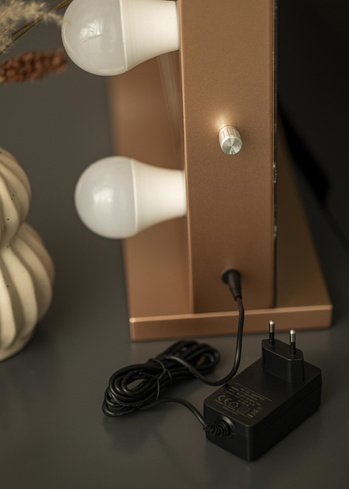 A moldura em dourado rosa é combinada com uma base na mesma tonalidade elegante, o que torna este espelho um detalhe de decoração perfeito tanto para mesas como para cómodas. Se preferir pendurar o espelho na parede, utilizando os suportes de parede na parte de trás, pode remover a base. A ligação elétrica é feita através de uma ficha.