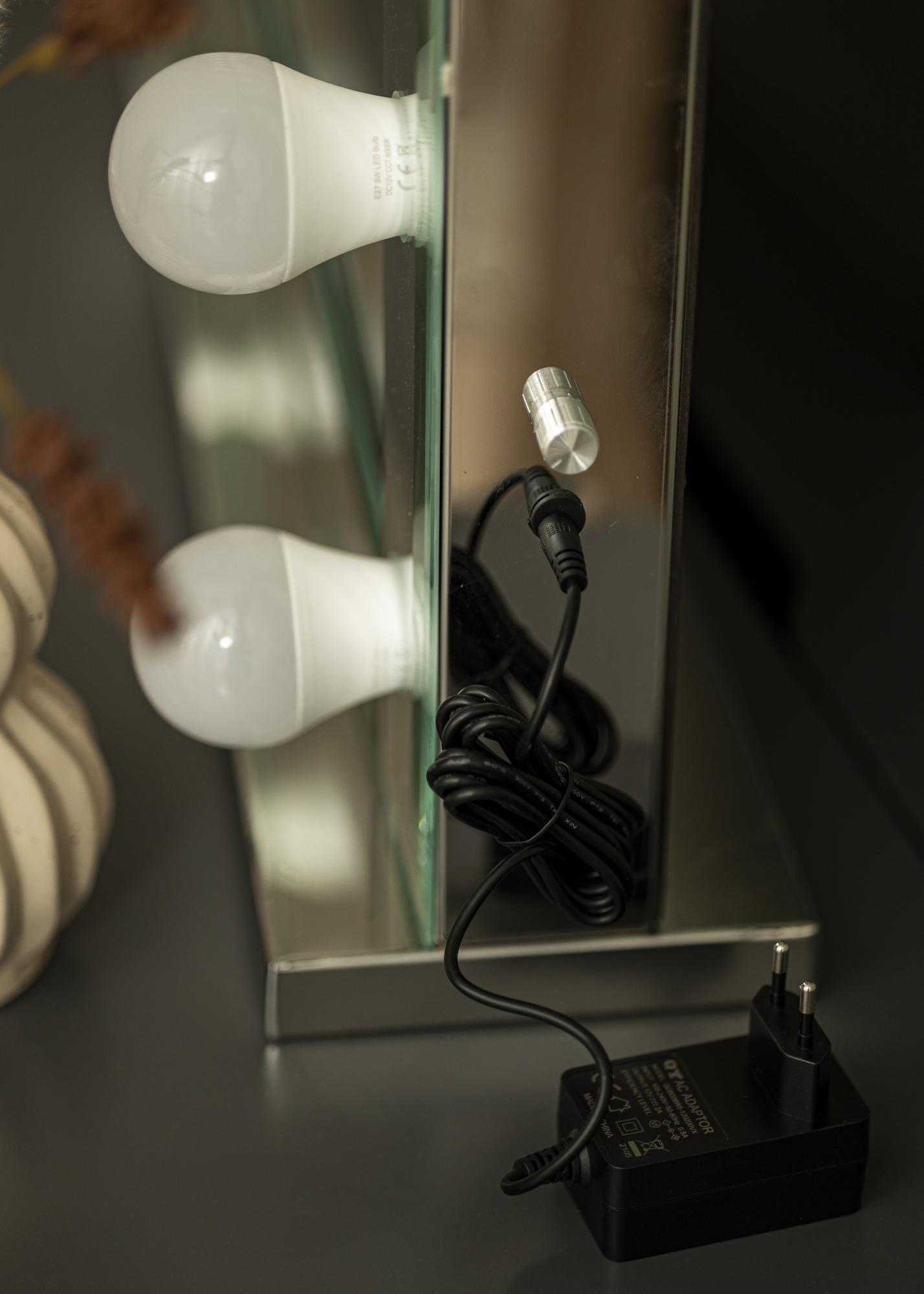 Adicione um toque de luxo à sua casa com este espelho para toucador no estilo Hollywood. O espelho possui uma moldura prateada decorada com 14 lâmpadas, o que confere ao espelho uma expressão luxuosa. As lâmpadas são substituíveis e possuem soquete E27. As lâmpadas emitem uma luz branca fria. Se desejar, pode optar por ajustar a iluminação para uma intensidade que se adapte ao seu propósito - uma iluminação clara é perfeita para se maquiar, enquanto uma luz mais suave é preferível como iluminação de fundo. Esse ajuste é feito facilmente através de um pequeno botão giratório na lateral do espelho.