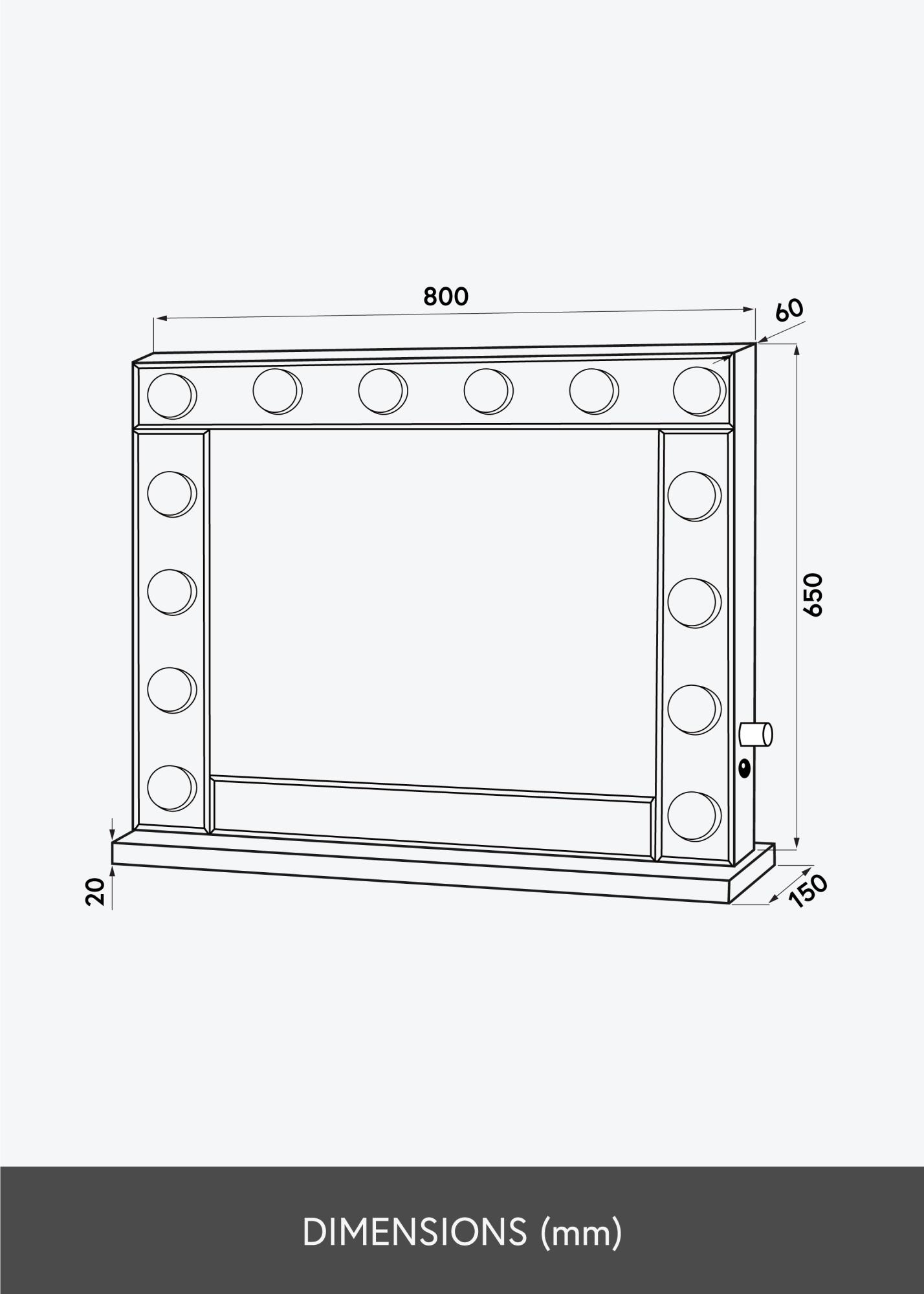 O espelho tnum formato grande, com uma superfície de espelho de 80x65 cm. O suporte pode ser montado e desmontado, para que possa escolher se deseja que o espelho fique em pé ou pendurado na parede. A Ligação elétrica é feita através de um plugue.