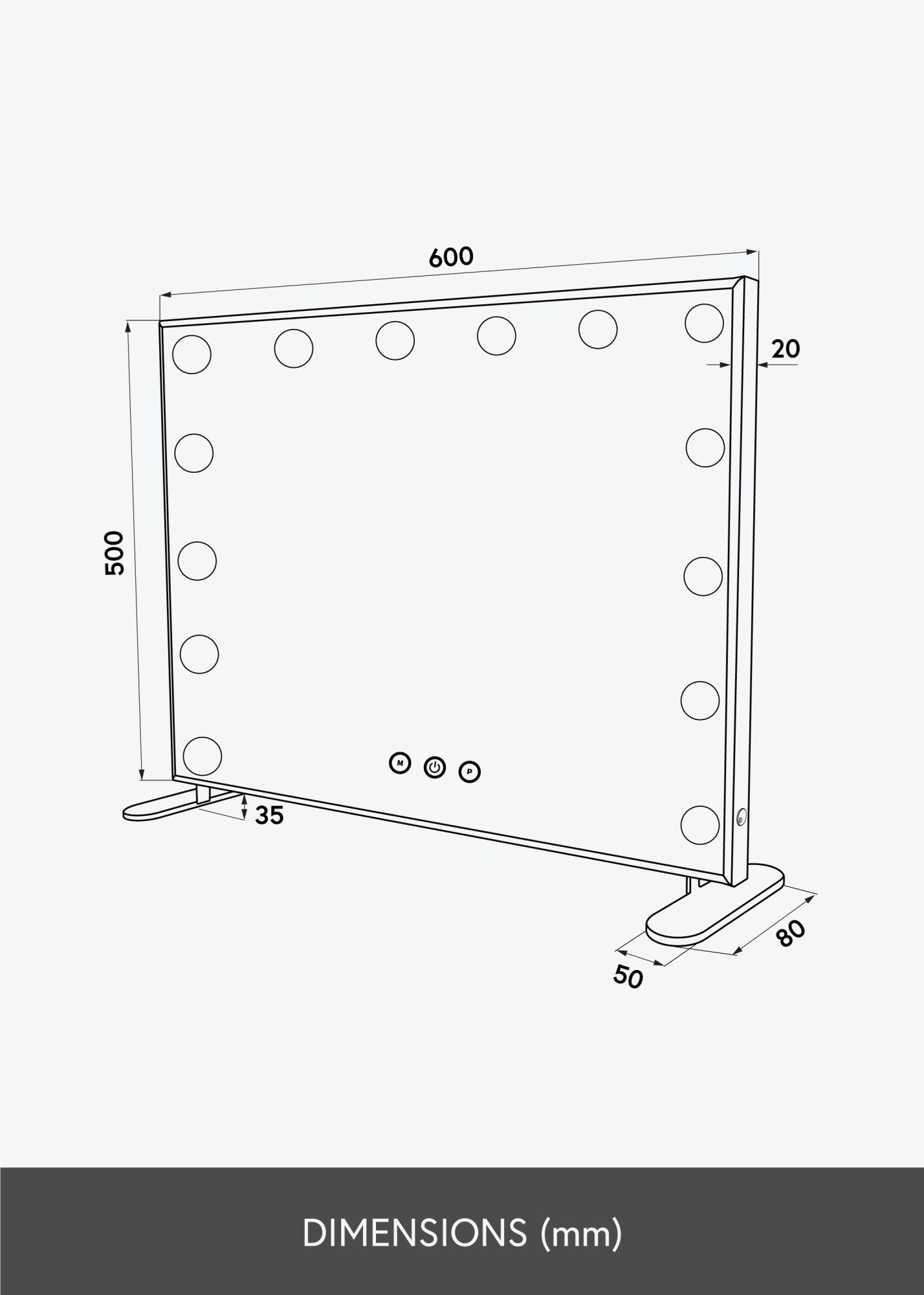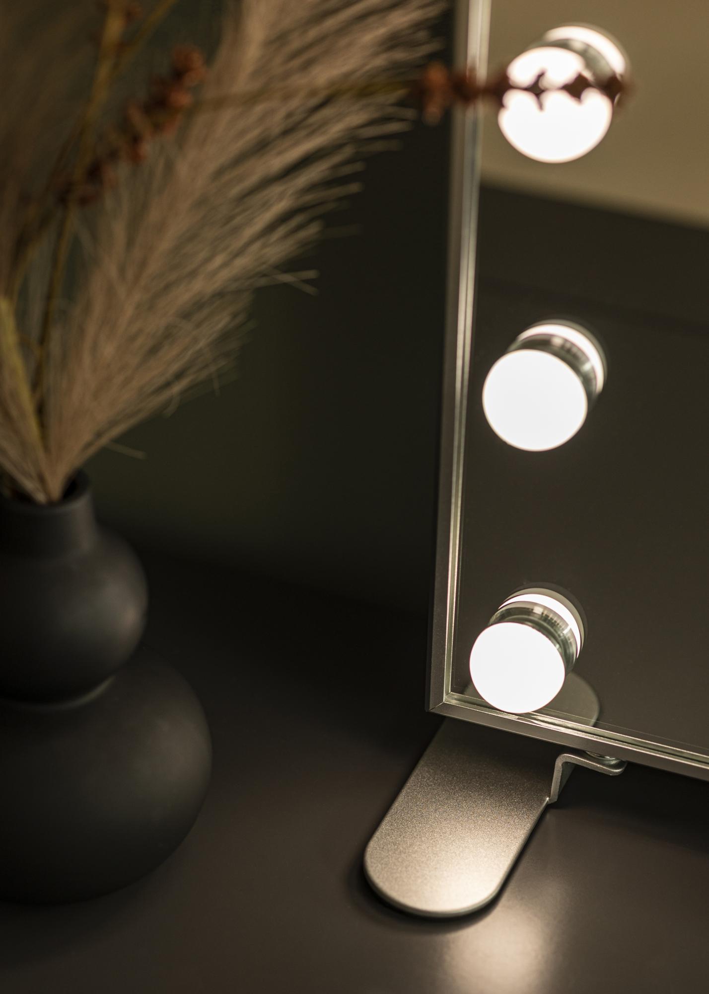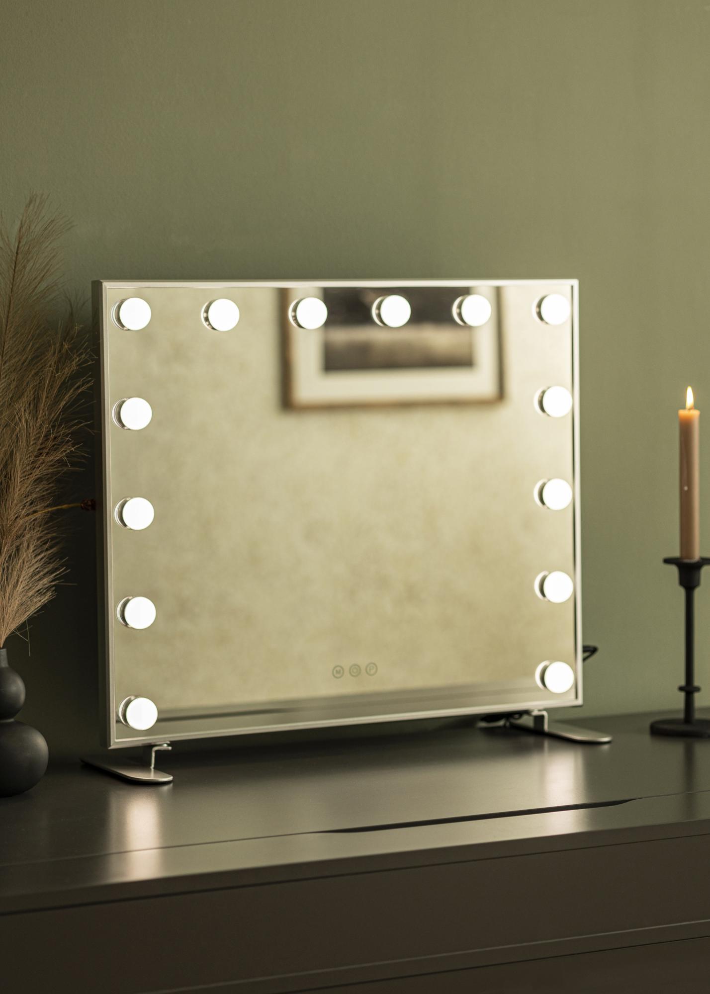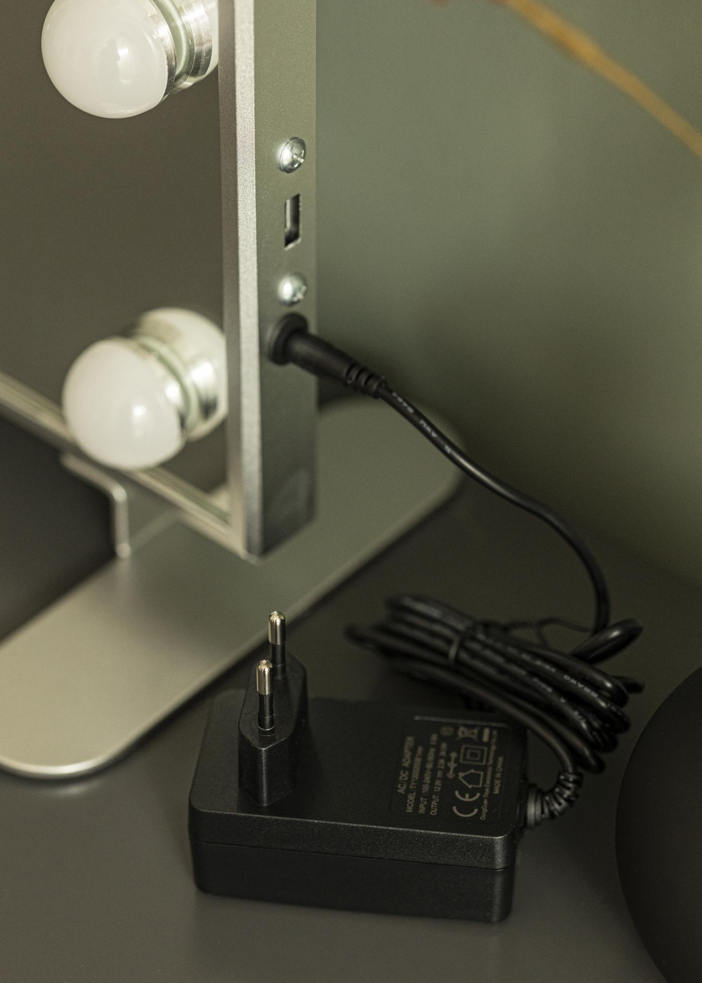 Esta é uma elegante espelho para toucador que vai tornar-se um belo detalhe de decoração em todas as divisões da casa. A fina moldura prateada que envolve a superfície do espelho de 60x50 cm proporciona uma expressão muito elegante, ao mesmo tempo que as 14 lâmpadas LED arredondadas colocadas ao redor das bordas do espelho proporcionam uma sensação exclusiva. Num dos lados do espelho, há uma porta USB que permite carregar seus dispositivos inteligentes através da conexão USB.