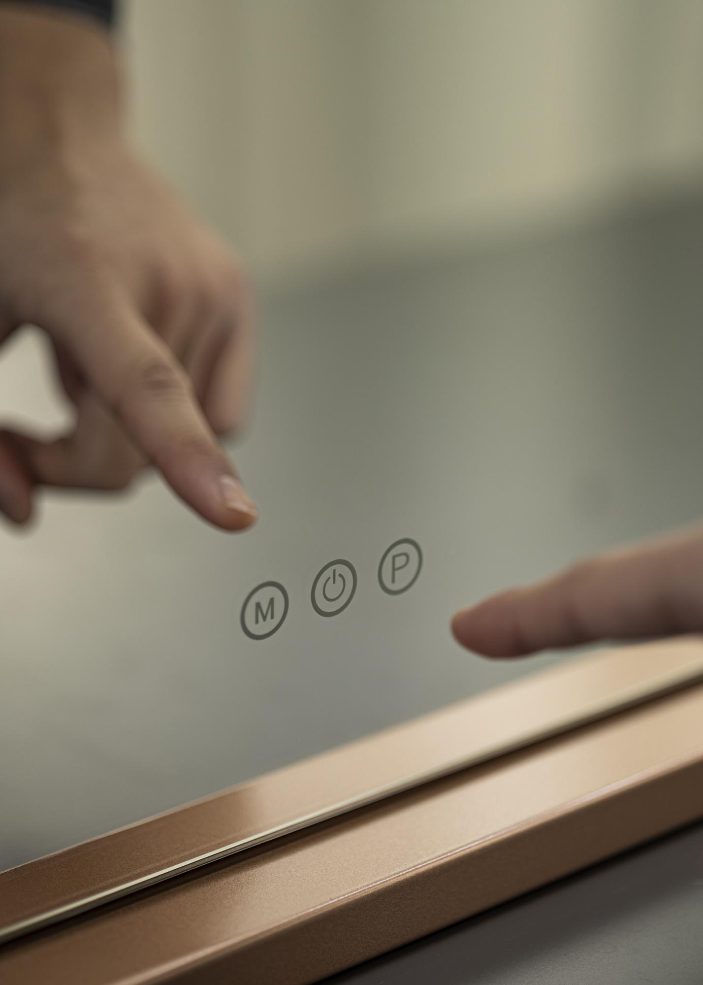 A superfície do espelho para toucador mede 58x46 cm e na parte inferior da superfície do espelho existem três botões de toque. Um para ligar e desligar a iluminação e dois para ajustar as configurações de luz. Ao pressionar o botão "M", podes ajustar a temperatura de cor da luz e com o botão "P" podes facilmente ajustar o brilho da iluminação para a intensidade desejada. A ligação elétrica é feita através de uma ficha.