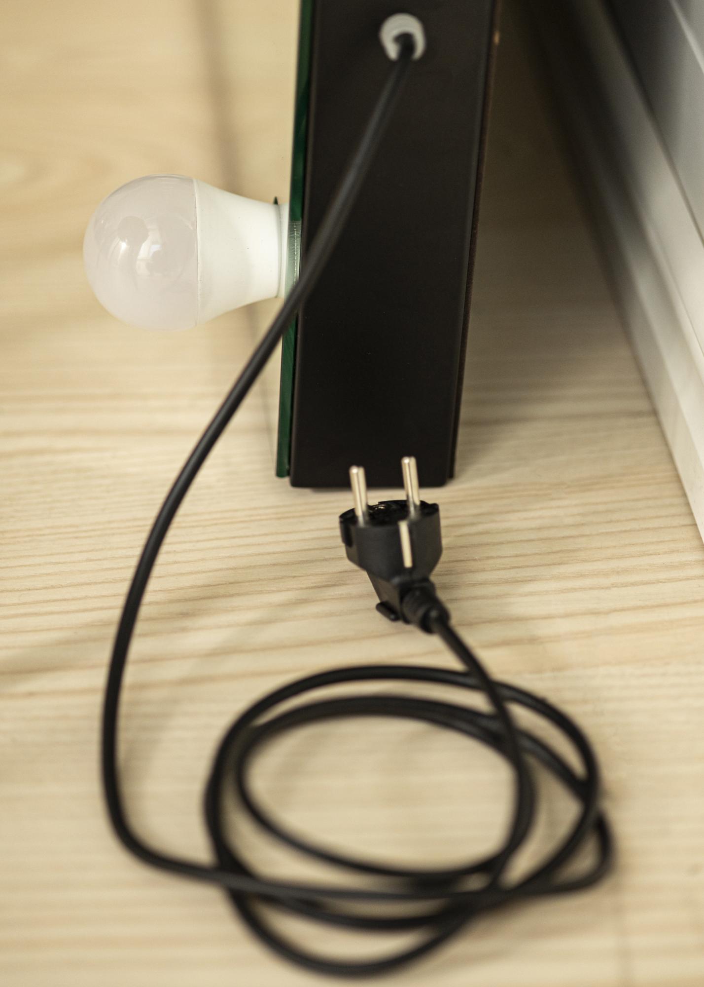 Este espelho possui iluminação integrada na forma de 20 lâmpadas que emitem uma luz branca fria. As lâmpadas têm soquete E27 e podem ser substituídas, se necessário. Pode facilmente ajustar a intensidade da iluminação para um brilho que lhe agrade, girando o pequeno botão de ajuste na borda do espelho. A Ligação elétrica é feita por meio de uma tomada.