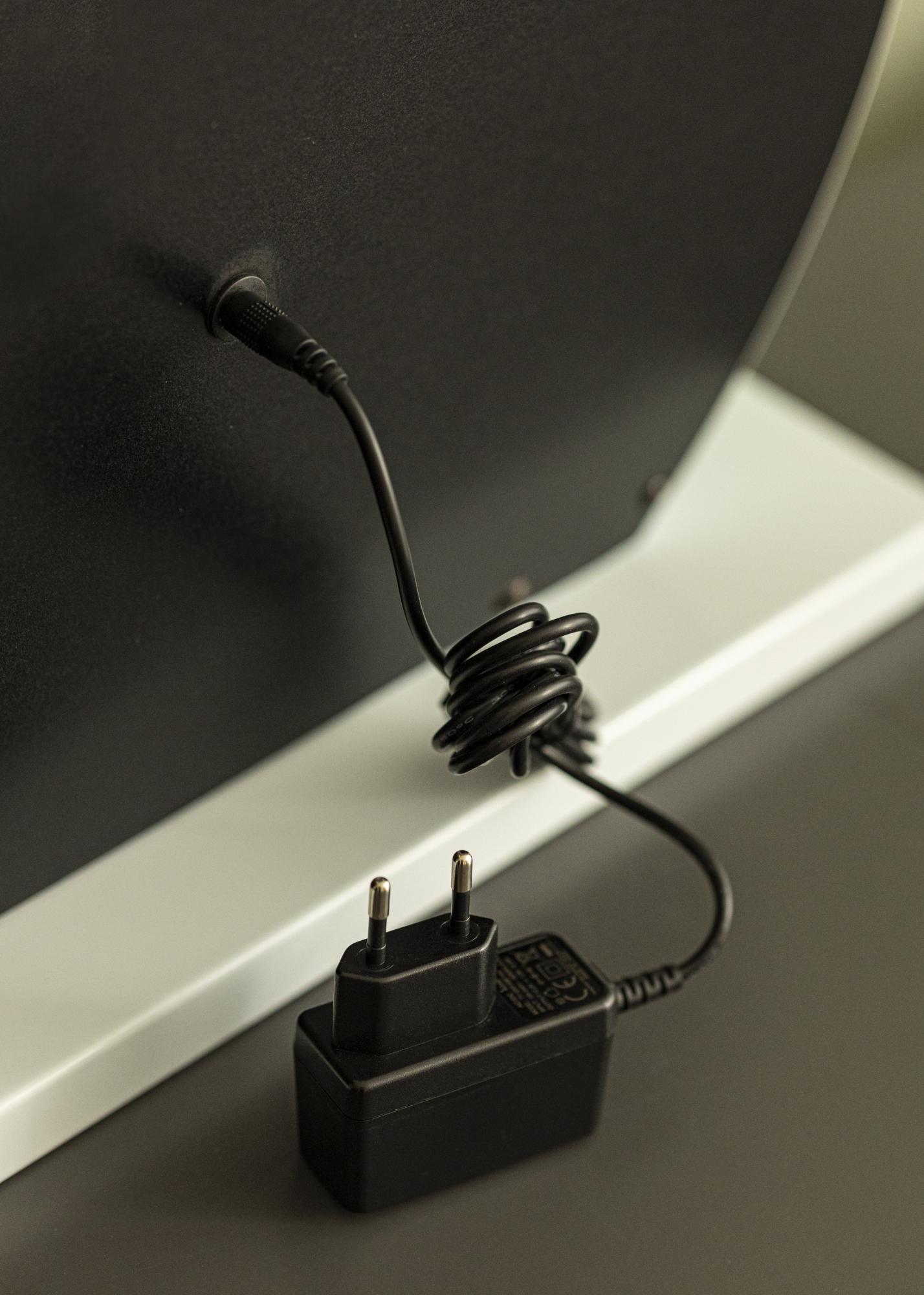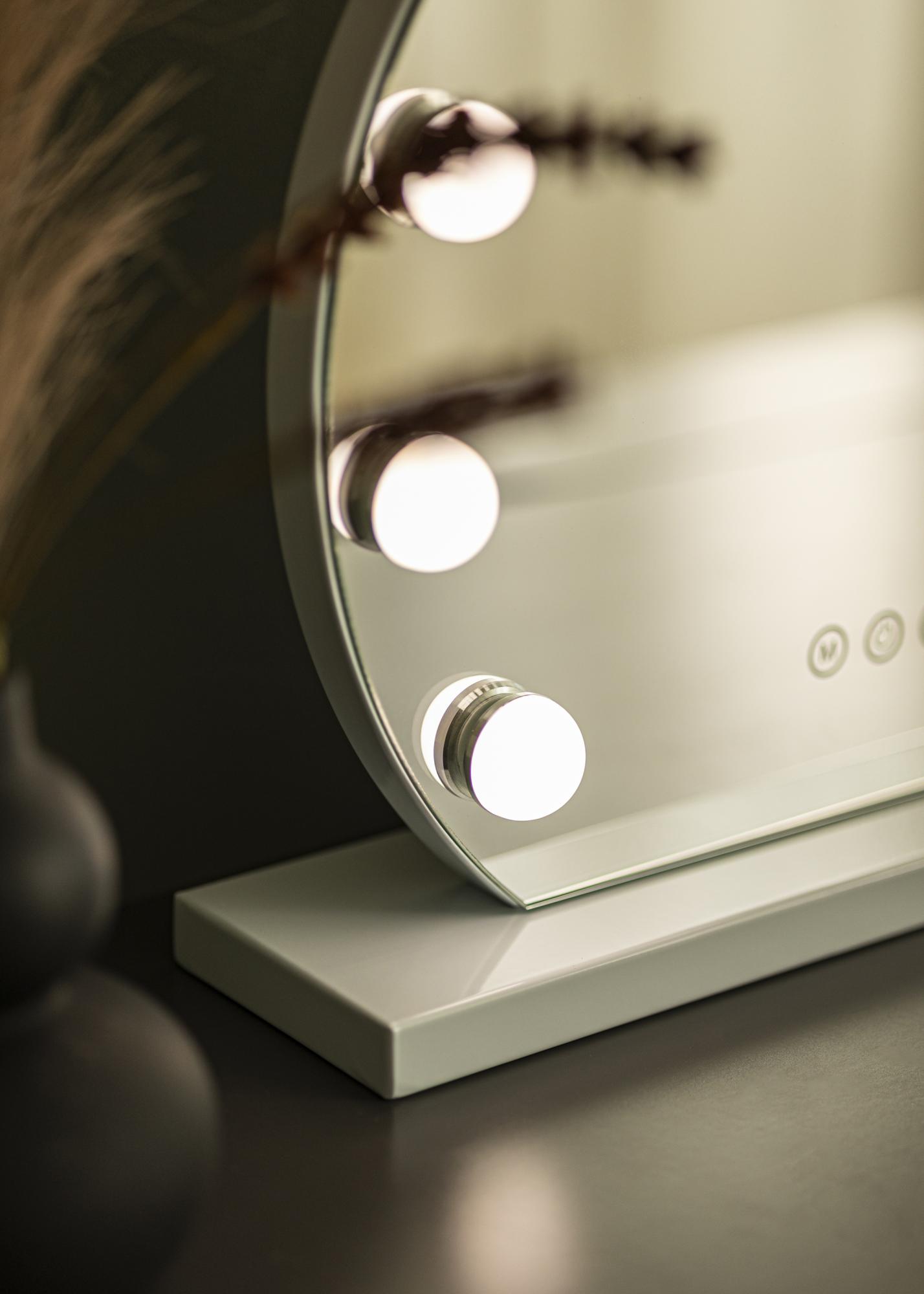 Este é um espelho para toucador de luxo com iluminação LED integrada que proporciona uma luz uniforme no seu rosto quando se olha ao espelho. A iluminação é composta por 10 lâmpadas LED que estão colocadas ao longo da borda da superfície do espelho. A luz pode ser ajustada de acordo com o seu gosto, uma vez que tem a possibilidade de ajustar tanto a intensidade da luz como a temperatura de cor. As configurações de luz são feitas através dos botões de toque na parte inferior do espelho, que estão marcados com letras. No botão marcado com "M", pode escolher a temperatura de cor entre luz quente, fria e natural. O botão marcado com "P" é usado para diminuir a intensidade da luz. Existe também um botão de ligar/desligar que é usado para ligar ou desligar a iluminação. A ligação elétrica é feita através de uma ficha.