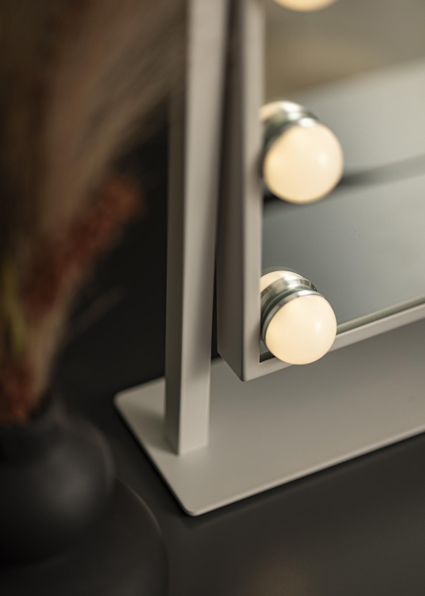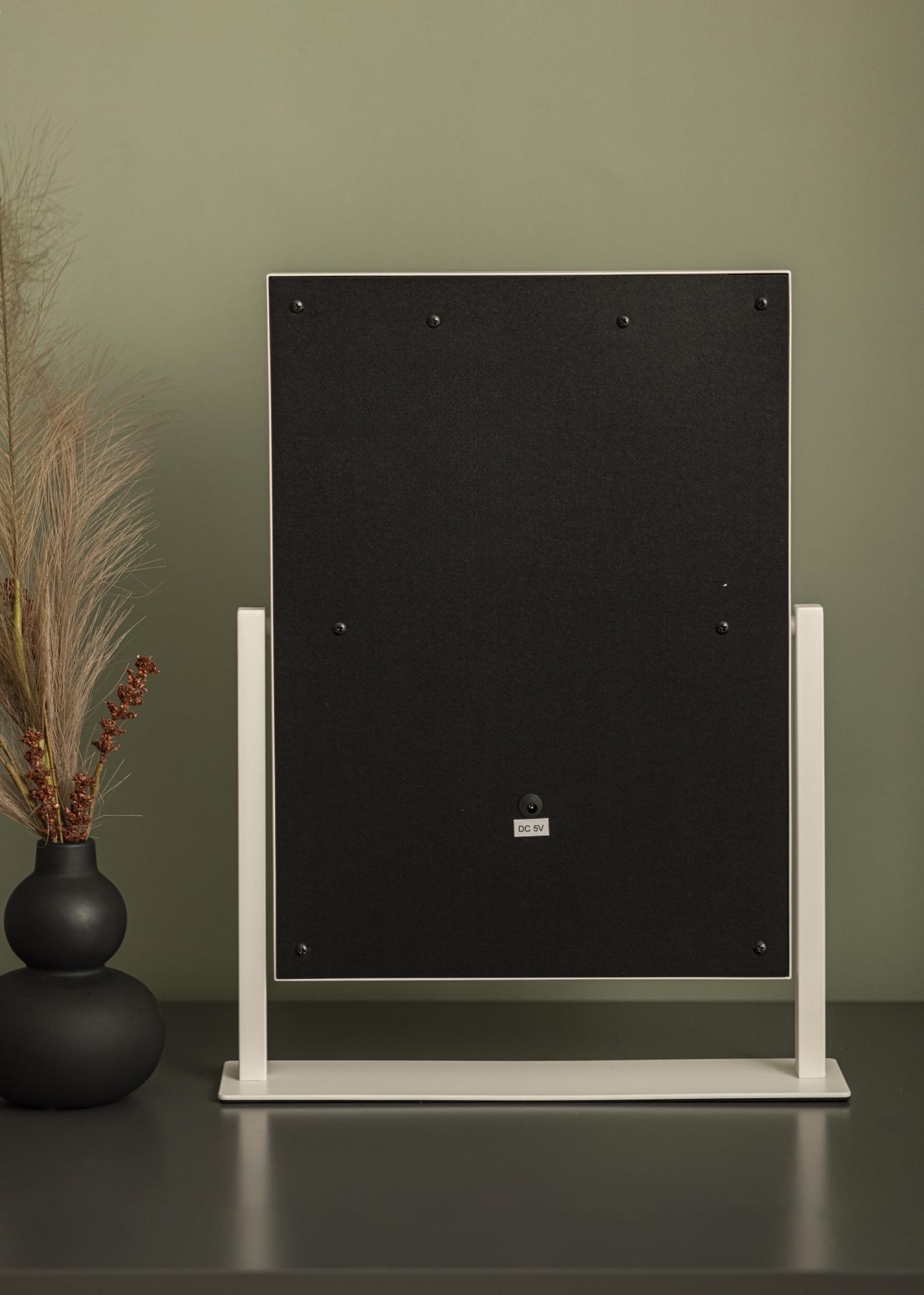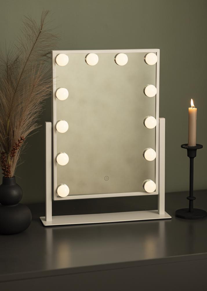 Esta é uma espelho para toucador com design luxuoso, com 12 lâmpadas LED decorativas em um elegante tom de branco. As lâmpadas emolduram elegantemente a generosa superfície do espelho, que mede 30x40 cm, e proporcionam uma luz branca quente de 3000K. A iluminação é ativada pressionando o botão tátil no ecrã e possui uma função de ajuste de intensidade que pode facilmente ajustar mantendo o botão pressionado por alguns segundos. O espelho pode ser inclinado verticalmente para que possa se maquilhar a partir do ângulo que melhor lhe convier. Além das suas muitas funcionalidades, este espelho para toucador se torna um detalhe elegante e cria uma verdadeira sensação de Hollywood em sua casa!