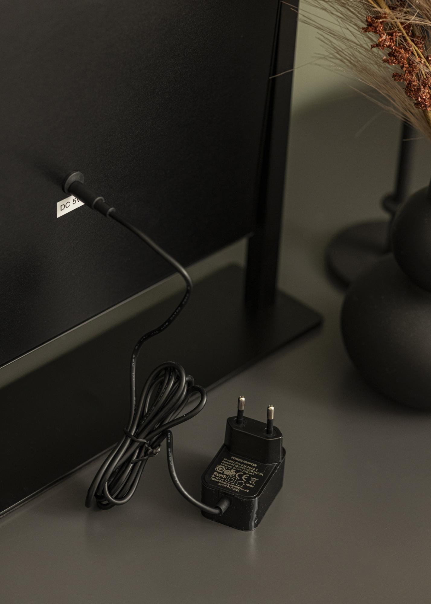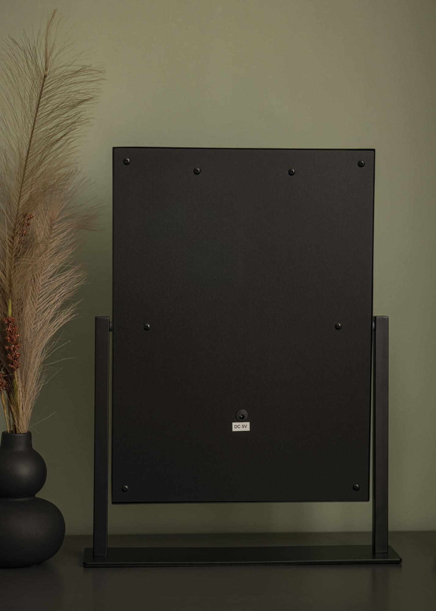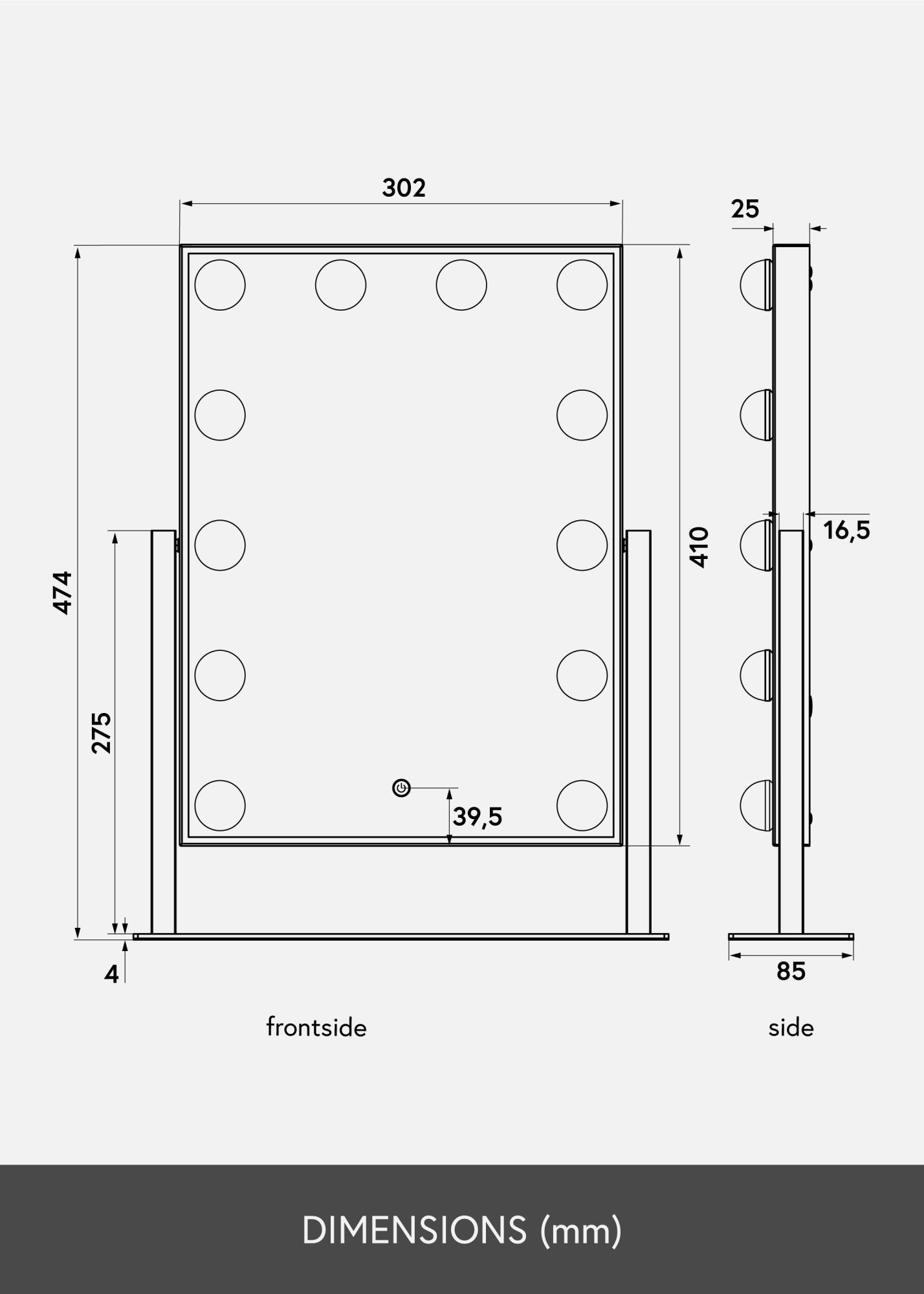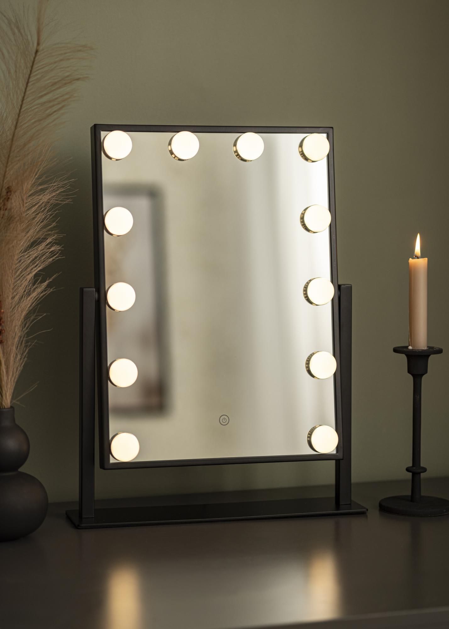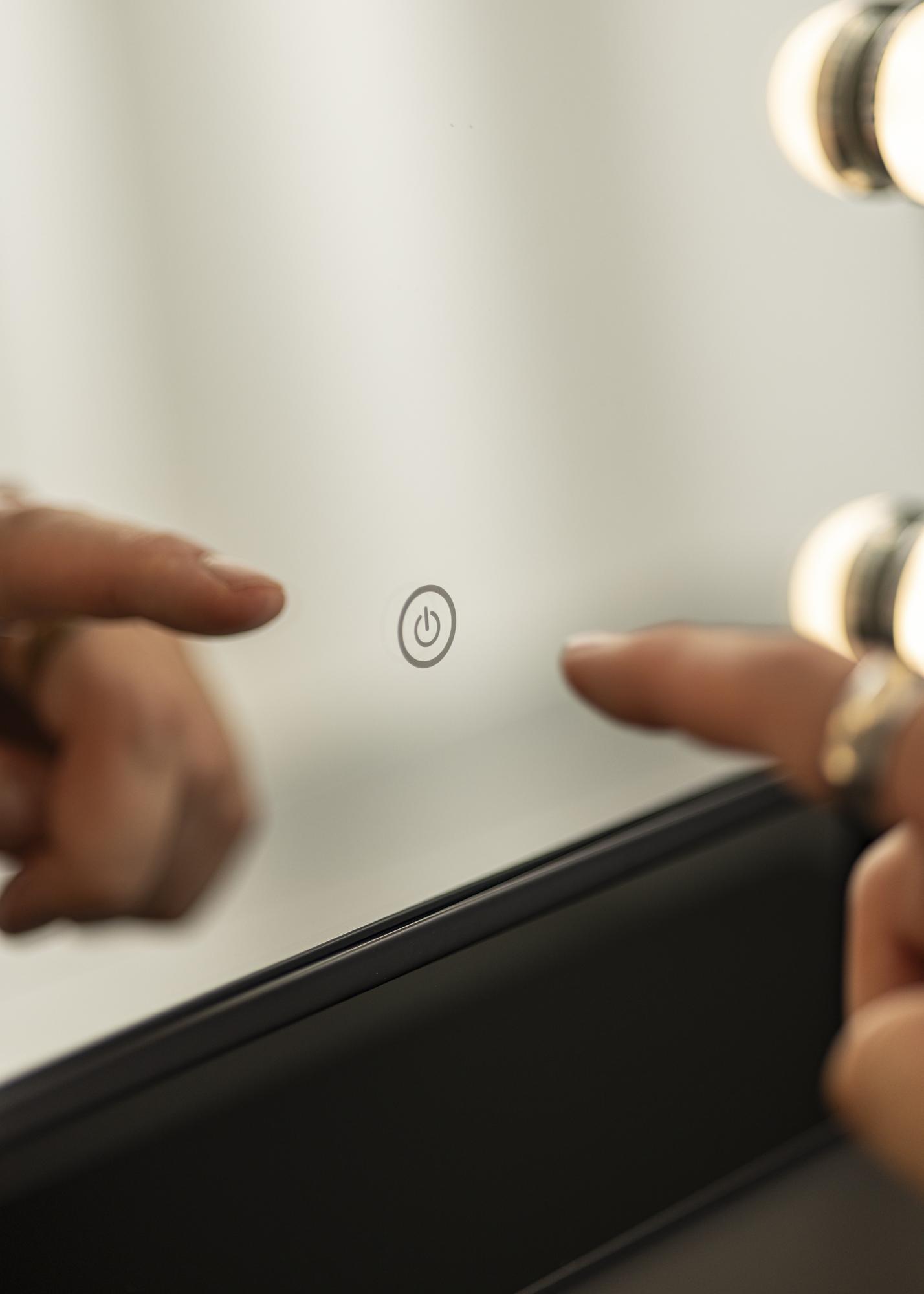 Esta é uma espelho para toucador com design luxuoso, com 12 lâmpadas LED decorativas em um elegante tom preto. As lâmpadas emolduram elegantemente a generosa superfície do espelho, que mede 30x40 cm e emite uma luz branca quente de 3000K. A iluminação é ativada pressionando o botão tátil no ecrã e possui uma função de ajuste de intensidade que pode facilmente ajustar mantendo o botão pressionado por alguns segundos. O espelho pode ser inclinado verticalmente para que possa se maquilhar a partir do ângulo que melhor lhe convier. Além das suas muitas funcionalidades, este espelho para toucador se torna um detalhe elegante e cria uma verdadeira sensação de Hollywood em sua casa!