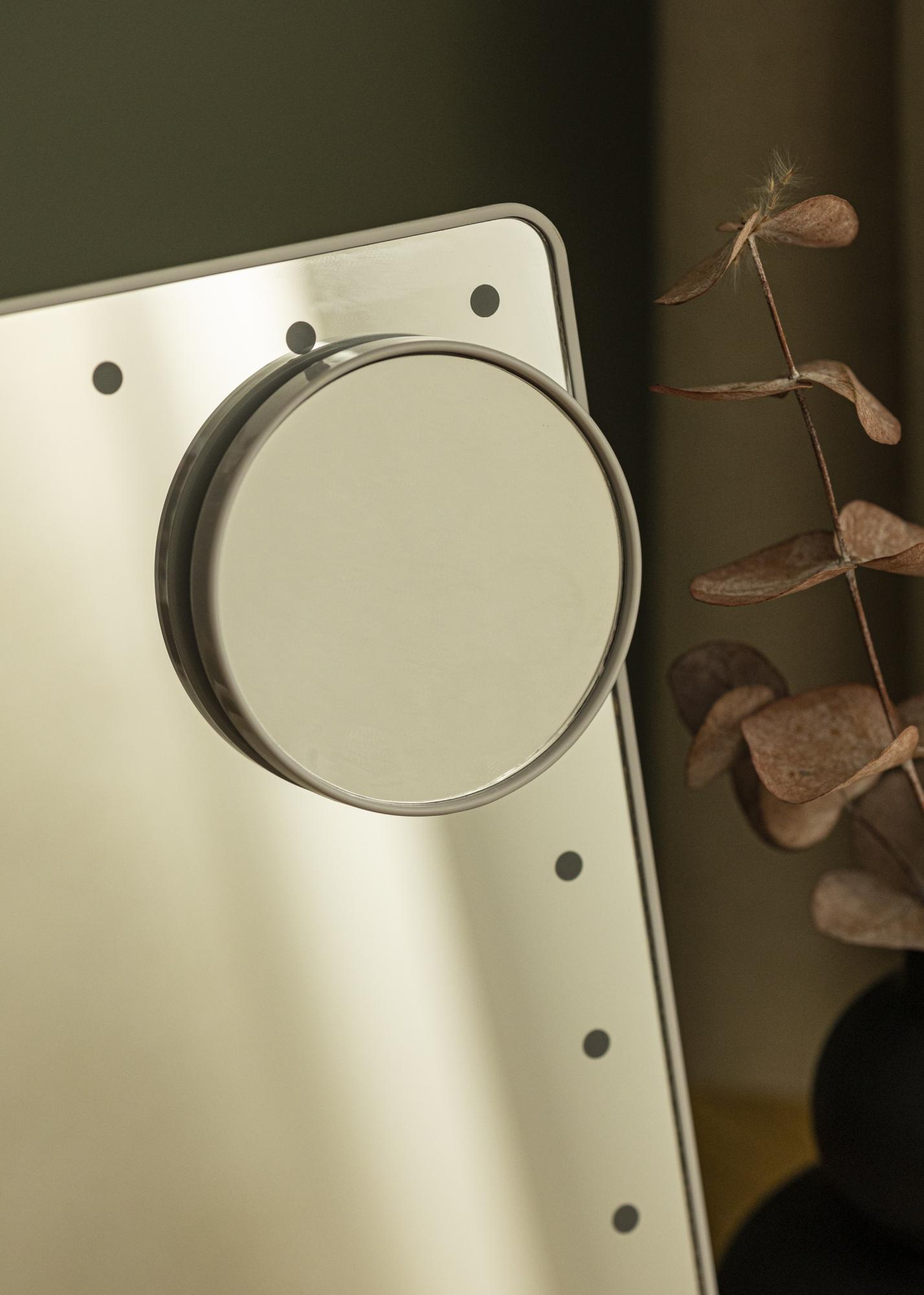 O espelho tem um tamanho compacto, com uma superfície espelhada de 16,5x25 cm, o que facilita o transporte. A superfície do espelho pode ser girada e inclinada para que possa ajustar um ângulo que seja adequado para si. Acompanha um espelho mais pequeno com zoom de 2x e 3x, que pode ser usado separadamente ou fixado no vidro do espelho maior. Este espelho para toucador também possui iluminação LED integrada, que proporciona uma luz branca fria em seu rosto enquanto você se espelha. A iluminação pode ser ligada e desligada por meio de um botão liga/desliga na parte de trás do espelho, e também pode ajustar a intensidade da luz. O espelho é alimentado por uma bateria integrada que é recarregada por meio de uma conexão USB. Cabo de carregamento incluído.