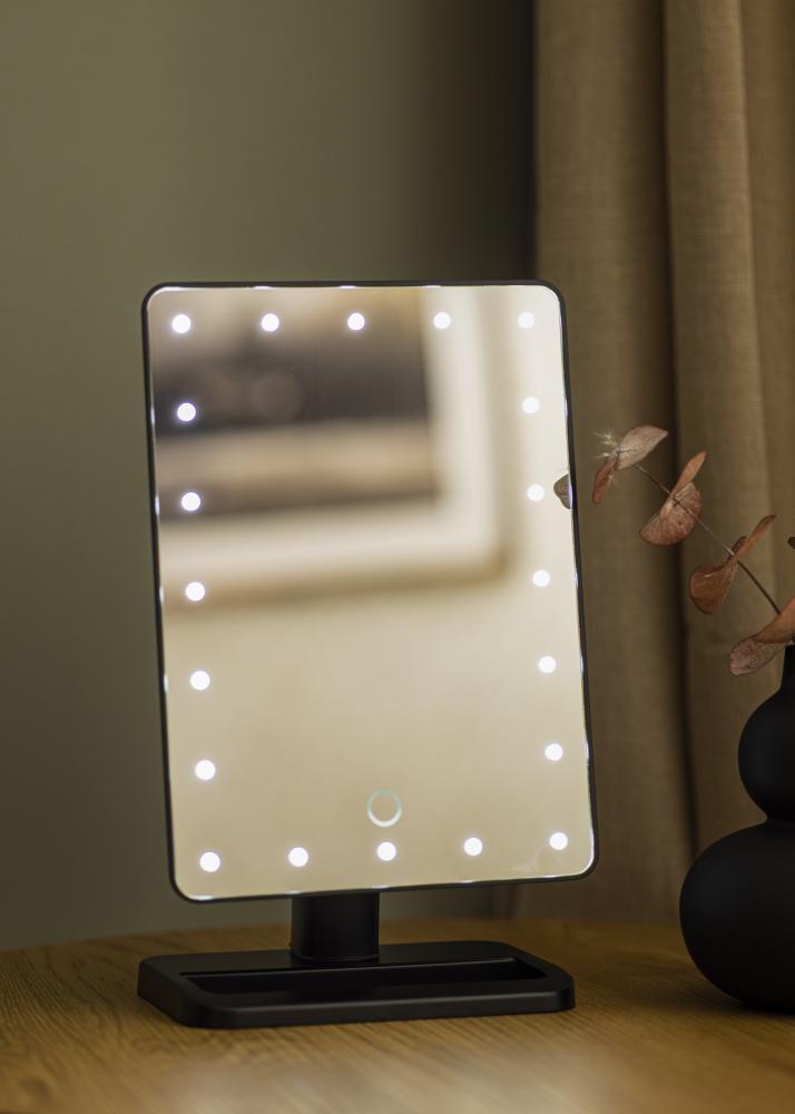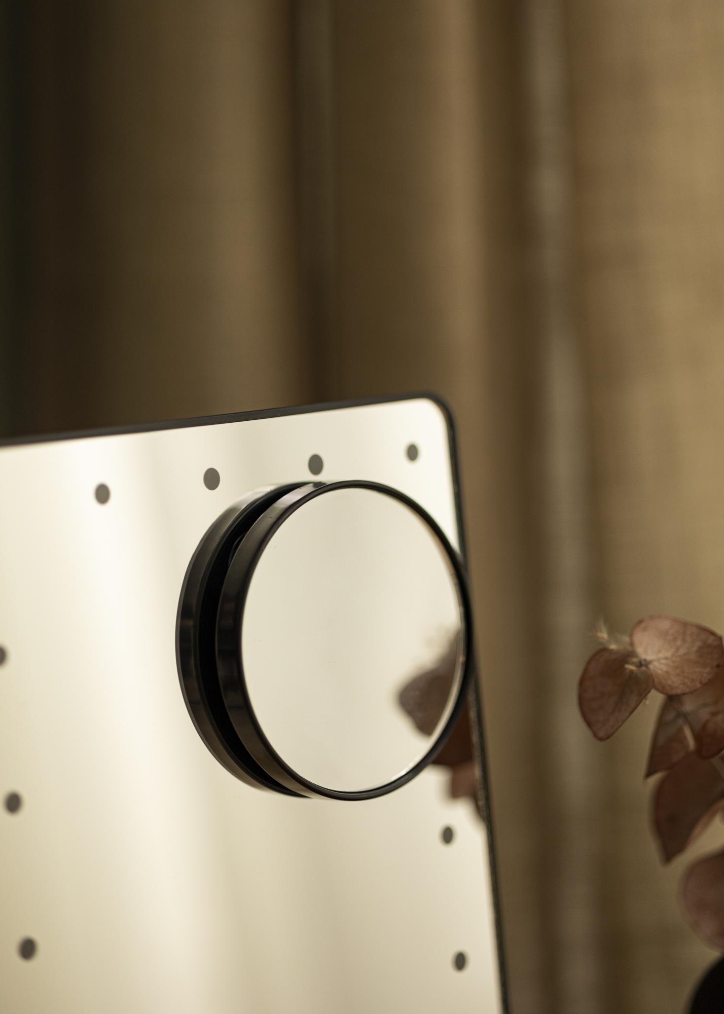 O espelho tem um design inteligente com iluminação LED regulável que proporciona uma luz branca fria. Pode ligar e desligar a iluminação com um botão na parte de trás. Para que possa espelhar-se adequadamente, este espelho para toucador também é giratório e ajustável, para que possa corrigir a posição da superfície do espelho como desejar. Inclui um espelho mais pequeno com zoom de 2x e 3x, que pode ser facilmente fixado no vidro do espelho principal. O espelho tem uma bateria de iões de lítio incorporada que é carregada através de uma ligação USB. O cabo de carregamento está incluído.