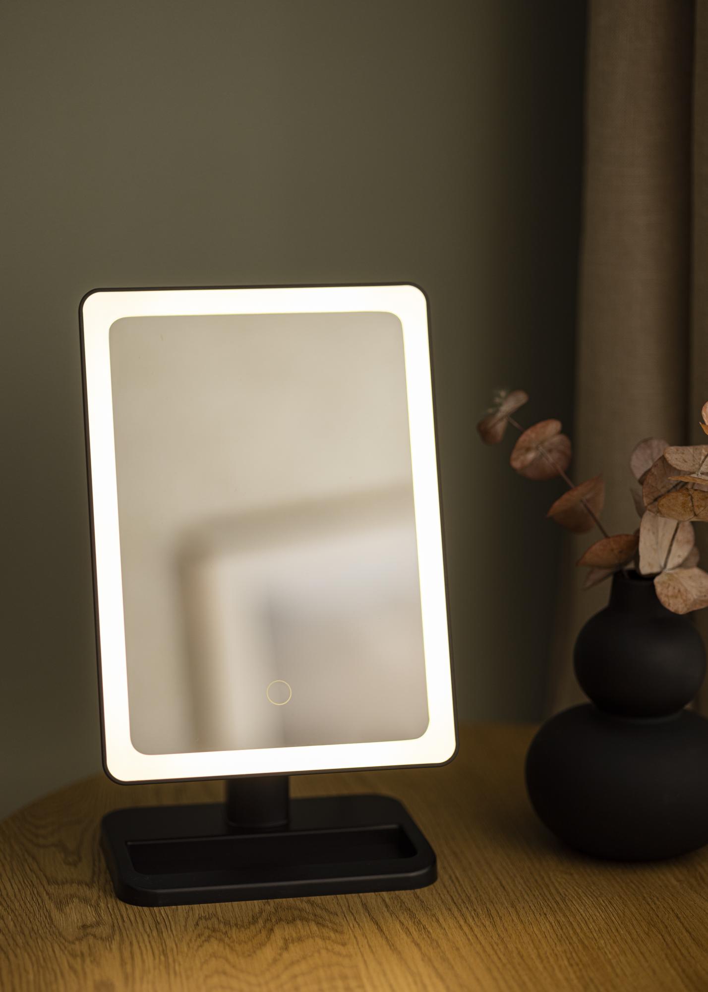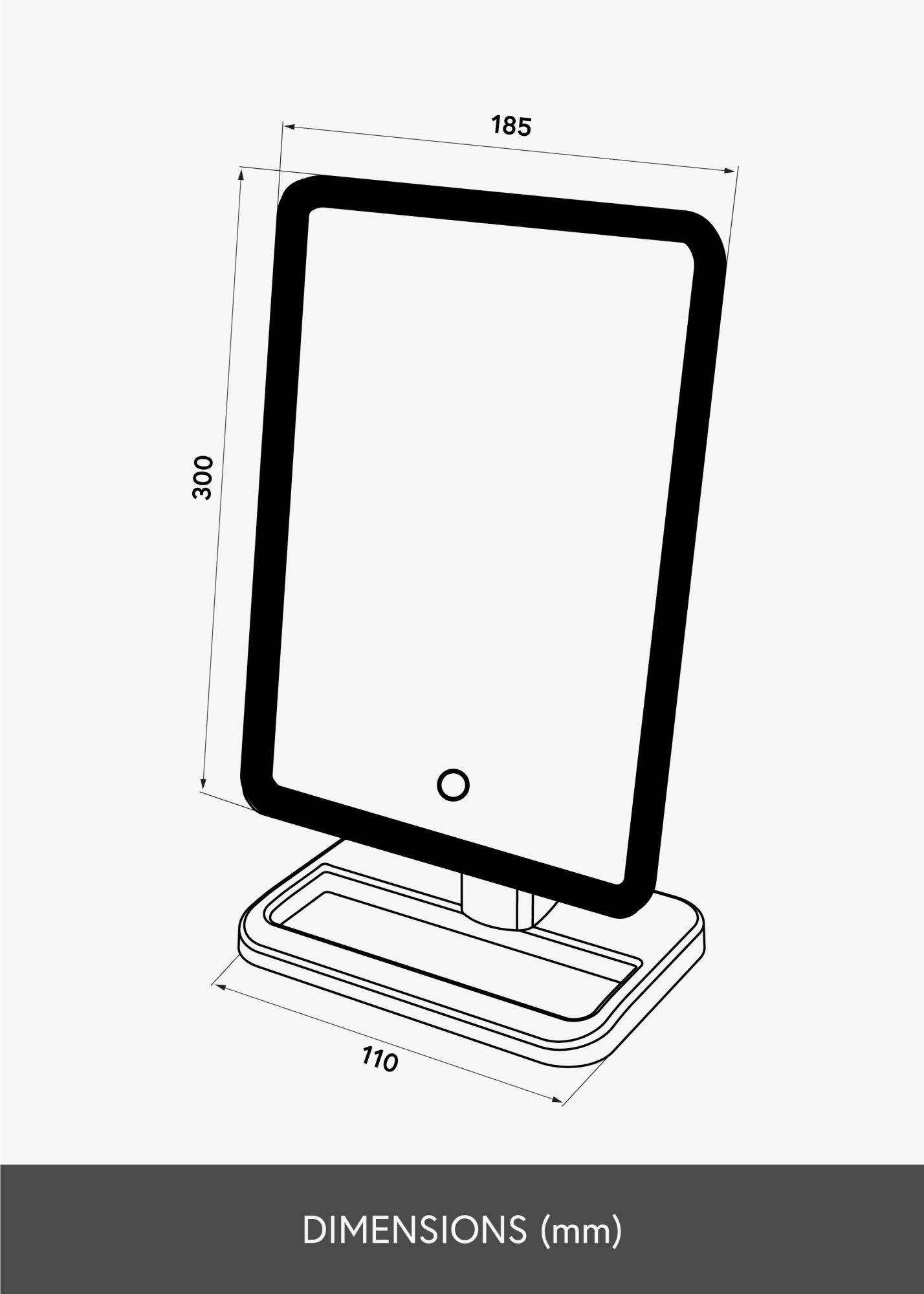 O espelho tem um design inteligente com recursos que facilitam a maquilhagem com excelentes resultados. A superfície do espelho é cercada por uma faixa de LED que ilumina o seu rosto - além disso, ela pode ser girada e inclinada para que possa ajustar um ângulo que lhe convém. Pode ajustar a intensidade da iluminação pressionando o botão no espelho. Também é fornecido um espelho mais pequeno com zoom de 10x, perfeito quando quer focar em uma pequena parte do rosto. O espelho é alimentado por uma bateria integrada que é recarregada através do cabo USB fornecido.