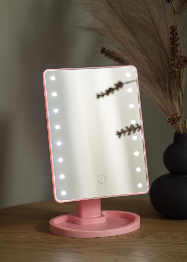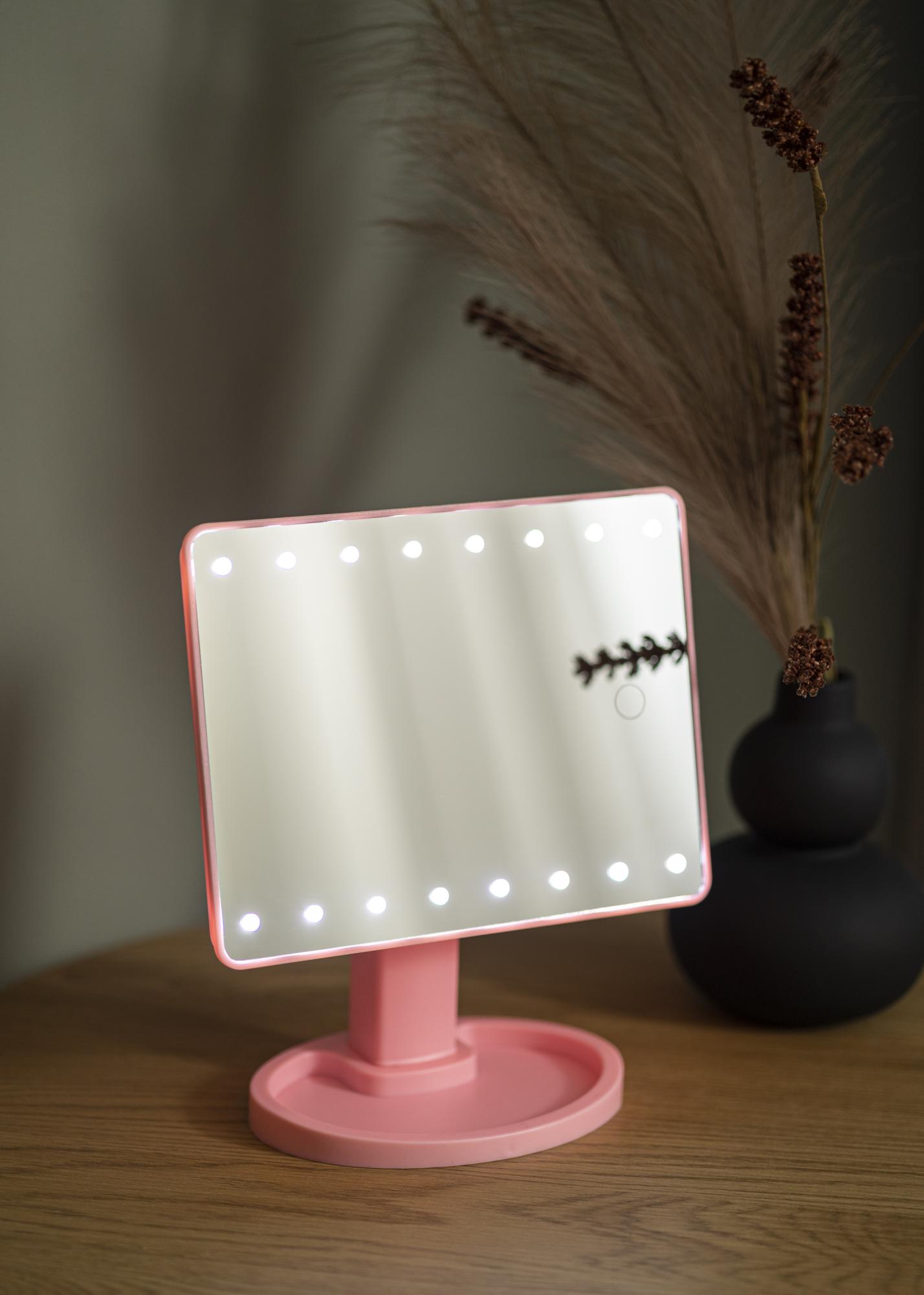 Este espelho para toucador é uma excelente escolha para quem procura um espelho mais pequeno num modelo elegante. O tom rosa adiciona um toque de cor encantador, ao mesmo tempo que a iluminação LED integrada proporciona uma luz branca fria e uniforme quando se está a espelhar. Pode ligar o espelho através do botão de energia na parte de trás do dispositivo. A iluminação também pode ser ajustada, para que possa definir a intensidade de luz que preferir. Para ajustar a luz, mantenha pressionado o botão tátil na parte da frente.