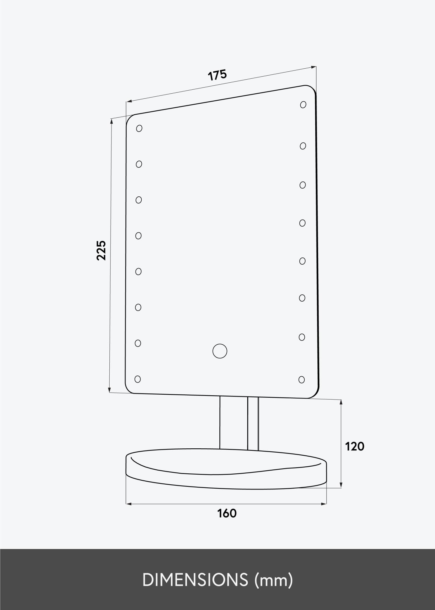 O espelho para toucador tem um design inteligente que permite rodar e inclinar a superfície do espelho. O espelho funciona com 4 pilhas AA (não incluídas).