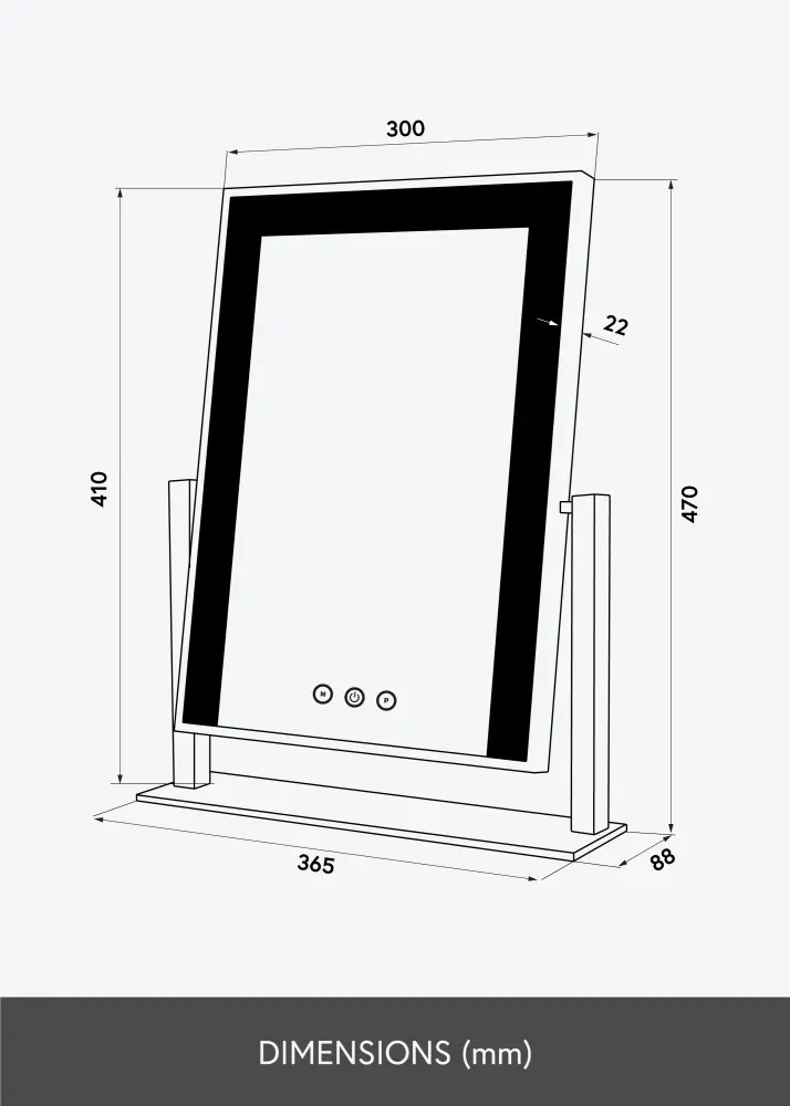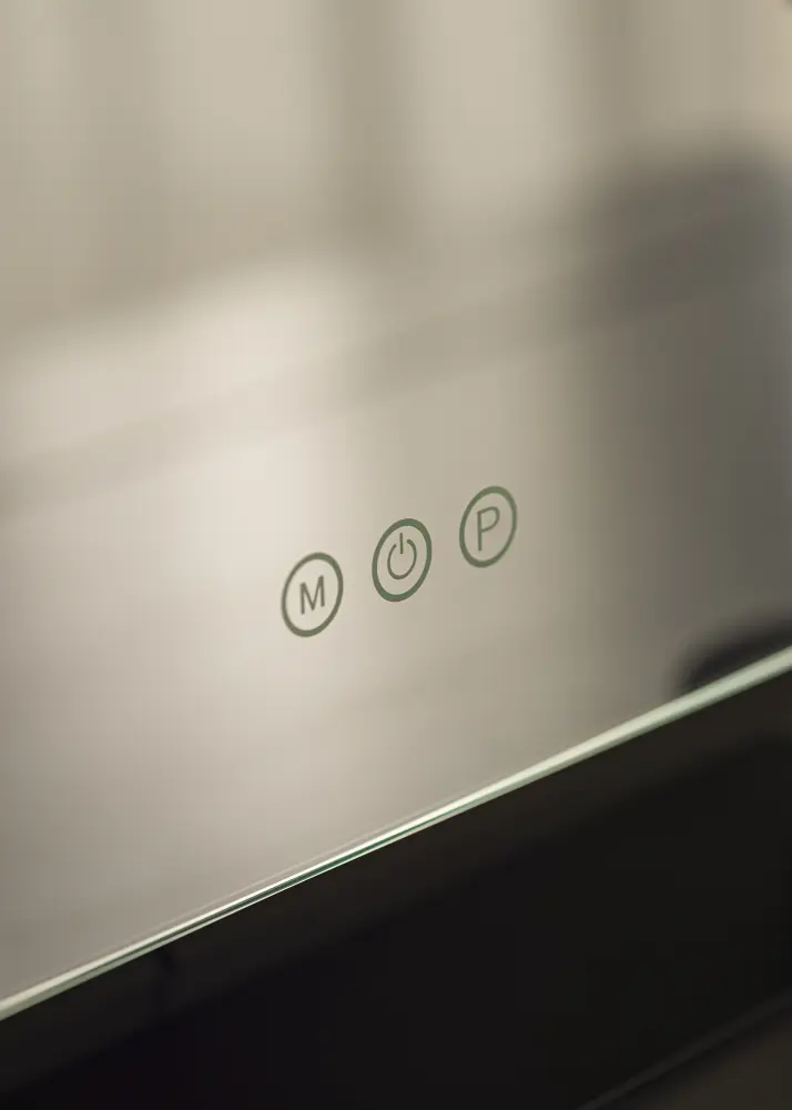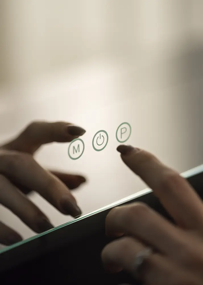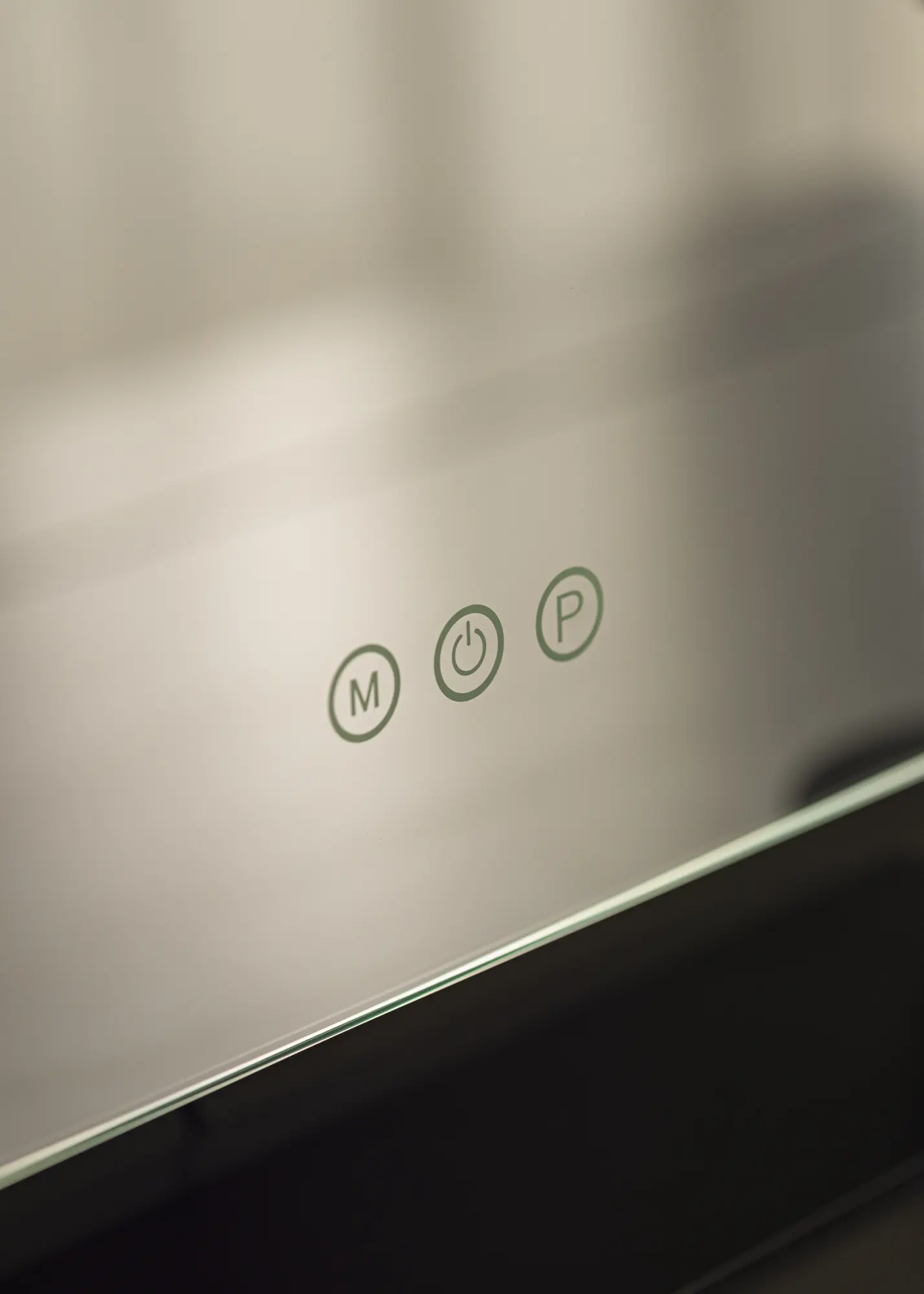 Este espelho possui uma faixa de LED integrada que contorna a superfície espelhada. Pode ajustar a intensidade da iluminação usando o botão tátil marcado com "P" e ajustar a temperatura de cor da luz usando o botão tátil marcado com "M". Dessa forma, pode alterar as configurações de iluminação do espelho para cada ocasião, seja para obter uma iluminação de fundo suave ou uma luz mais intensa que ajude você a se concentrar na sua imagem refletida. Também há um botão de ligar/desligar que pode usar para ligar e desligar a iluminação do espelho. A Ligação elétrica é feita por meio de uma tomada.