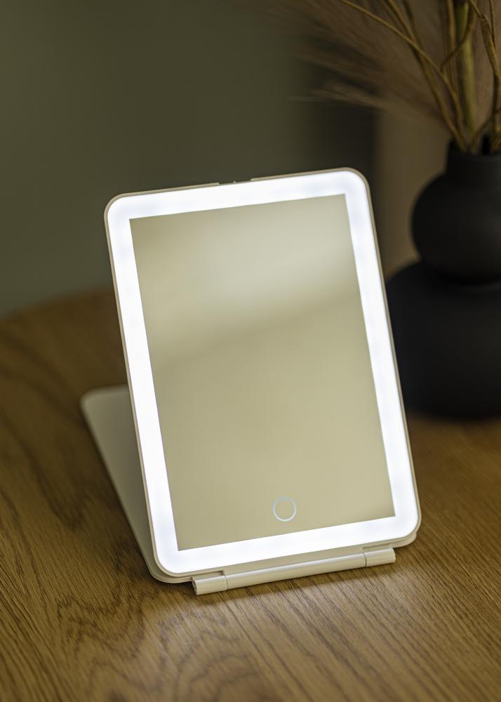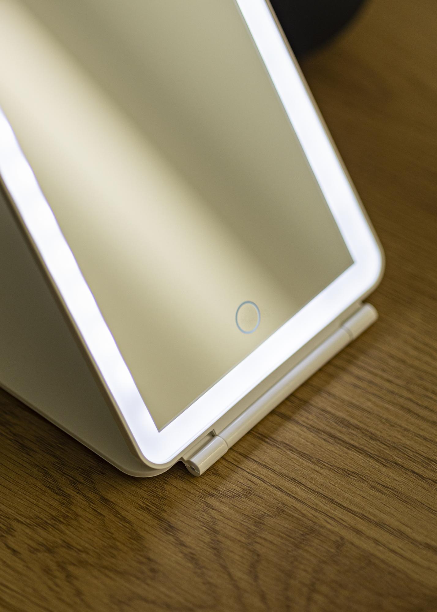 Este é um espelho branco com iluminação LED incorporada que proporciona uma luz suave no seu rosto. É alimentado por bateria e pode ser facilmente recarregado através de uma conexão USB quando a bateria está fraca. O cabo de carregamento está incluído. O espelho acende-se através de um botão tátil na superfície do espelho, com o qual também pode ajustar a iluminação. Ao manter o botão pressionado por alguns segundos, pode tanto diminuir a intensidade da luz como ajustar a temperatura de cor.