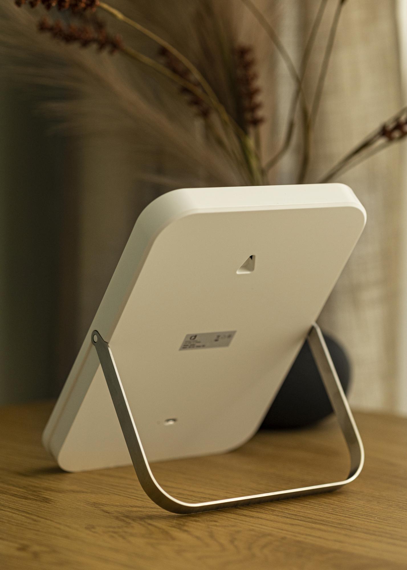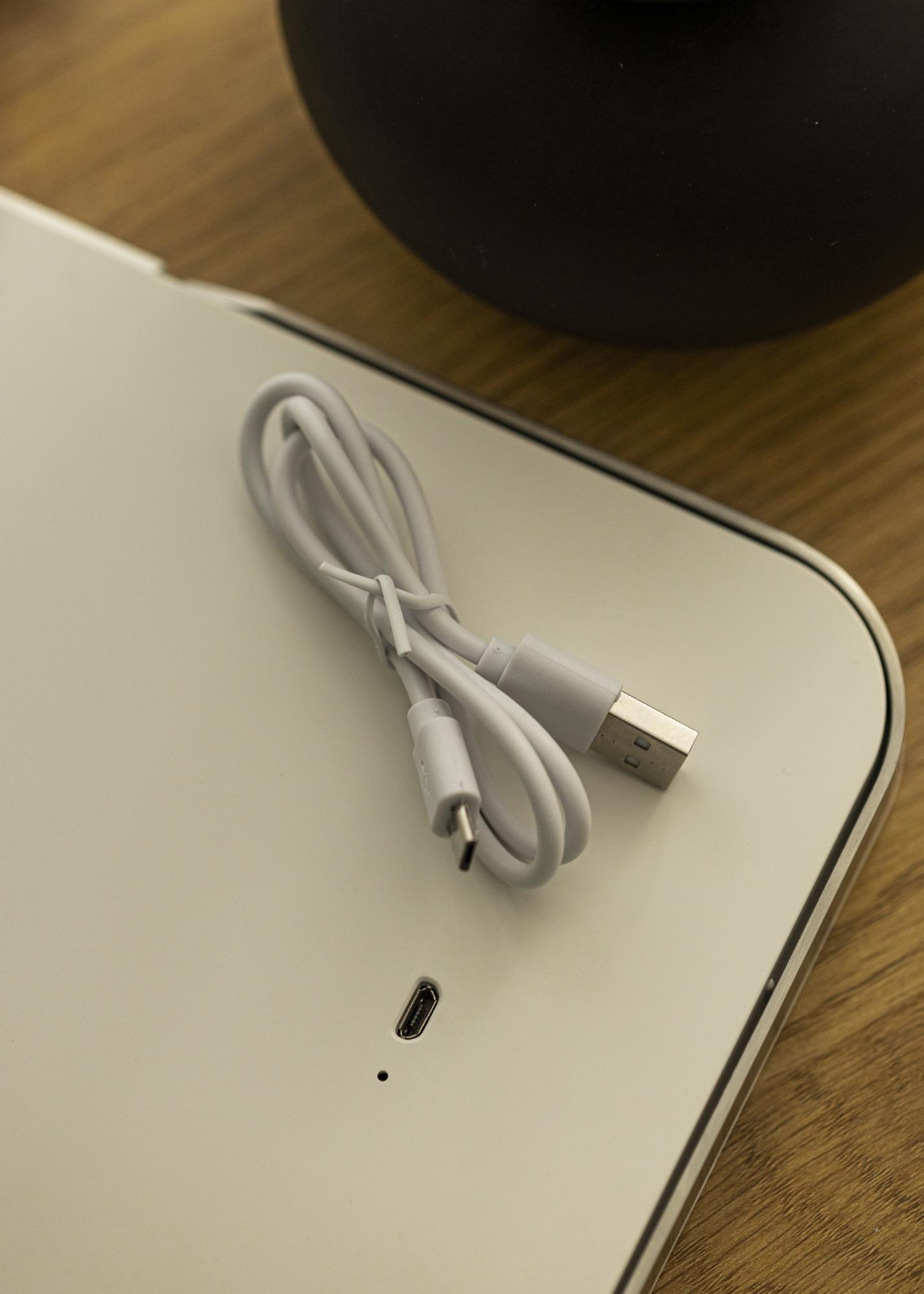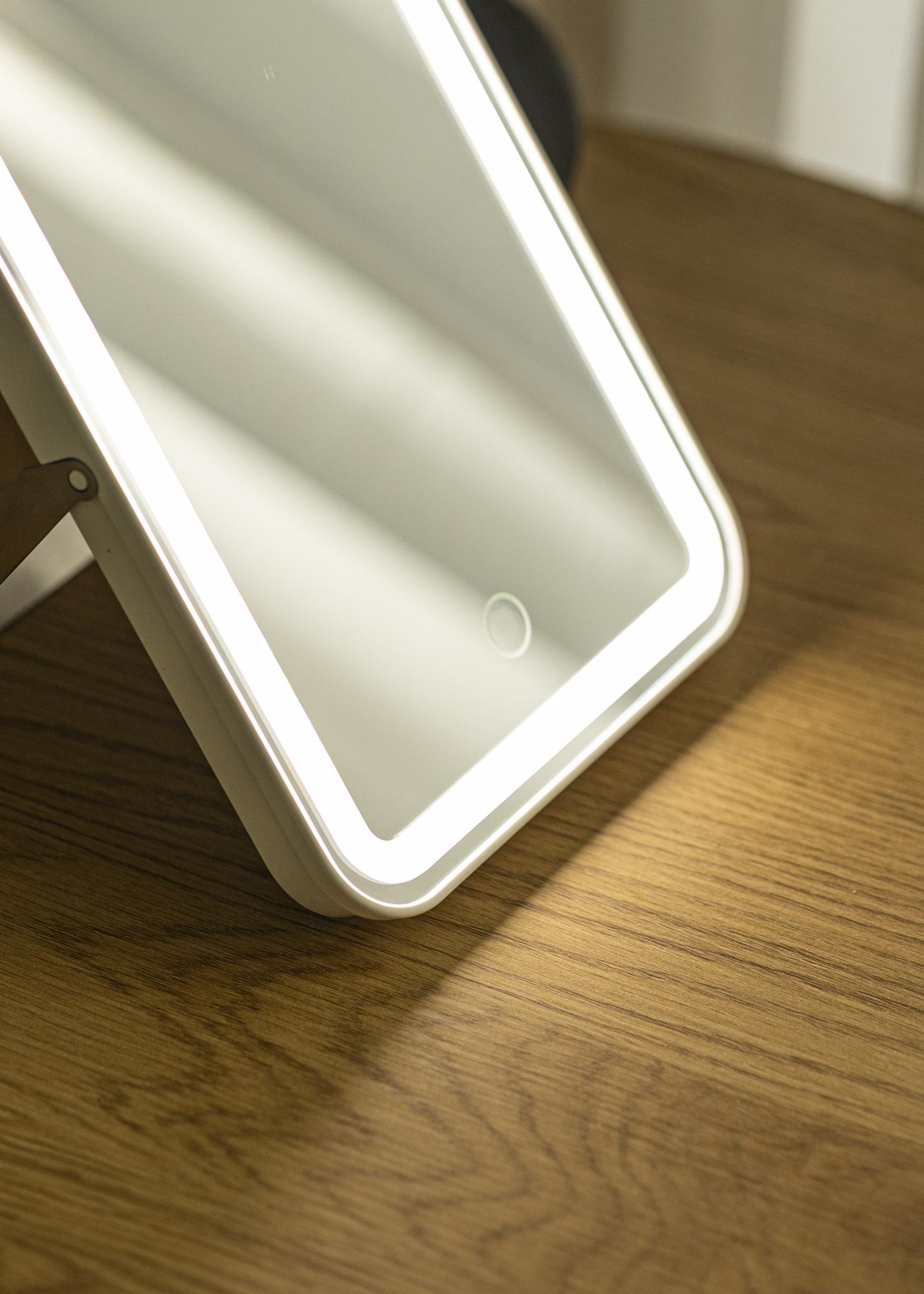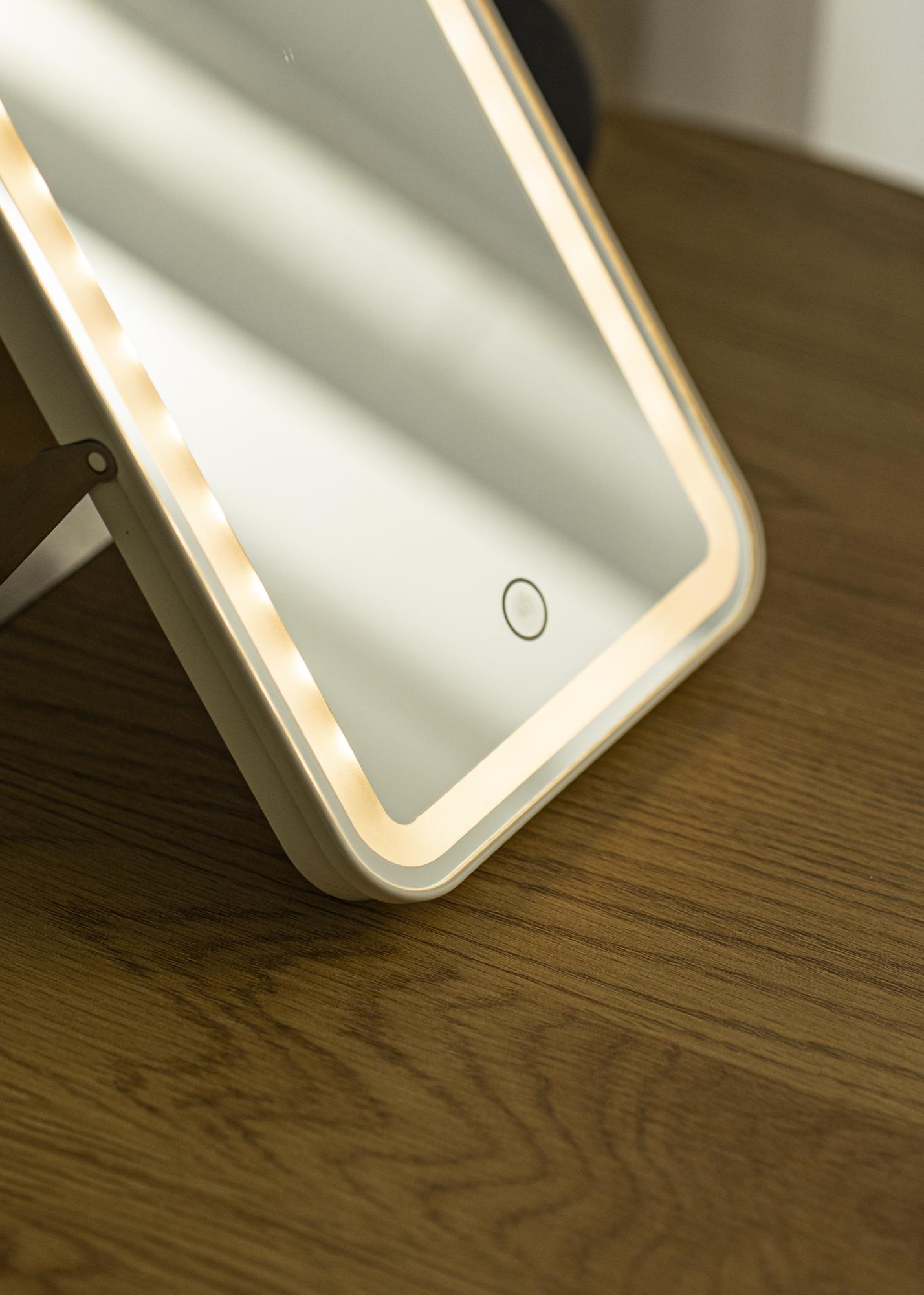 Este espelho para toucador numa cor branca neutra e um suporte prateado que pode ser dobrado. O espelho tem uma bateria incorporada, que pode ser carregada através de uma conexão USB. O cabo de carregamento está incluído.