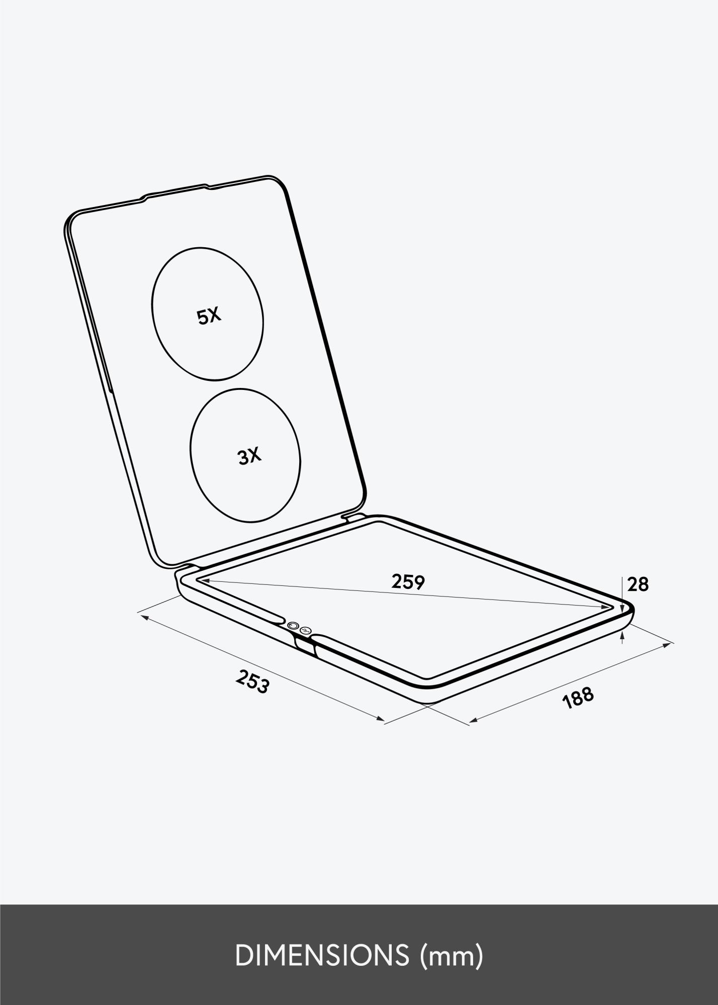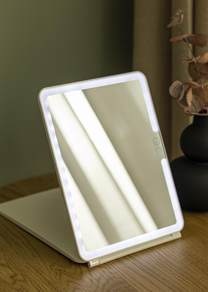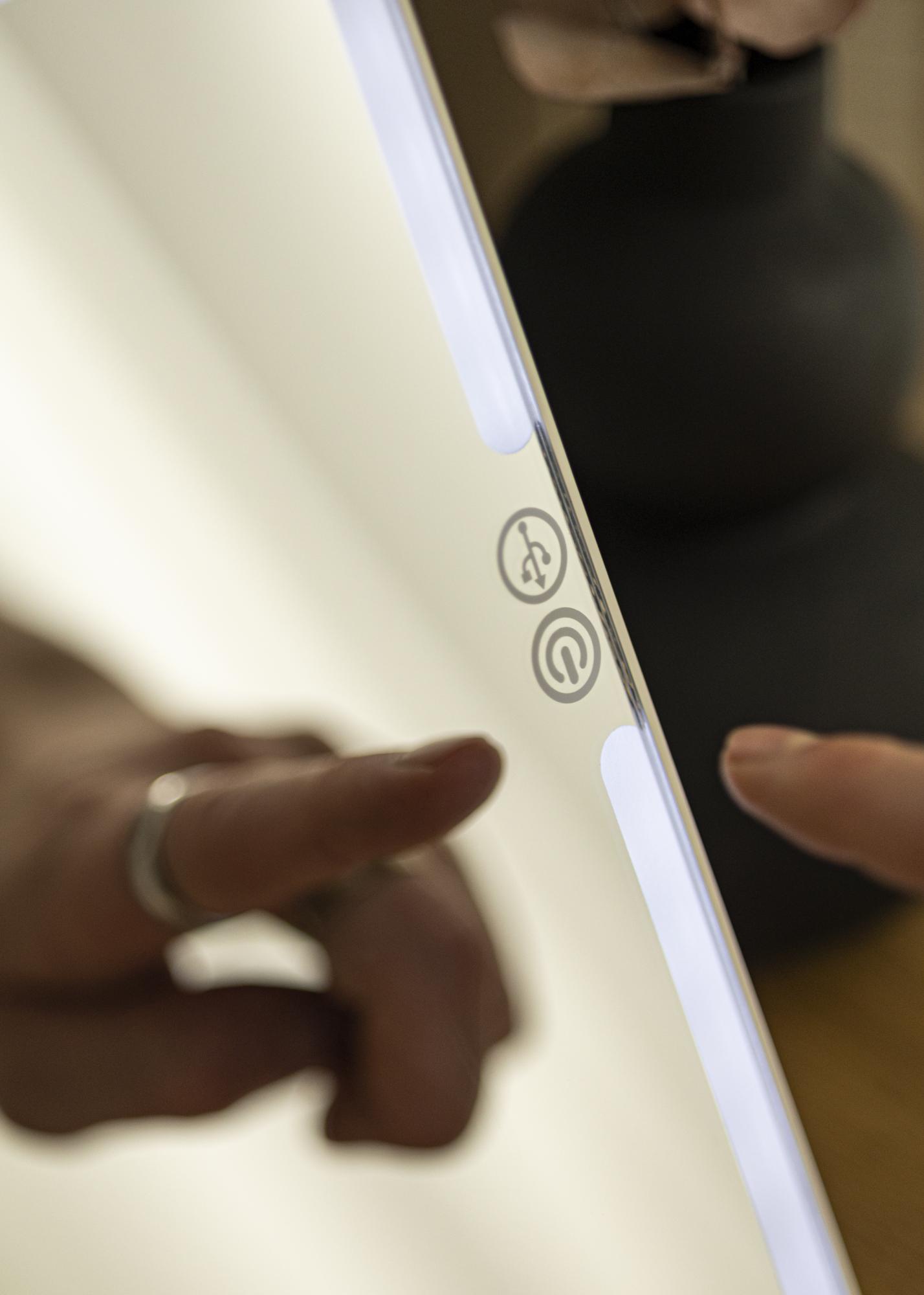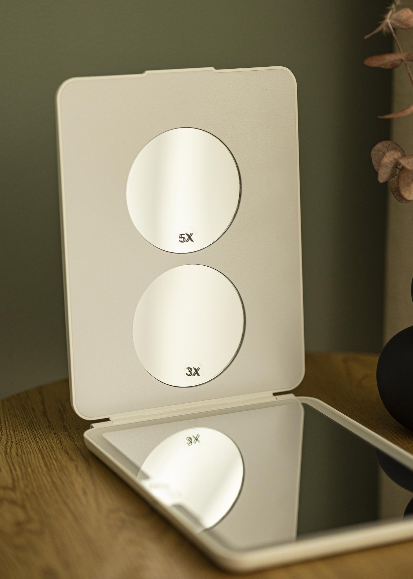 Este é um espelho para toucador em formato compacto, com um design dobrável inteligente que permite ajustar facilmente o ângulo do espelho durante a utilização. O design dobrável também economiza espaço e protege a superfície do espelho quando está guardado na mala. É um espelho excelente para levar consigo quando está a viajar, pois é compacto, leve e tem iluminação incorporada que proporciona uma luz uniforme no seu rosto quando se está a maquilhar. A iluminação é ligada e desligada através de um botão tátil na moldura do espelho. Se mantiver o botão pressionado durante alguns segundos, pode ajustar a intensidade da luz e a temperatura de cor.