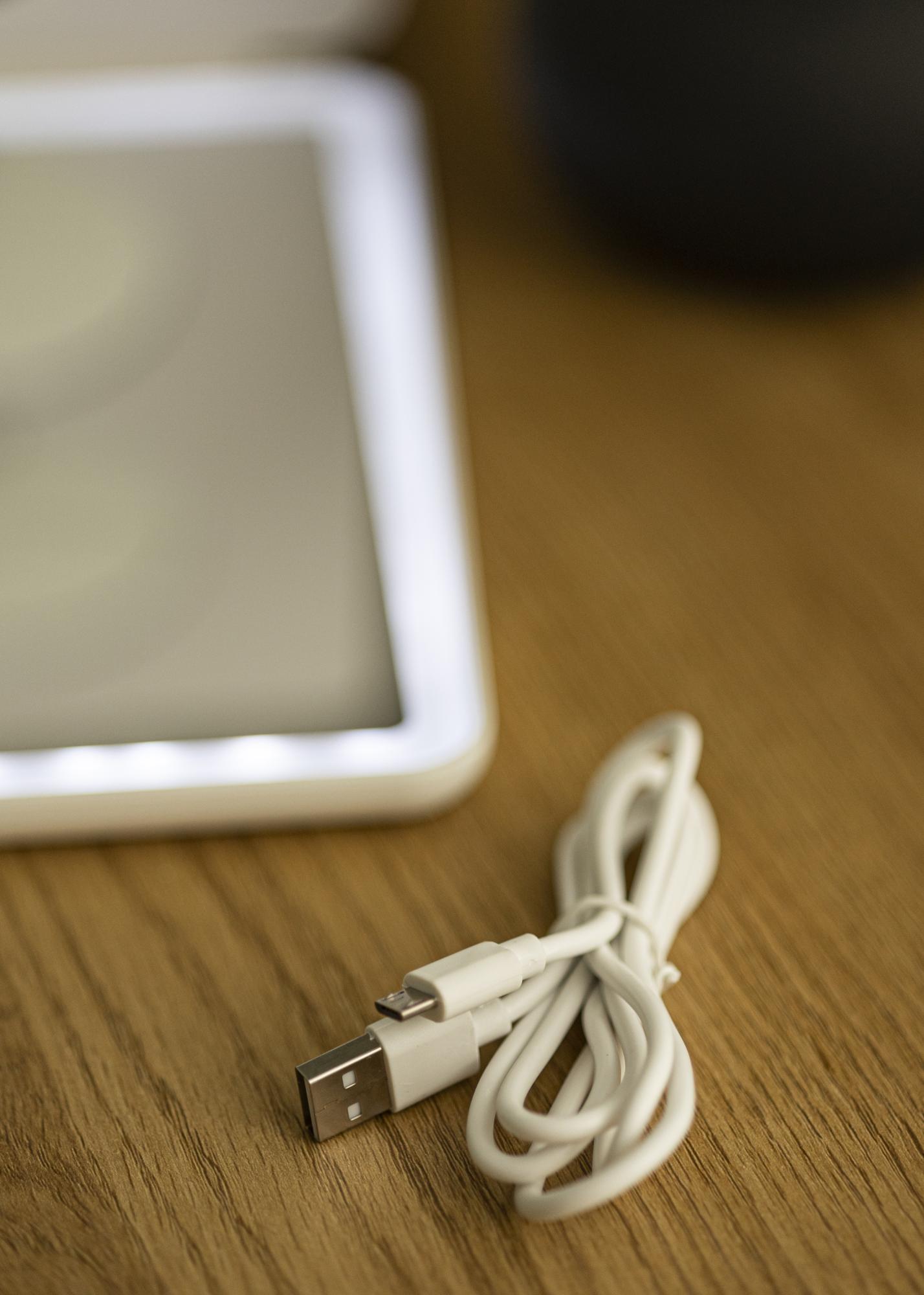 Quando o espelho iluminado é dobrado, entra automaticamente no modo de economia de energia até que o espelho seja aberto novamente. Este espelho para toucador é alimentado por bateria e carrega através de uma conexão USB.