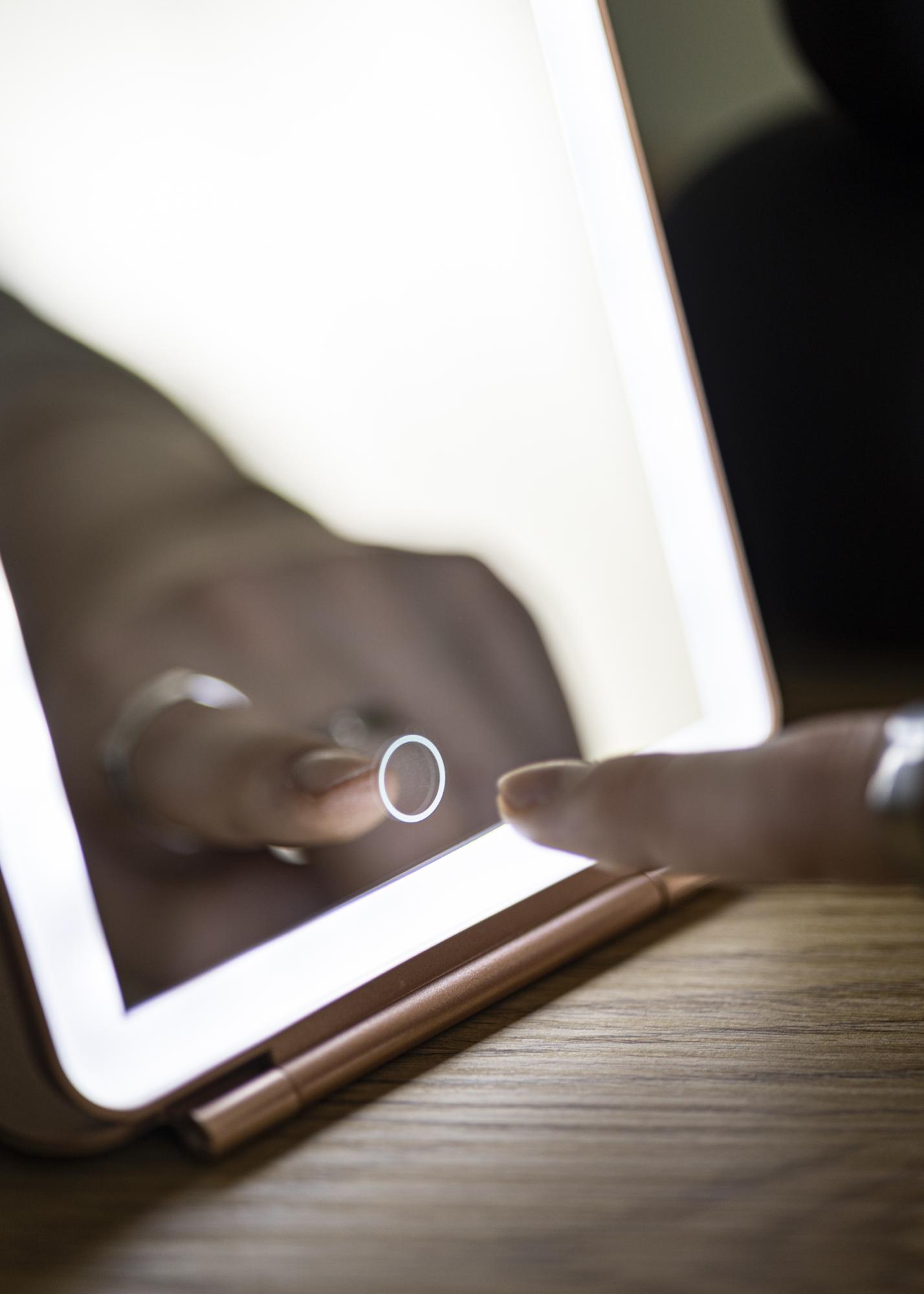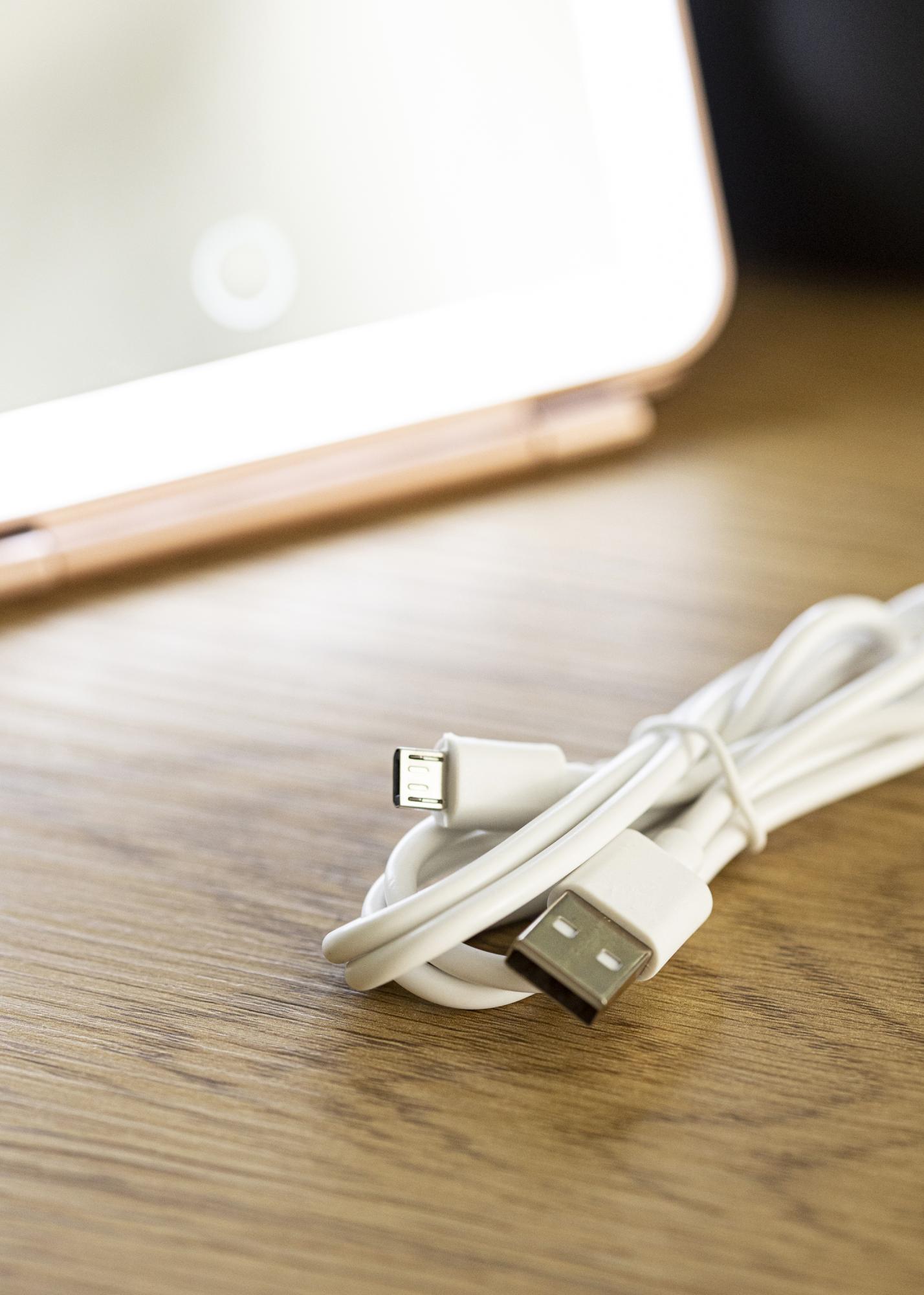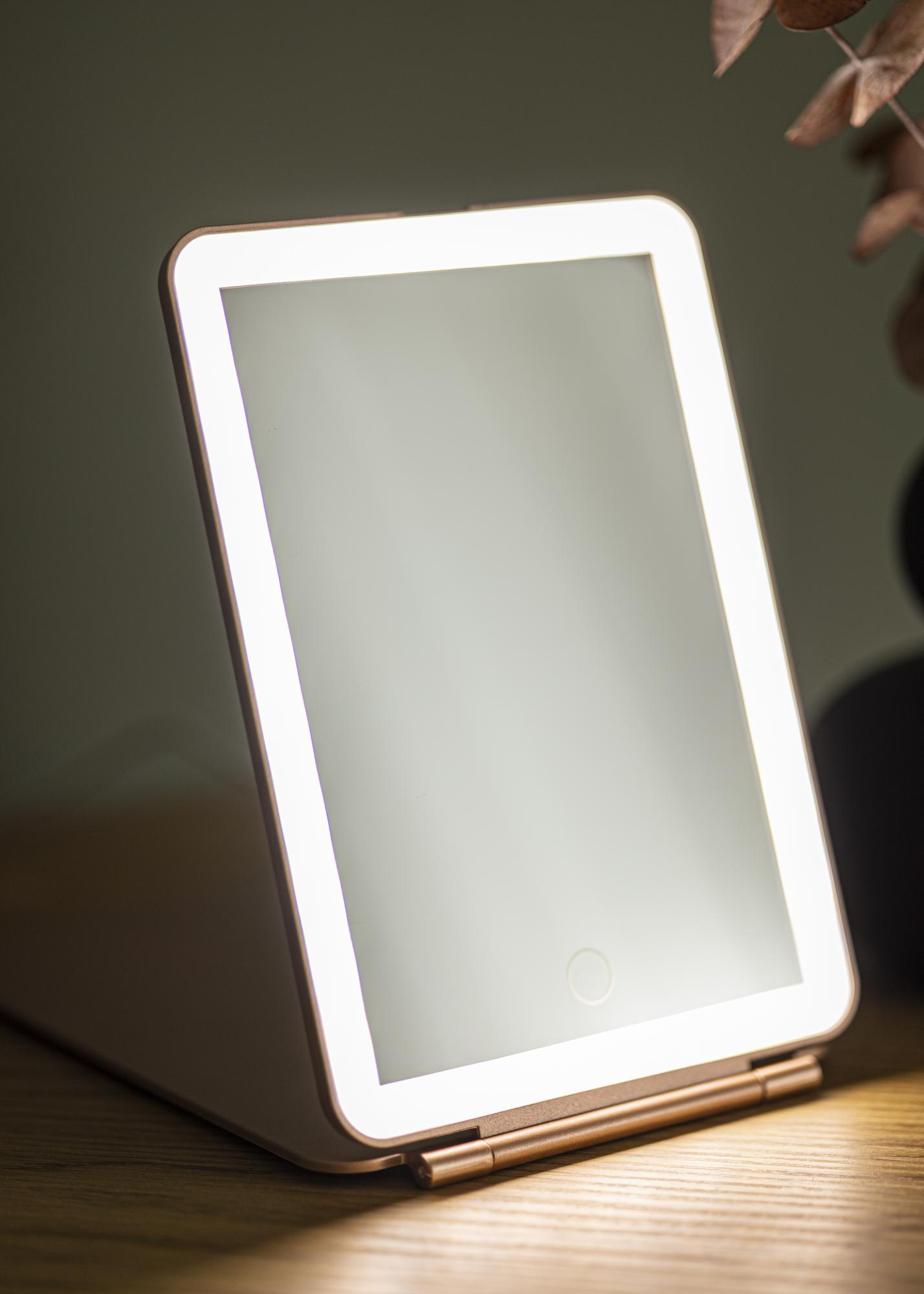 Este espelho para toucador elegante em dourado rosa será o seu companheiro fiel em todas as viagens. O design dobrável permite que ajuste o espelho no ângulo que preferir - e também pode dobrá-lo completamente quando não estiver em uso. Além disso, o espelho possui iluminação LED integrada, que é uma lâmpada de baixo consumo de energia que não precisa ser substituída ao longo do tempo. Se a bateria deste espelho estiver ficando fraca, ele pode ser carregado através de uma conexão USB. Você liga o espelho usando um botão tátil na parte frontal do espelho. Há também um botão tátil para ajustar a iluminação, que pode pressionar para diminuir a luz e ajustar a temperatura de cor.