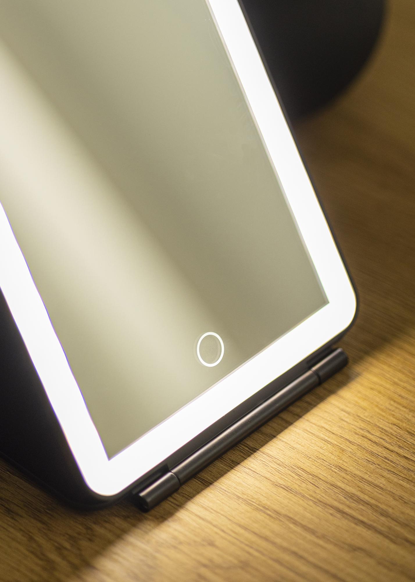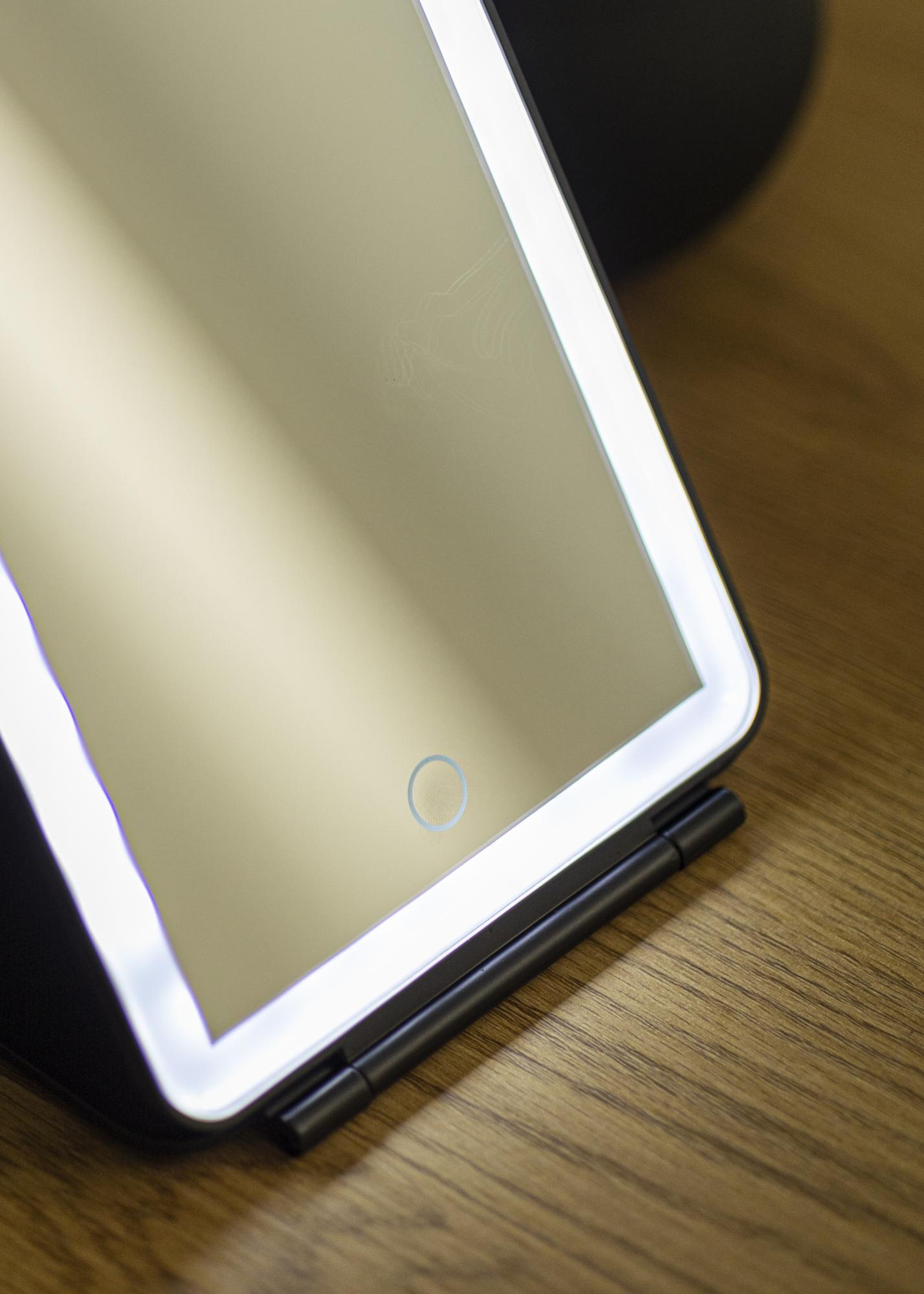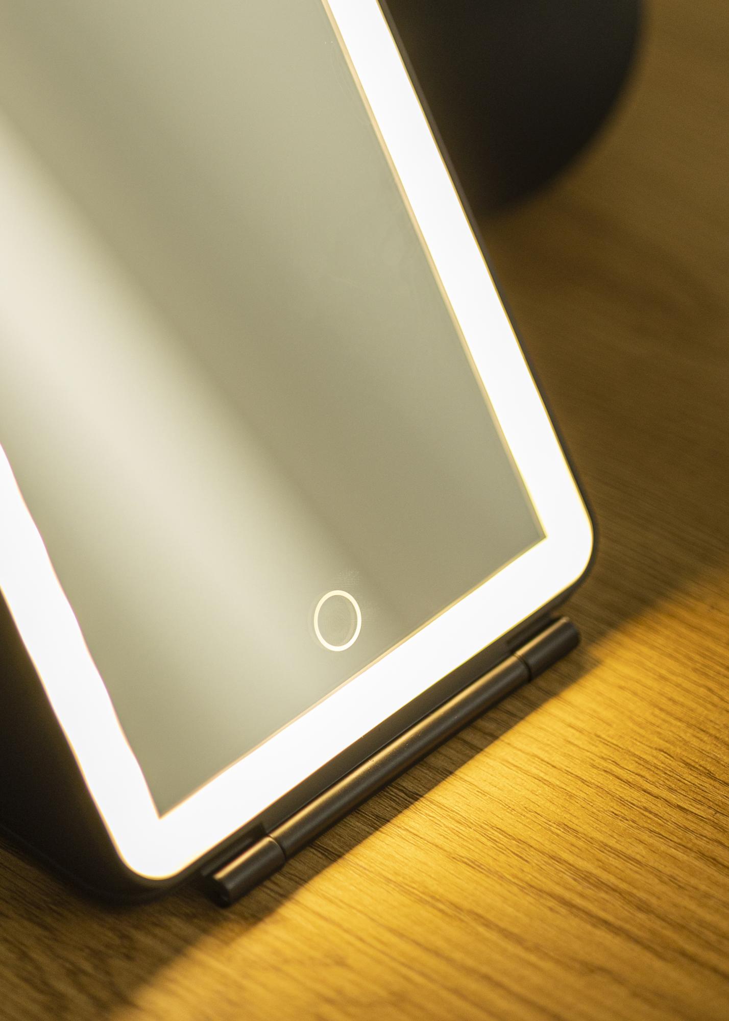 Este espelho numa cor preta elegante e é dobrável, o que economiza espaço e protege a superfície do espelho de arranhões quando o guarda na mala. No modo aberto, pode ajustar o ângulo do espelho. Na superfície do espelho, há um botão tátil que liga e desliga a iluminação do espelho. Se mantiver o botão pressionado por alguns segundos, também pode ajustar as configurações de luz. Pode então diminuir a intensidade da luz e ajustar a temperatura de cor.