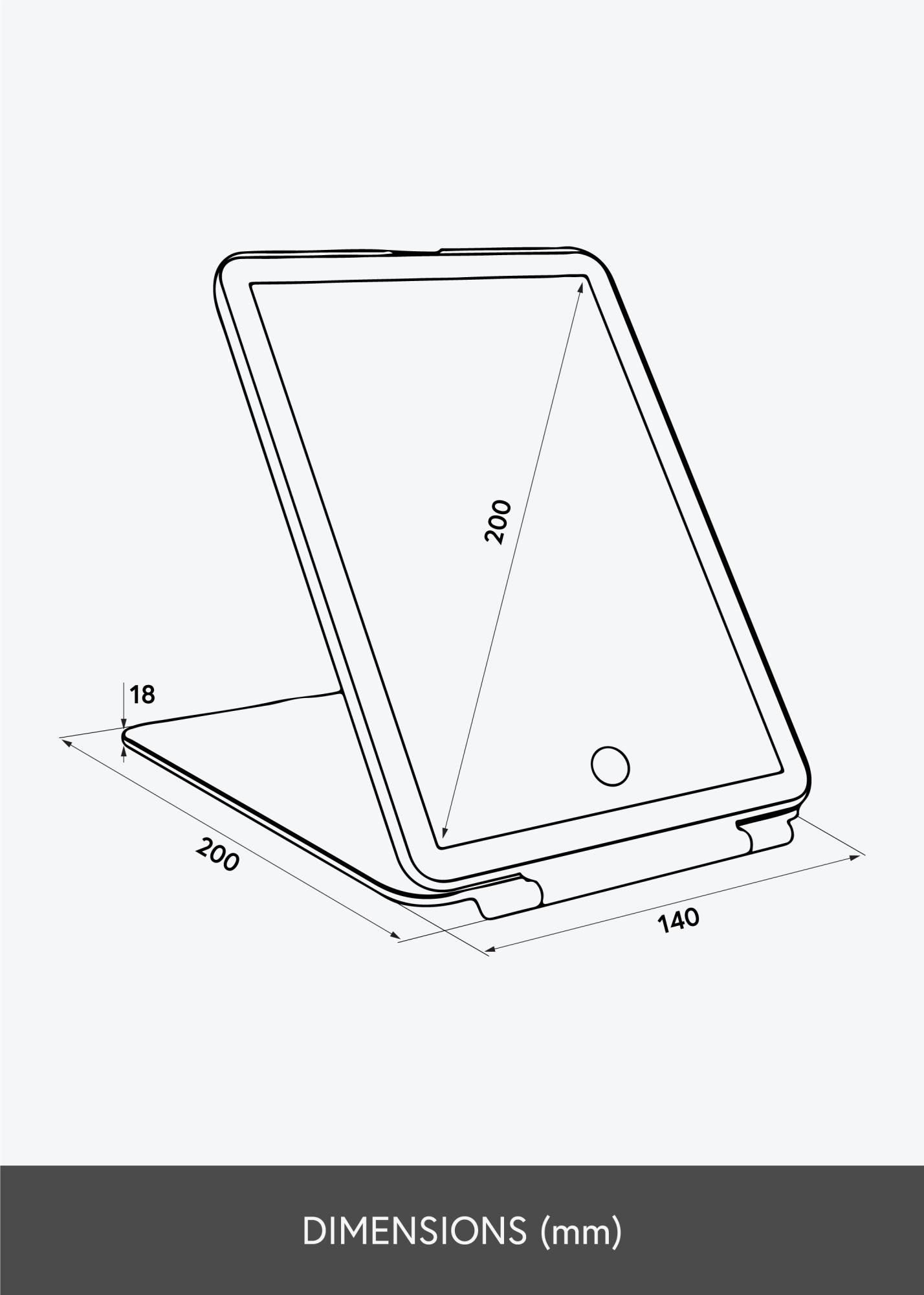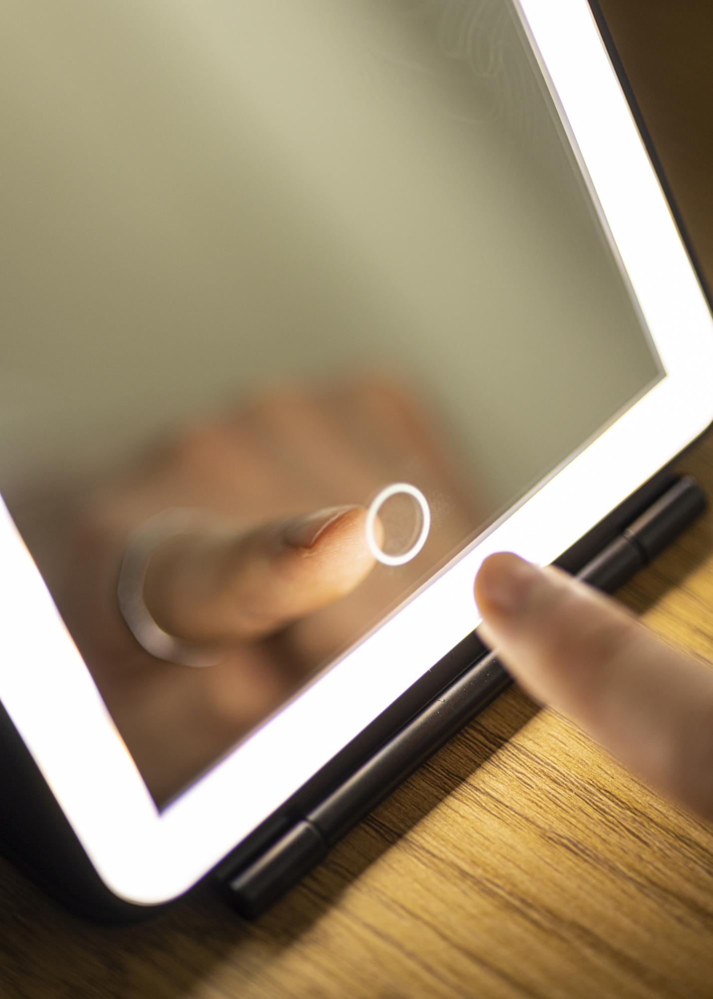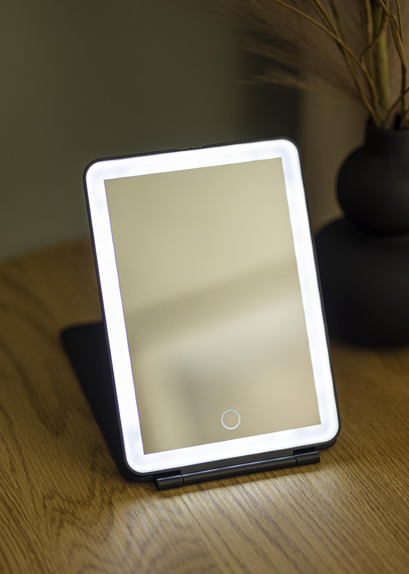 Este espelho numa cor preta elegante e é dobrável, o que economiza espaço e protege a superfície do espelho de arranhões quando o guarda na mala. No modo aberto, pode ajustar o ângulo do espelho. Na superfície do espelho, há um botão tátil que liga e desliga a iluminação do espelho. Se mantiver o botão pressionado por alguns segundos, também pode ajustar as configurações de luz. Pode então diminuir a intensidade da luz e ajustar a temperatura de cor.
