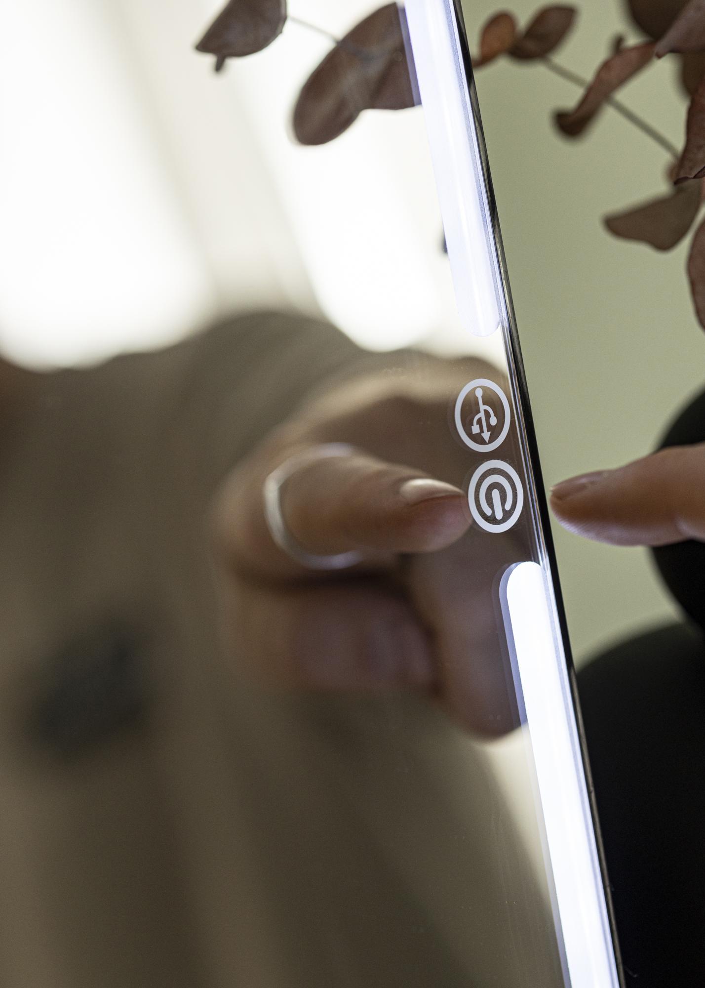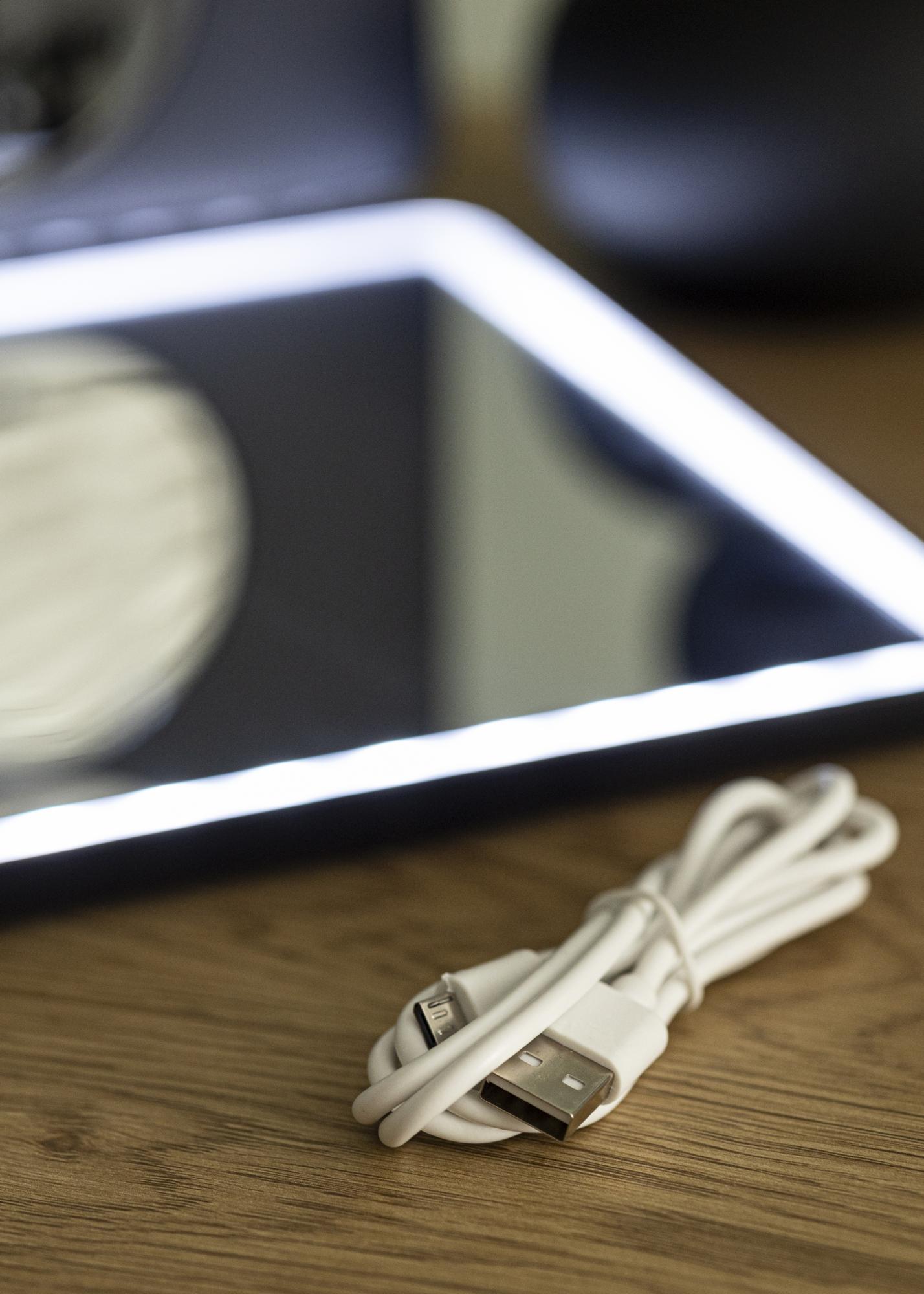 Este espelho para toucador numa cor preta elegante e iluminação LED integrada. A iluminação é ajustada usando os botões de toque na moldura do espelho, com os quais também liga e desliga o espelho. Se fechar o espelho quando estiver ligado, ele entrará automaticamente no modo de economia de energia e voltará a acender quando abrir o espelho novamente. O espelho funciona com bateria e é carregado através de uma conexão USB.