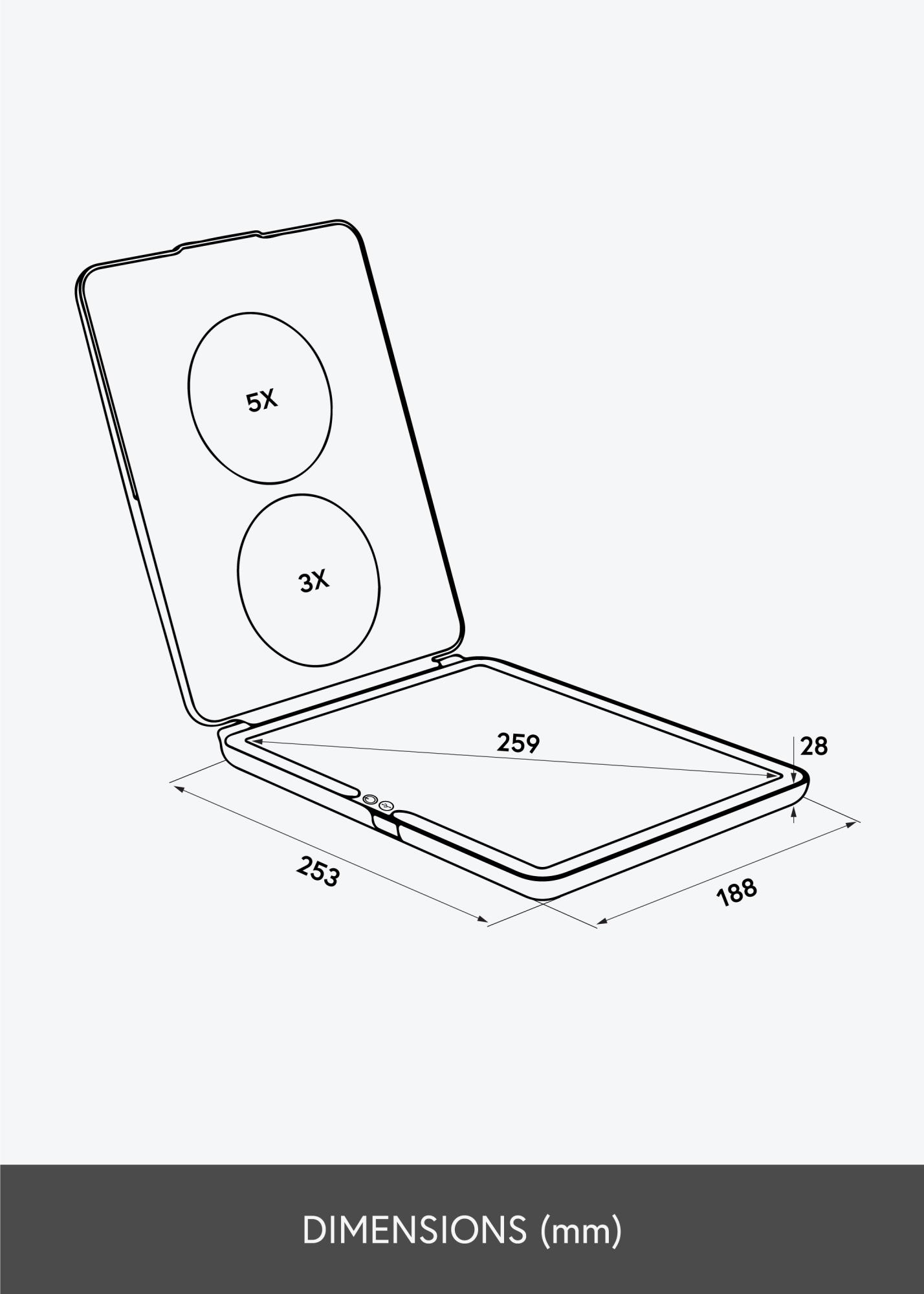 Você quer um espelho para toucador compacto para viagem que se encaixe perfeitamente na sua bolsa? Então este espelho para toucador compacto é uma ótima escolha! O espelho tem uma superfície de espelho de 18,5x25 cm e um design dobrável que protege o espelho da sujeira e poeira. O design dobrável também permite que ajuste o ângulo do espelho durante o uso. Além do vidro do espelho comum, o espelho possui uma zona de ampliação de 5x e uma zona de ampliação de 3x.