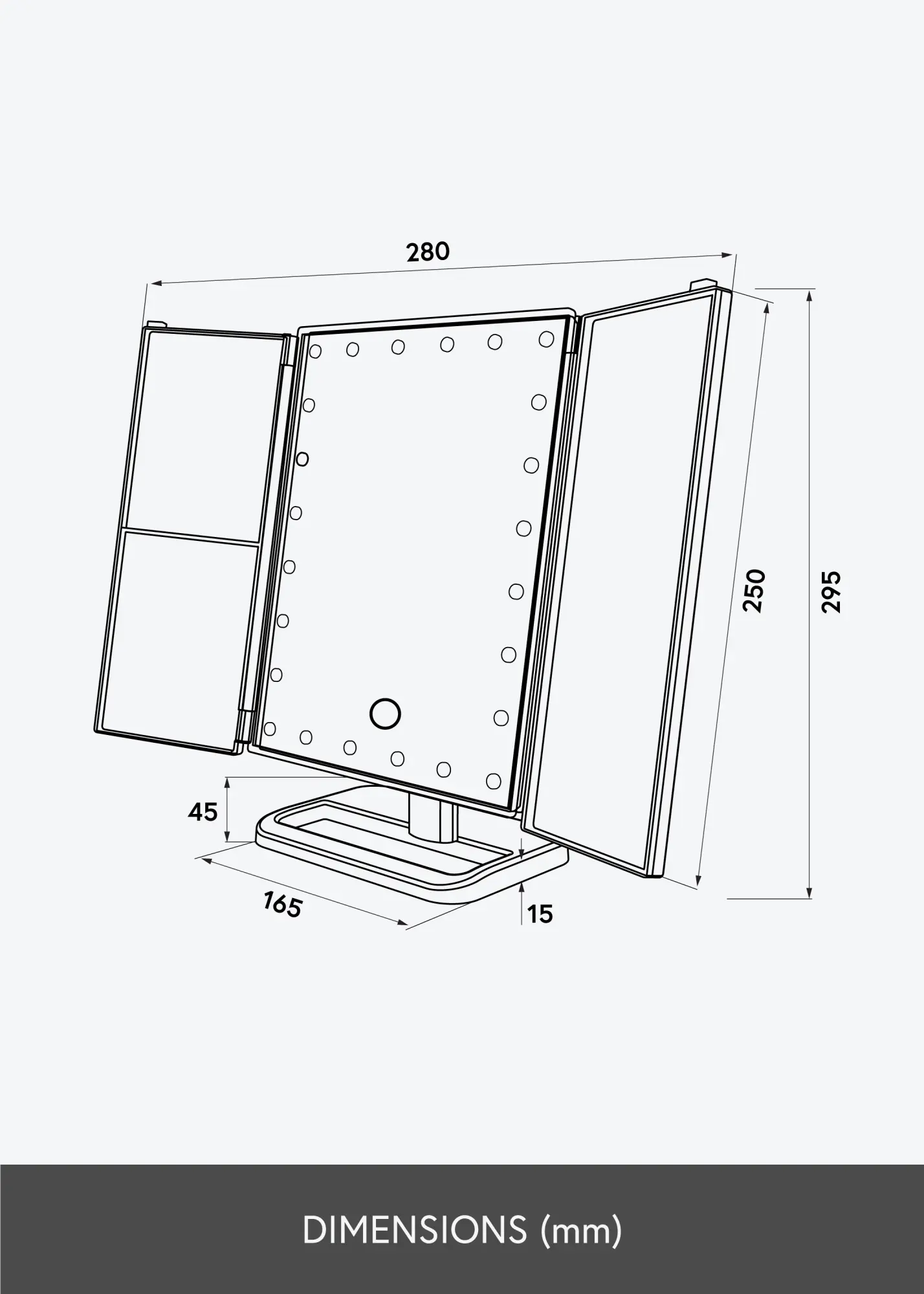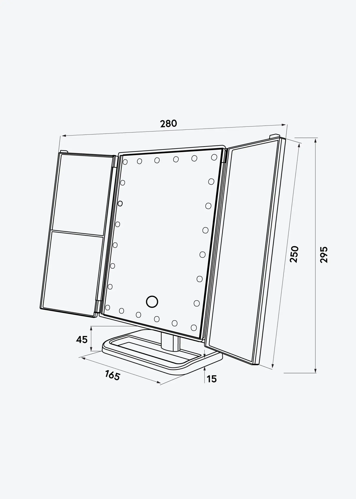 O espelho tem um design inteligente com laterais dobráveis. Dessa forma, pode facilmente ajustar o ângulo do espelho, o que facilita a aplicação de maquilhagem, por exemplo. A grande superfície do espelho é feita de vidro de espelho comum, e os espelhos mais pequenos nas laterais têm zoom de 2x, 3x e 10x. Isso é útil quando deseja ver uma parte do rosto em detalhes.