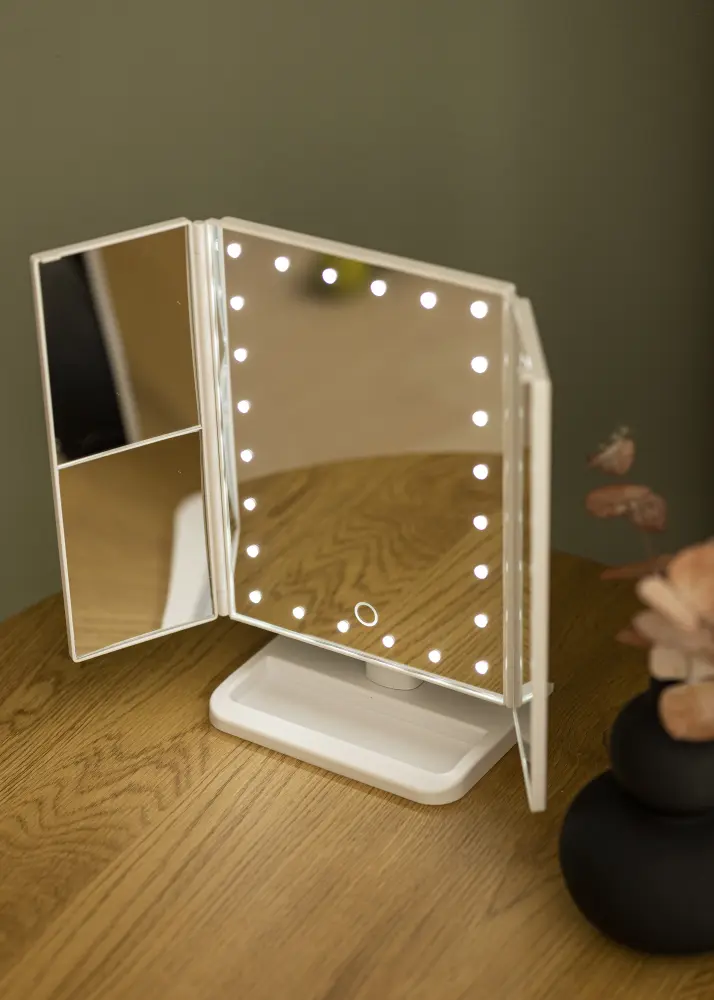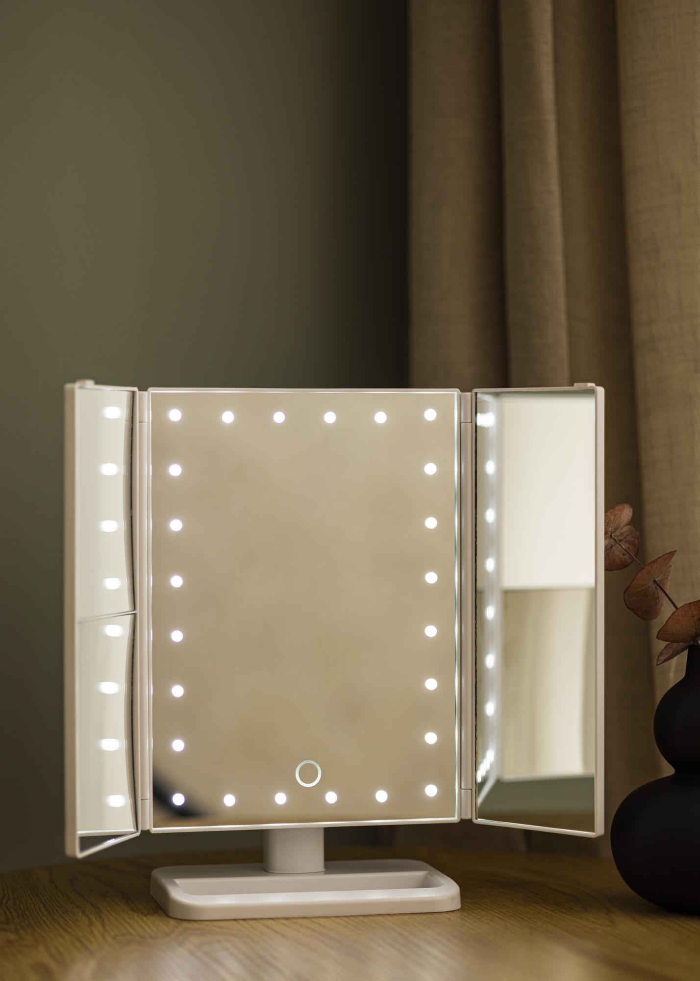 Esta é uma maquilhagem portátil com recursos inteligentes que oferece grande flexibilidade de uso. Além disso, é bonito deixá-lo exposto! O espelho tem quatro superfícies espelhadas e iluminação LED que enquadra a superfície central do espelho. Se segurar o botão tátil na frente do espelho por alguns segundos, poderá ajustar a intensidade da iluminação. O espelho para toucador é conectado a uma porta USB com o cabo USB fornecido. Se quiser usar seu espelho quando estiver em movimento, ele também pode ser alimentado por 4 pilhas AA, que não estão incluídas.