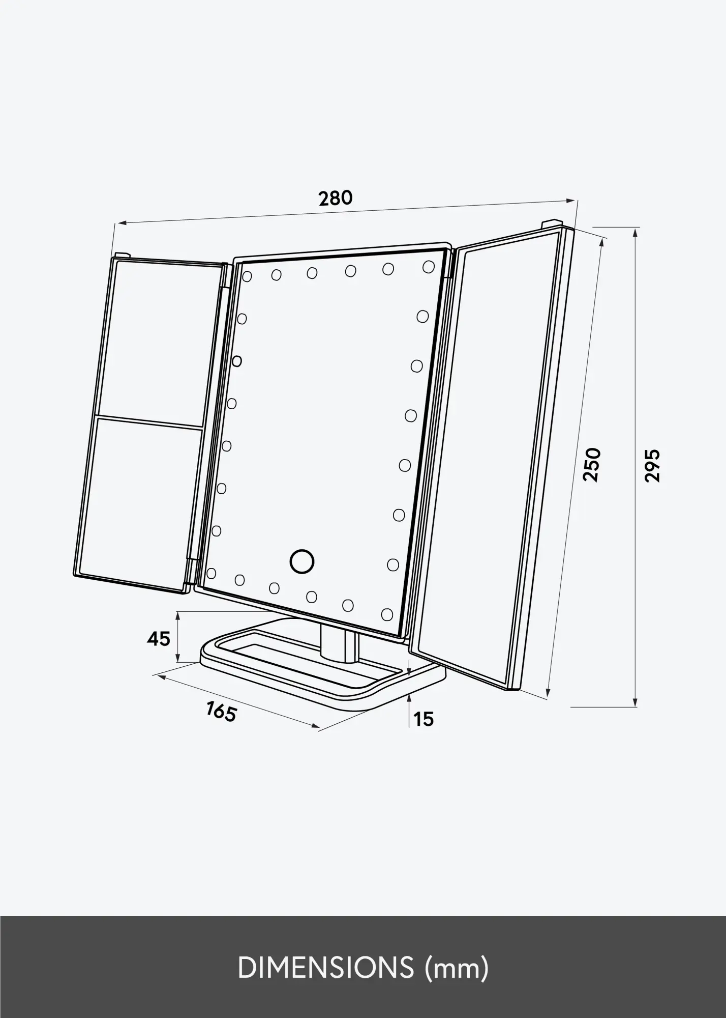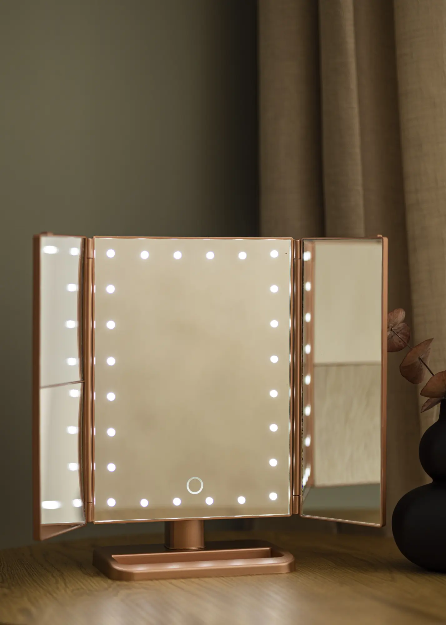 O espelho tem um design vertical e um tom moderno de ouro rosado. As laterais do espelho podem ser dobradas, o que permite que ajuste facilmente as laterais durante o uso. Para que possa concentrar-se melhor ao aplicar a sua maquilhagem, o espelho possui zoom de 2x, 3x e 10x. As zonas com função de zoom estão localizadas nas pequenas áreas do espelho nas laterais.