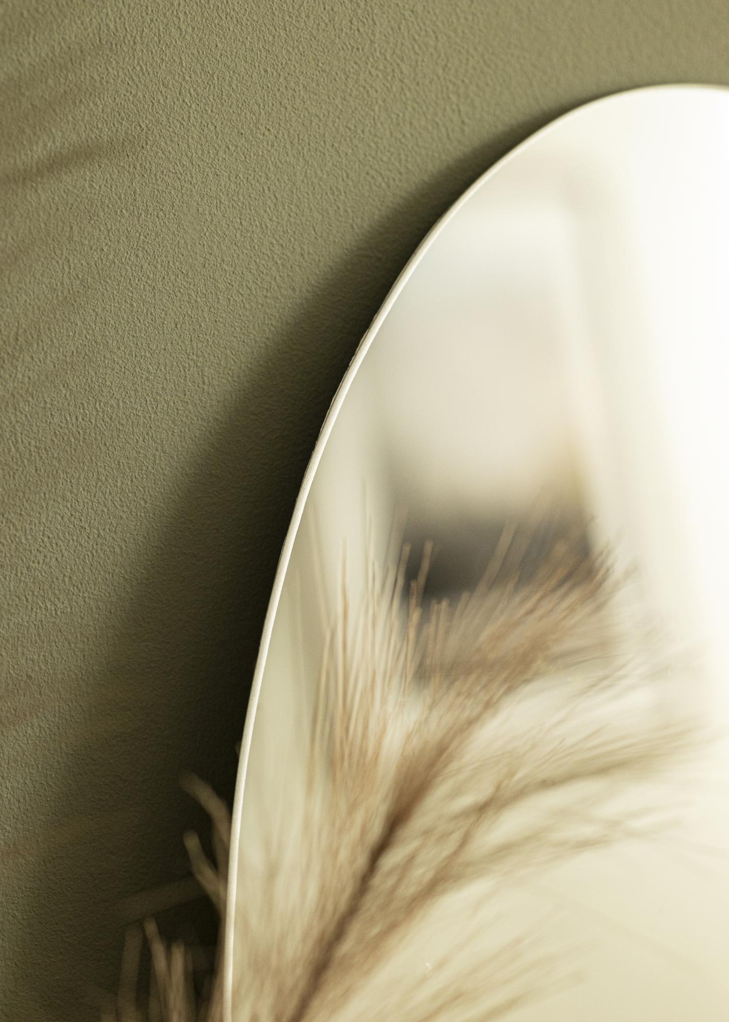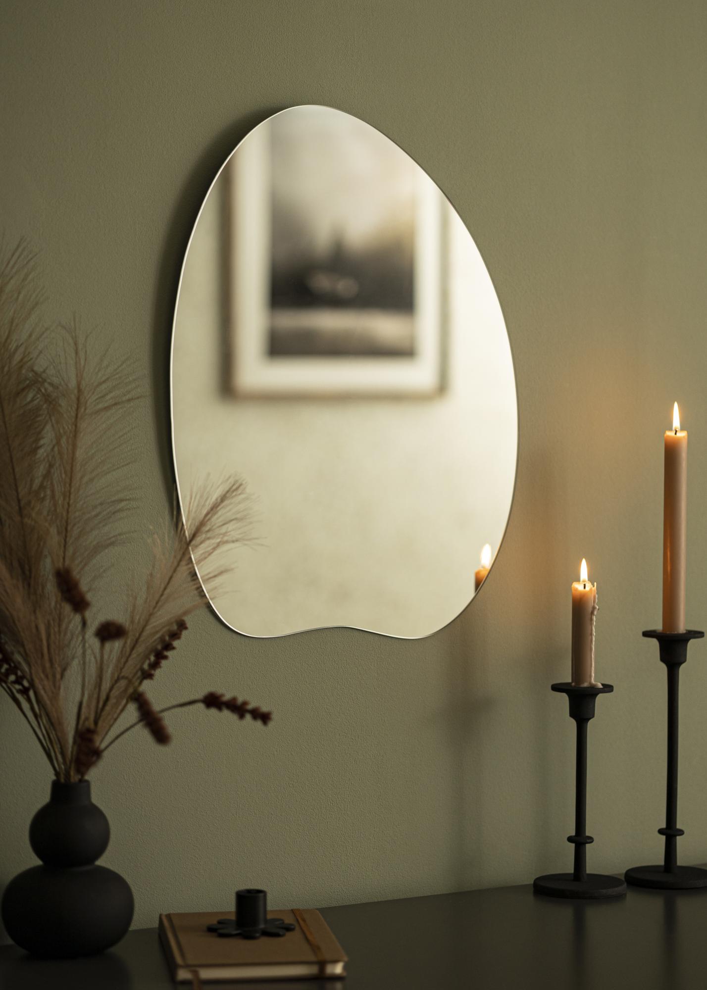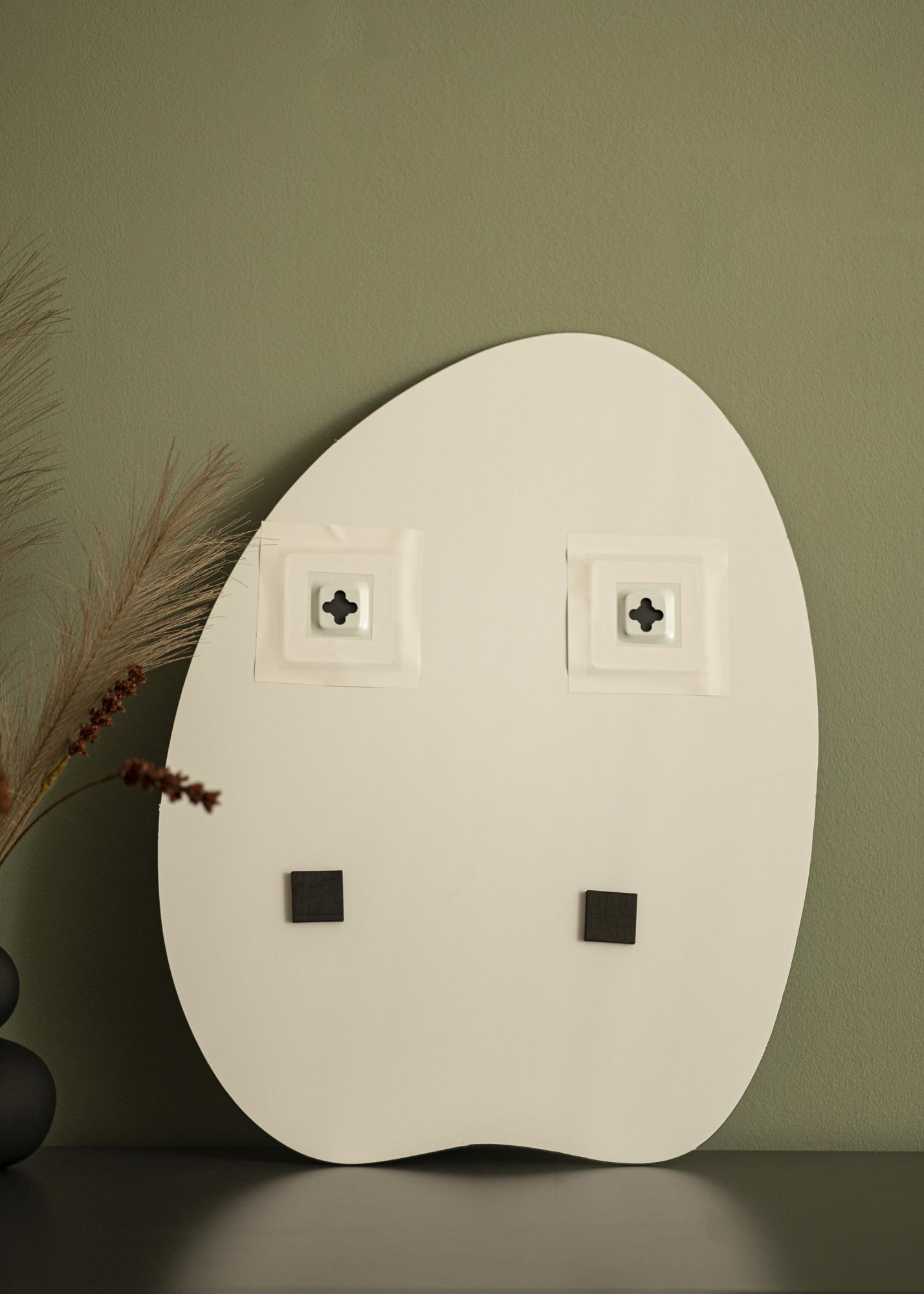 Se está à procura de um espelho de parede em uma forma emocionante, este é o espelho para si. O design único, com uma forma arredondada e uma borda inferior levemente ondulada, é perfeitamente combinado com o vidro fino do espelho de 4 mm. O espelho não tem moldura, o que dá um aspecto minimalista. Graças aos suportes de parede inteligentes na parte de trás, pode facilmente pendurar o espelho na parede na posição vertical.