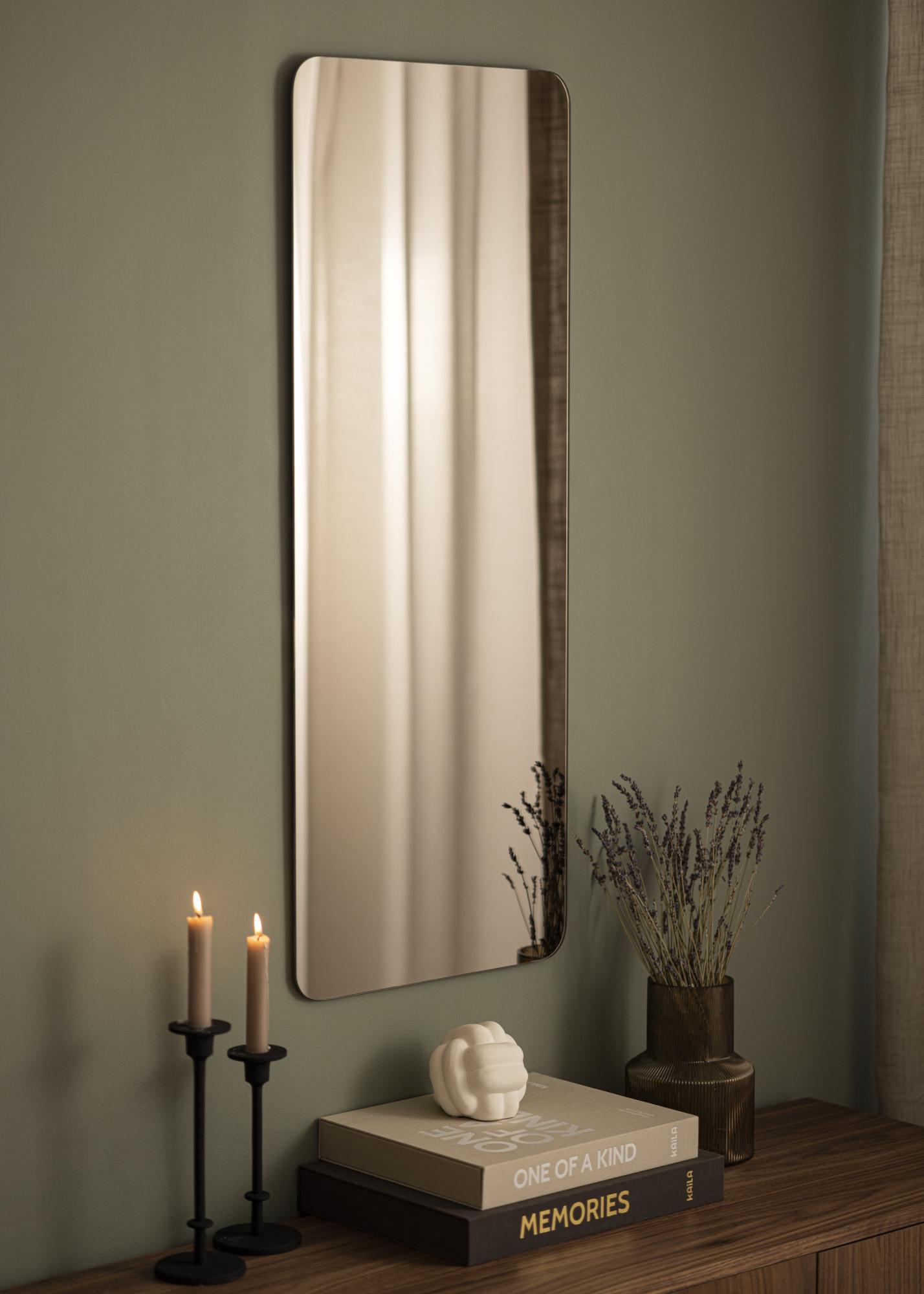 Este é um espelho retangular com cantos arredondados decorativos que confere-lhem uma aparência suave e elegante. O vidro do espelho é tonalizado em um tom elegante de bronze escuro, tornando este espelho um detalhe de decoração impactante e moderno para a sua casa. Além disso, o espelho é muito fino e não possui moldura, o que contribui ainda mais para a sua sensação elegante e limpa.
