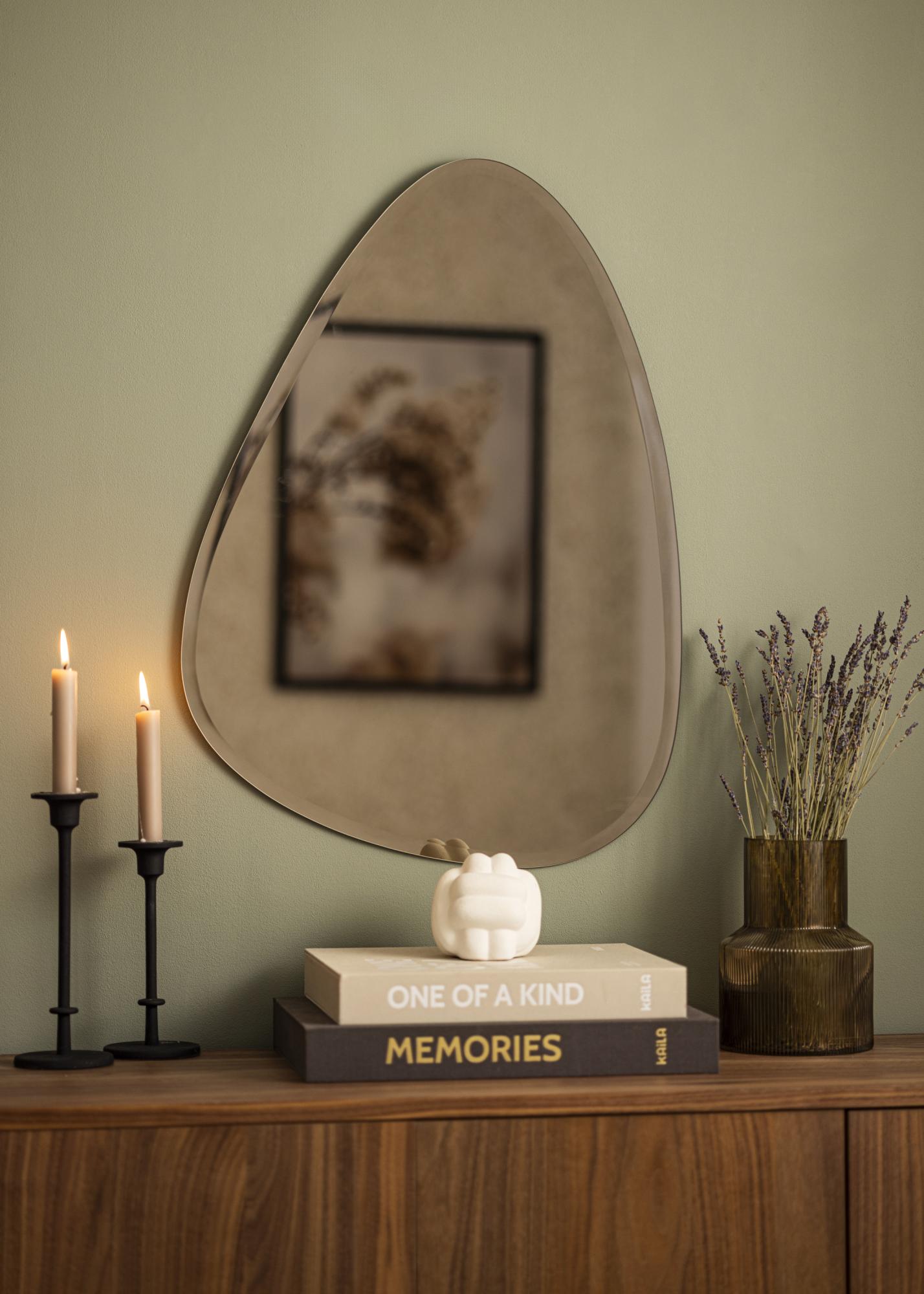 Este é um espelho de parede assimétrico da KAILA, com um vidro de espelho em tom de bronze moderno. Um espelho com vidro de espelho mais escuro se torna um detalhe llamativo que encaixa-se perfeitamente em casas modernas. O espelho fino não tem moldura. Em vez disso, as bordas da superfície do espelho são adornadas com uma borda elegante facetada.
