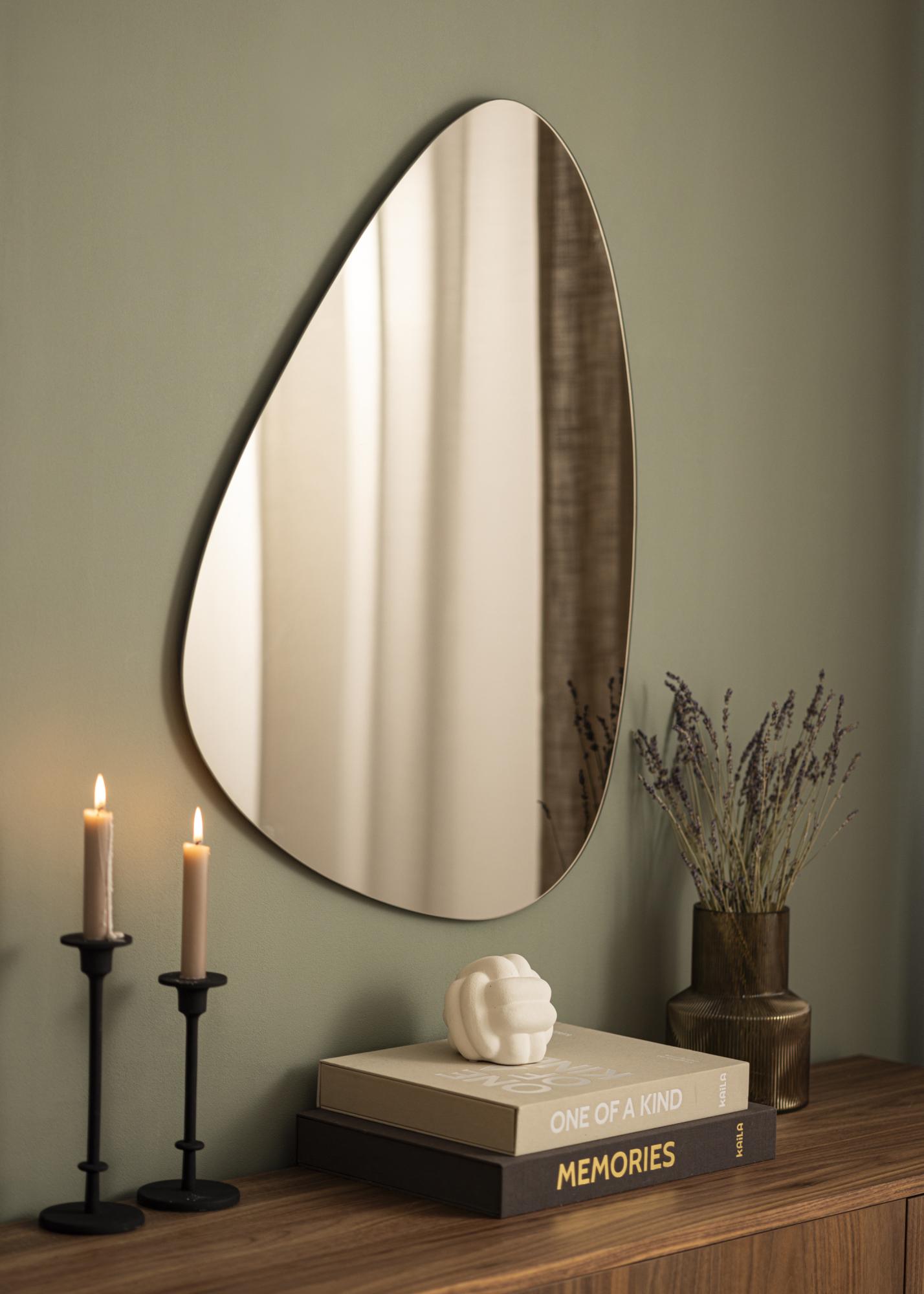 Este espelho assimétrico torna-se um detalhe de decoração elegante e moderno na sua casa! Além do interessante design em forma de ovo, este espelho também possui um vidro espelhado em tom de bronze elegante, que reforça ainda mais a aparência moderna e harmoniza lindamente com várias paletas de cores. A forma suave, combinada com o facto de o espelho ser muito fino e não ter moldura, confere-lhe uma sensação rara de elegância e delicadeza. Perfeito como decoração de parede funcional e moderna na sala de estar, corredor ou quarto.