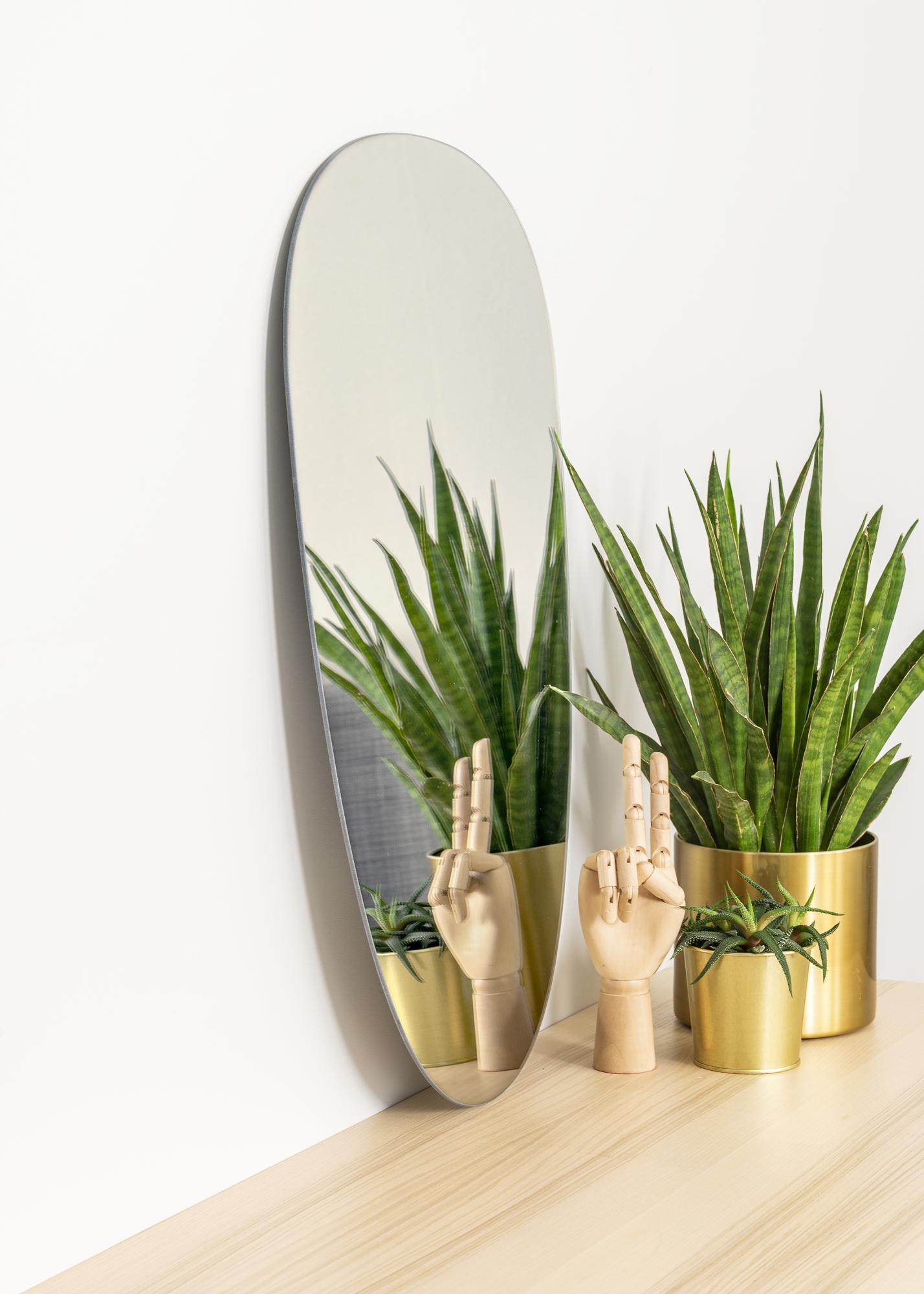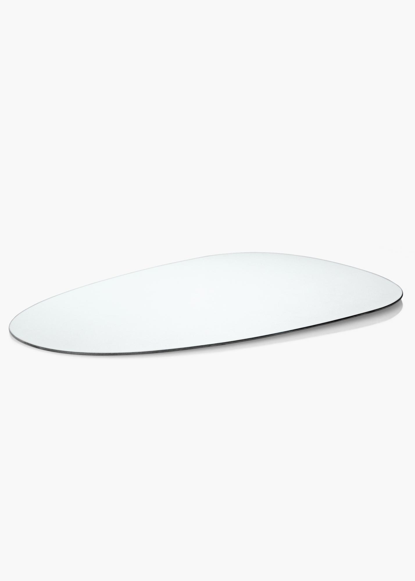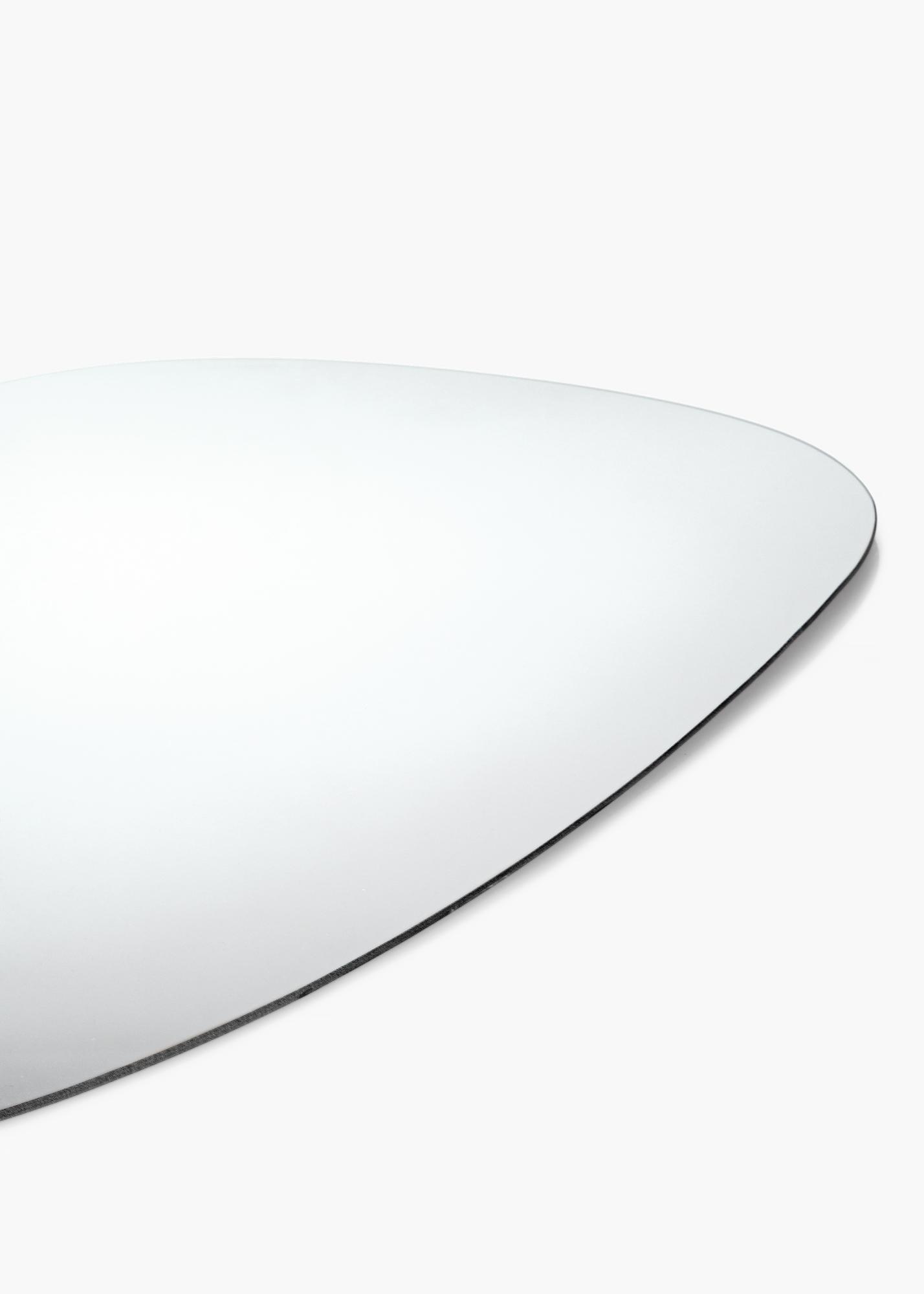 Um espelho elegante e interessante como este torna-se um elemento moderno na decoração da sua casa! O espelho tem uma forma suave e assimétrica que pode ser descrita como oval desigual. Além disso, o espelho é muito fino e não tem moldura, o que reforça ainda mais a sua elegância.