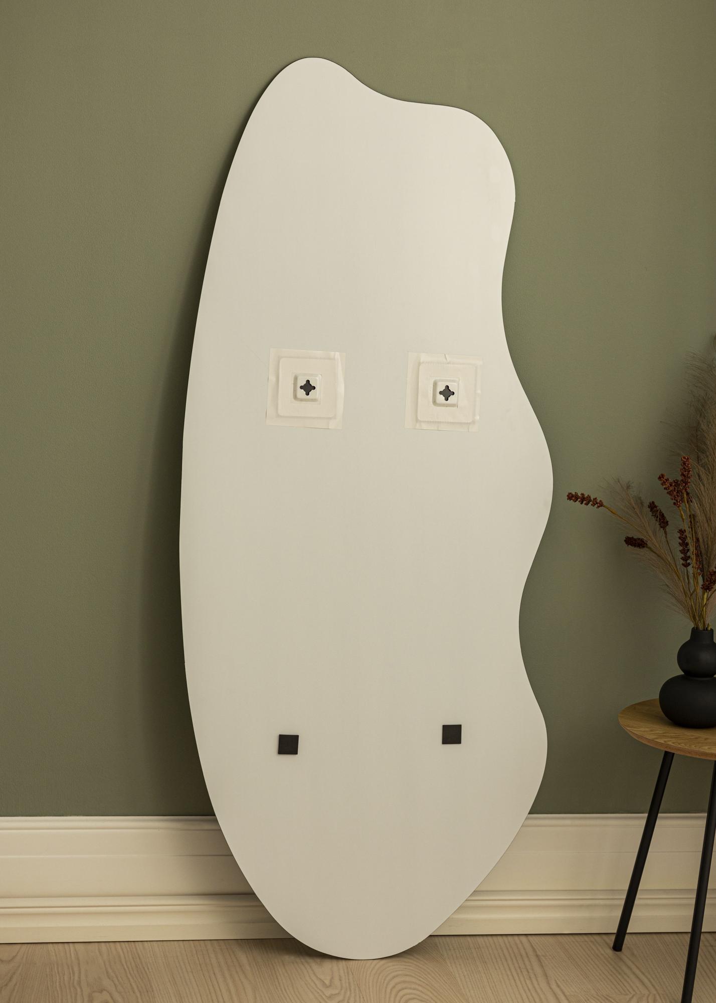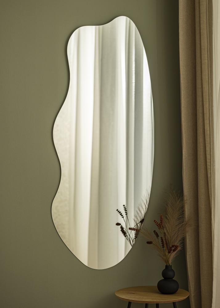 Um espelho de parede assimétrico se torna um detalhe de decoração chamativo em qualquer casa. Este espelho tem uma forma única, onde um lado é arredondado e o outro tem uma forma ondulada. Juntos, eles formam uma totalidade emocionante e elegante. O espelho se encaixa tão bem no corredor quanto na sala de estar e também funciona como um espelho de casa de banho moderno.