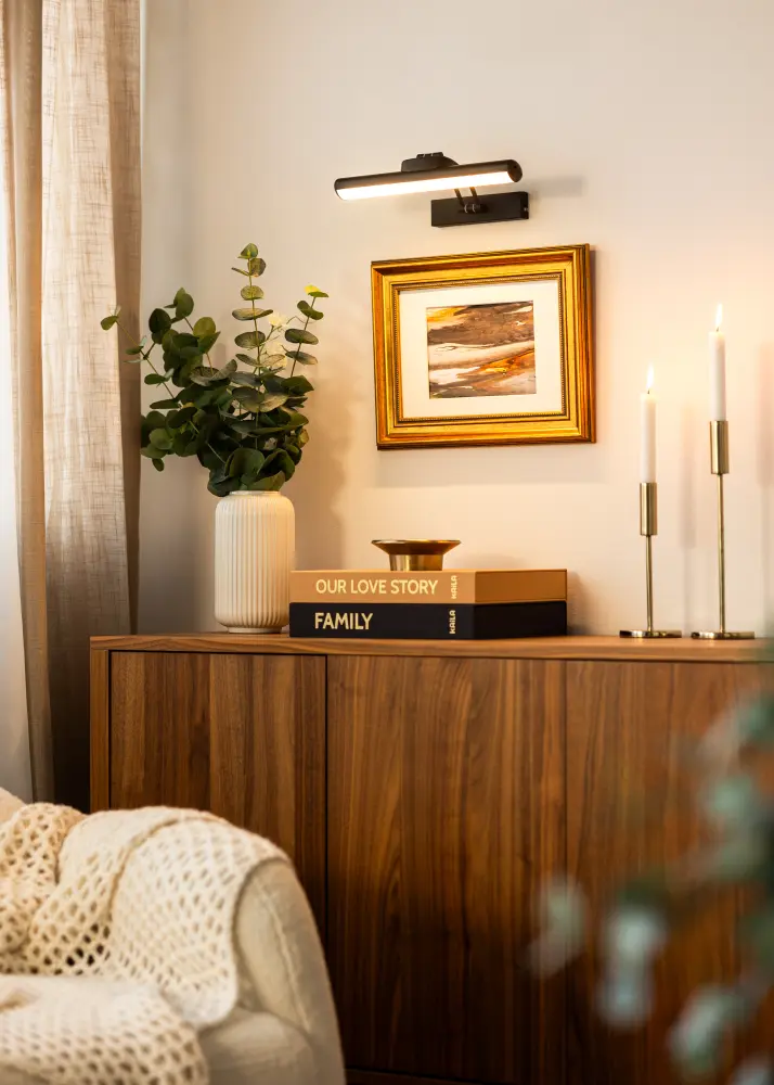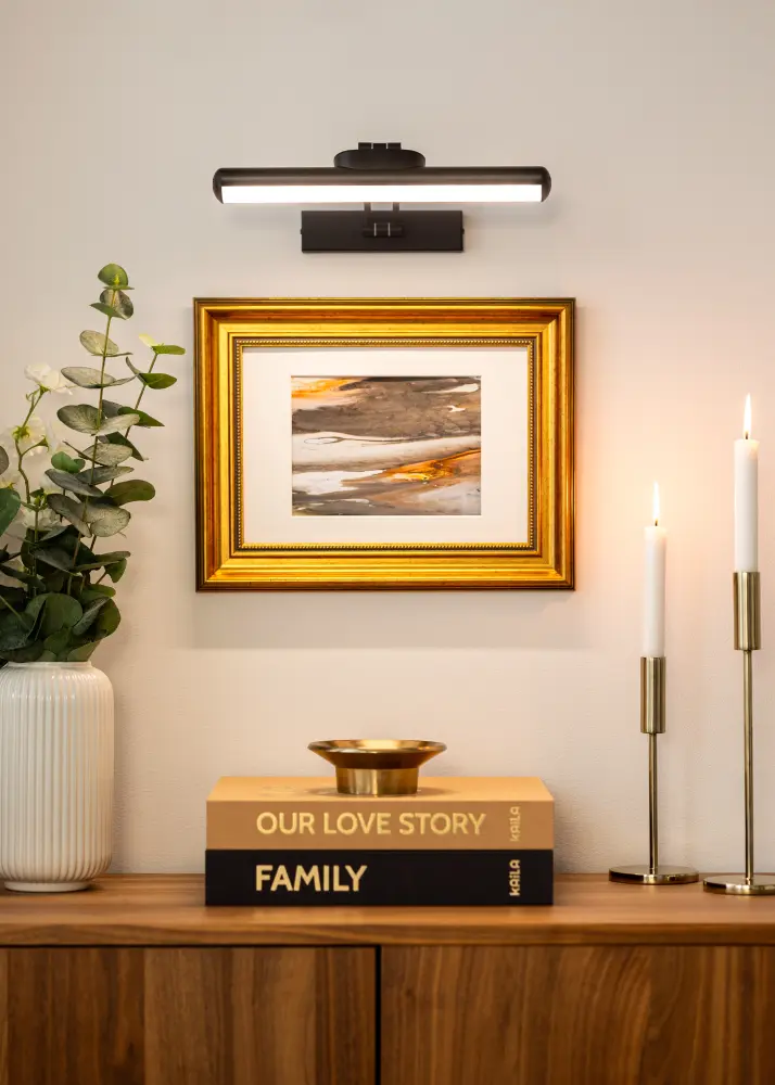 KAILA Gleam é uma iluminação de quadro elegante e alimentada por bateria em preto – perfeita para destacar suas obras de arte sem a complicação de cabos. O design sem fio torna fácil colocar a lâmpada onde você quiser, sem a necessidade de levar em conta as tomadas elétricas. O acabamento preto elegante proporciona uma expressão moderna e sofisticada, enquanto a luz integrada ilumina sua pintura de maneira uniforme e agradável. Fácil de montar e usar – uma solução prática e estilosa para a sua arte de parede.