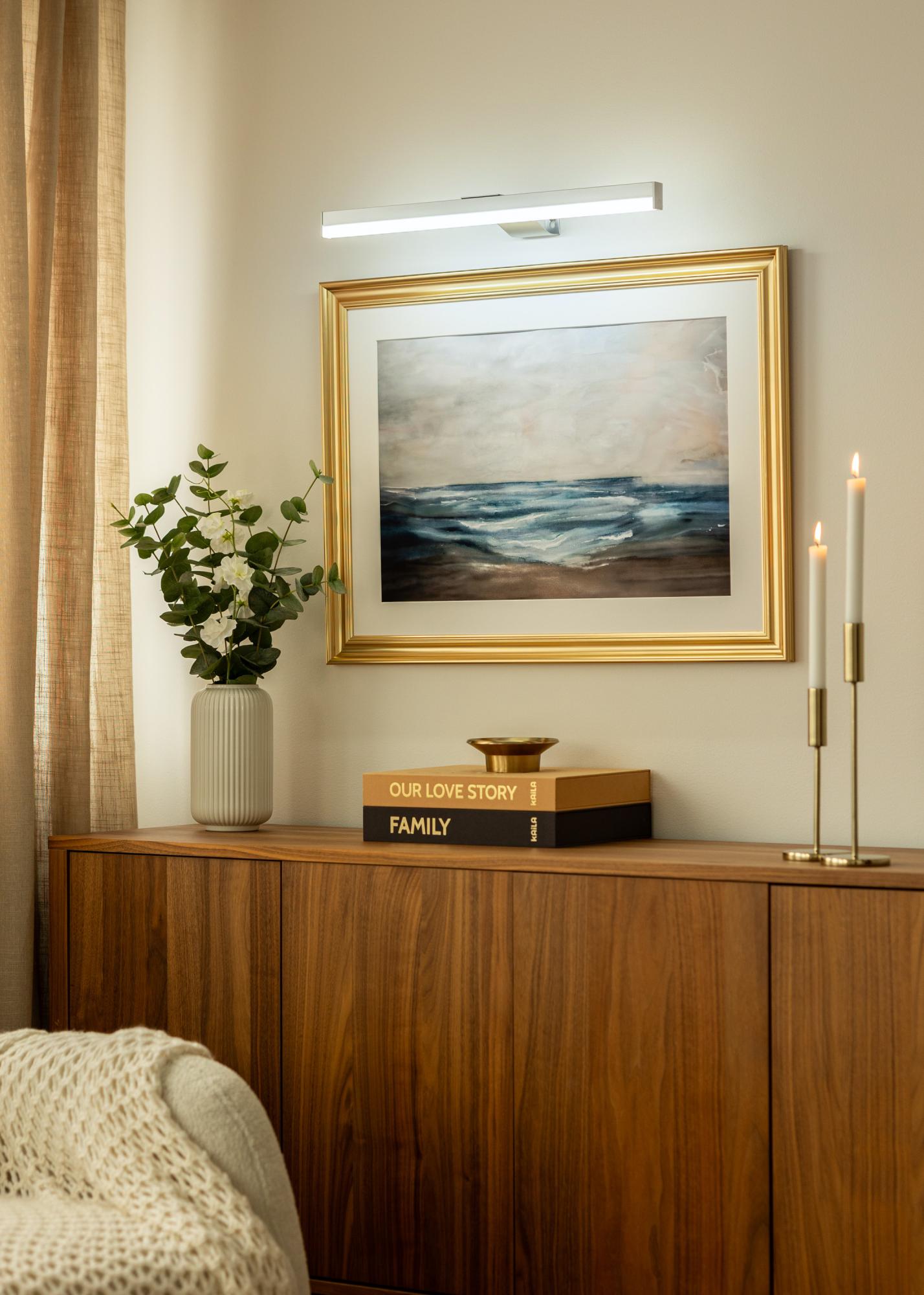 A iluminação possui temperatura de cor ajustável entre 3000K, 4000K e 6000K, permitindo escolher entre luz quente, neutra e fria para realçar suas obras de arte da melhor maneira. A fonte de luz LED integrada oferece um fluxo luminoso de 262–300 lúmens, suficiente para iluminar detalhes sem ser avassalador. Além disso, a lâmpada é energeticamente eficiente e tem uma longa vida útil graças à tecnologia LED.