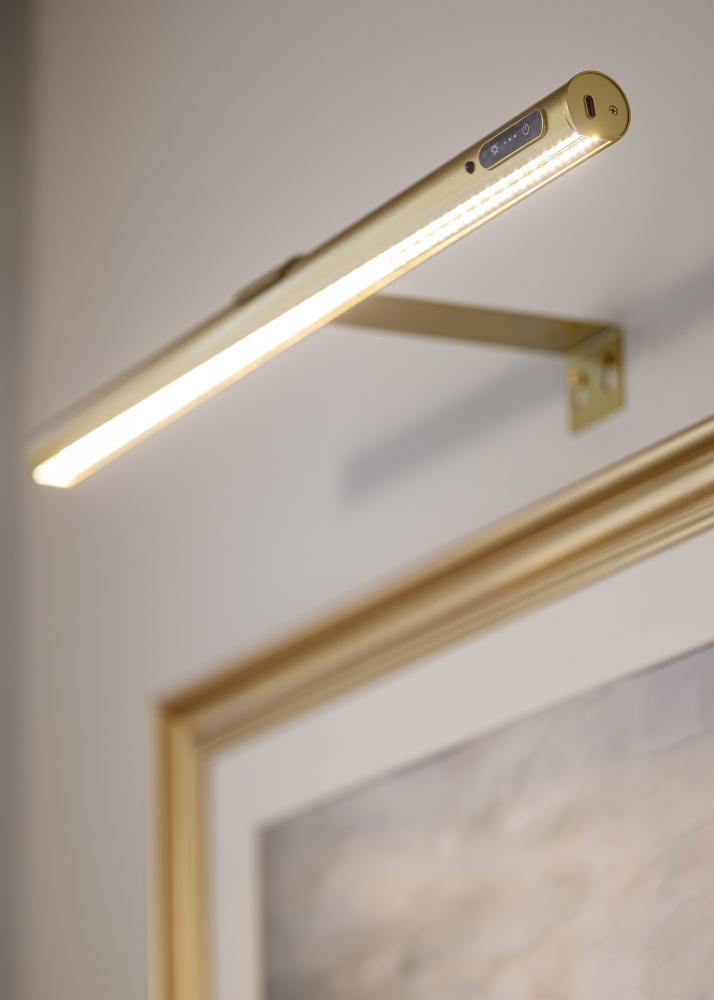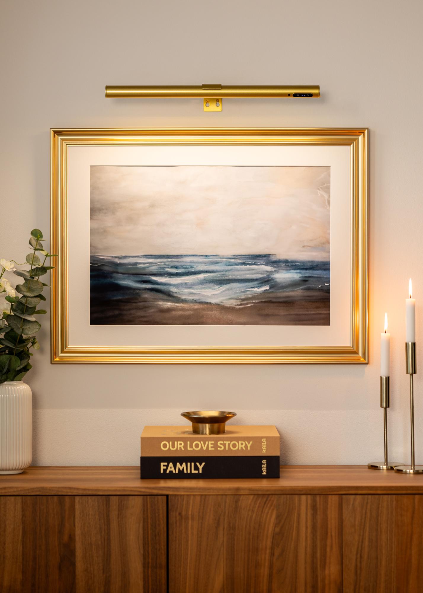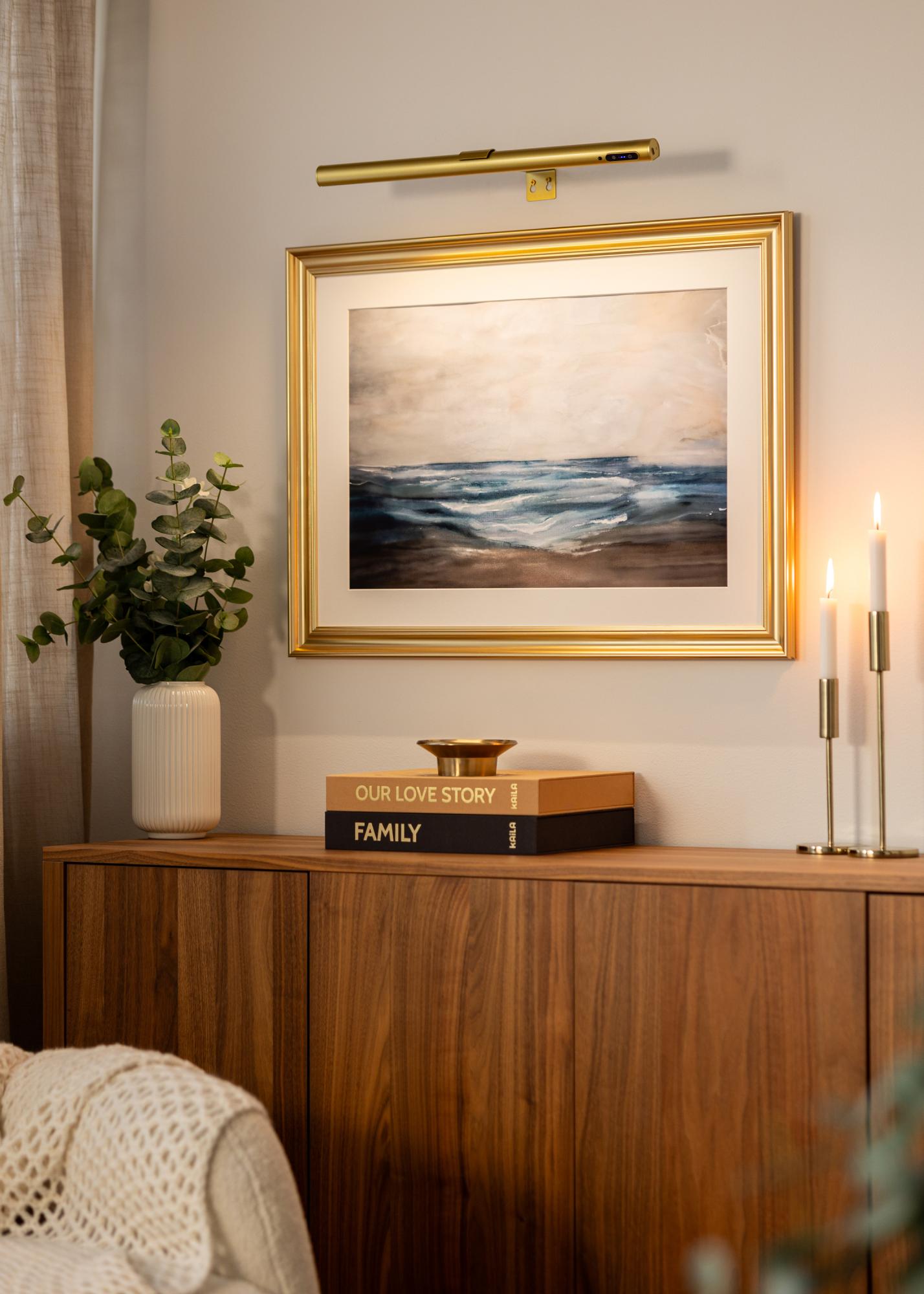 KAILA Halo é uma iluminação de quadro elegante e alimentada por bateria em ouro, perfeita para iluminar suas obras de arte sem cabos inconvenientes. Graças ao design sem fio, você pode colocá-la em qualquer lugar sem precisar se preocupar com tomadas elétricas. O acabamento dourado elegante oferece uma expressão exclusiva, enquanto a luz é distribuída uniformemente para destacar detalhes e cores de maneira bonita. Fácil de montar e conveniente de usar – uma solução prática para dar às suas pinturas a atenção que merecem.