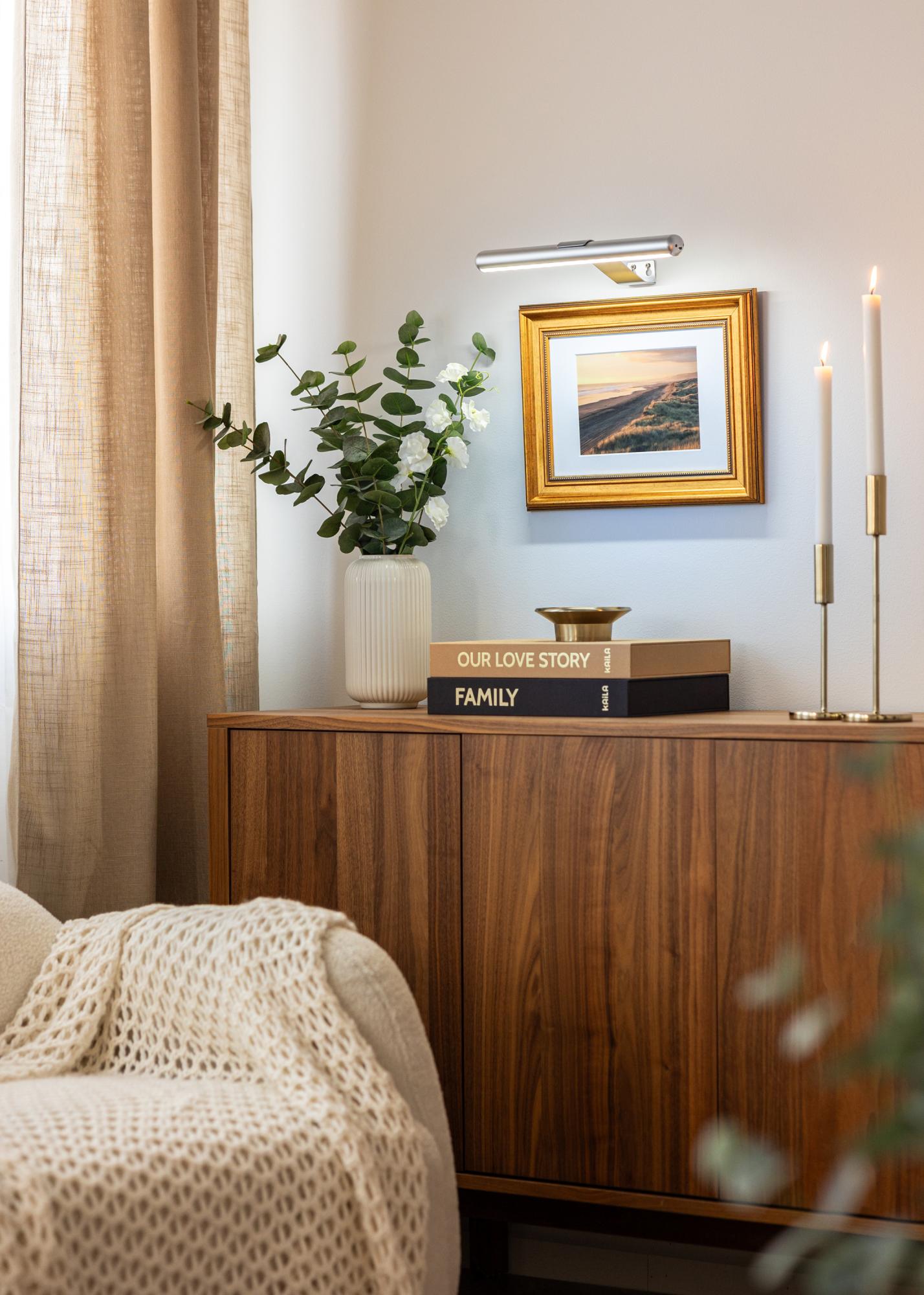 Esta iluminação de quadro movida a bateria em prata é uma solução prática e esteticamente atraente para iluminar suas obras de arte sem a complicação dos fios. Graças ao seu design movido a bateria, você pode colocá-la onde quiser, independente de tomadas elétricas. Com uma profundidade de 15 cm e um comprimento de 33 cm, é discreta e eficaz quando se trata de destacar obras de arte com uma largura máxima de até 60 cm.