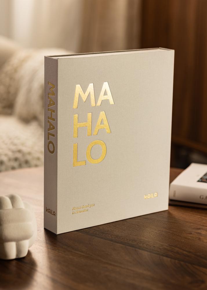 Com este Coffee Table Book, terá um álbum de fotos prático e um belo detalhe de decoração, tudo em um único pacote! O álbum é desenhado como uma caixa exclusiva, com uma capa em tecido cinzento e uma impressão dourada que diz "MAHALO". No canto esquerdo do álbum, há o subtítulo "Significa obrigado em havaiano". A expressão clássica faz com que este Coffee Table Album seja perfeito para a estante de livros ou para a mesa de sala de estar.