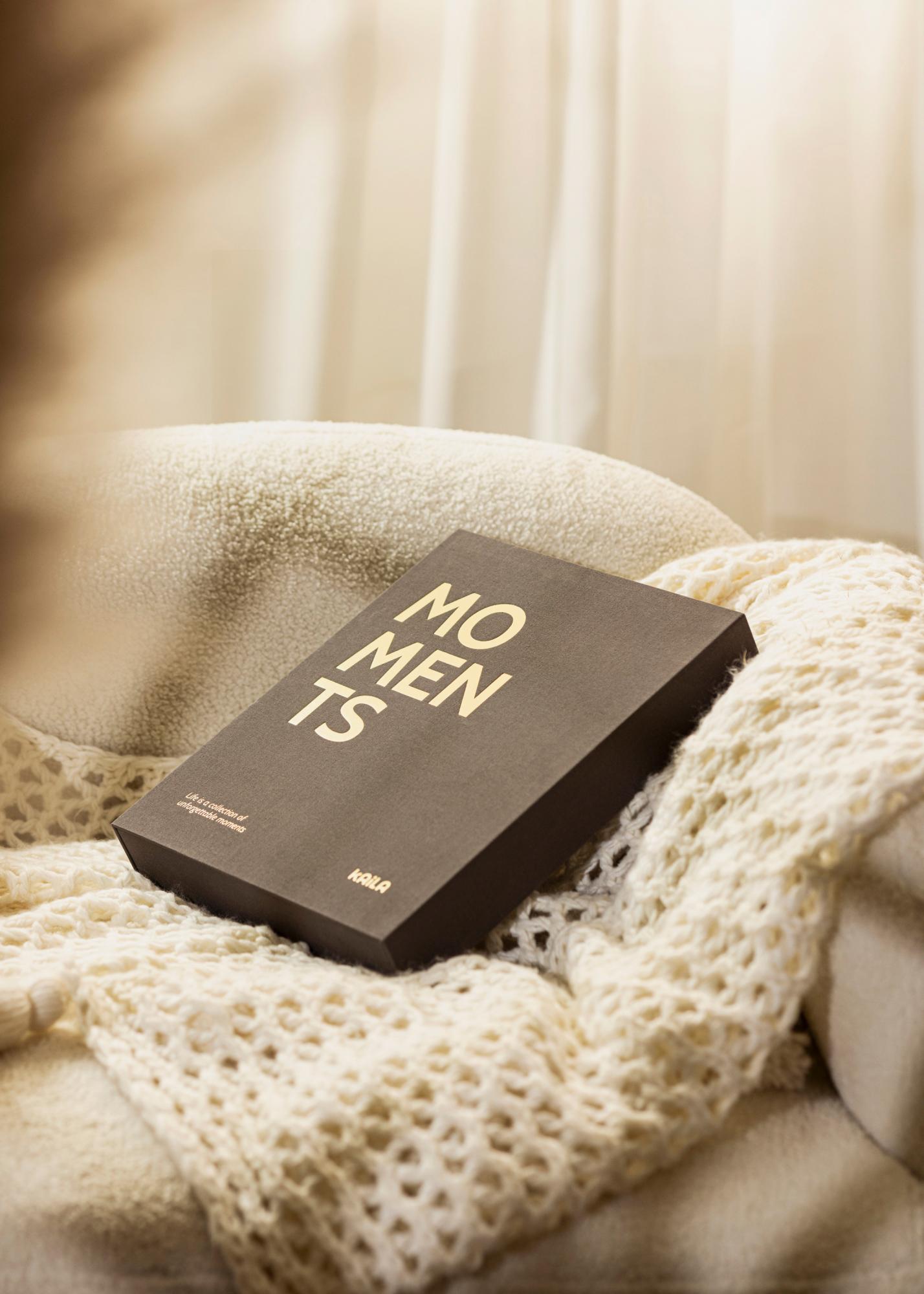 O álbum de fotos é desenhado como uma caixa que pode abrir para acessar suas imagens. A capa é adornada com tecido preto, o que proporciona uma sensação de luxo. Na frente e na lateral, está escrito "MOMENTS". No canto superior esquerdo da parte superior, pode ver o belo subtítulo "A vida é uma coleção de momentos inesquecíveis".